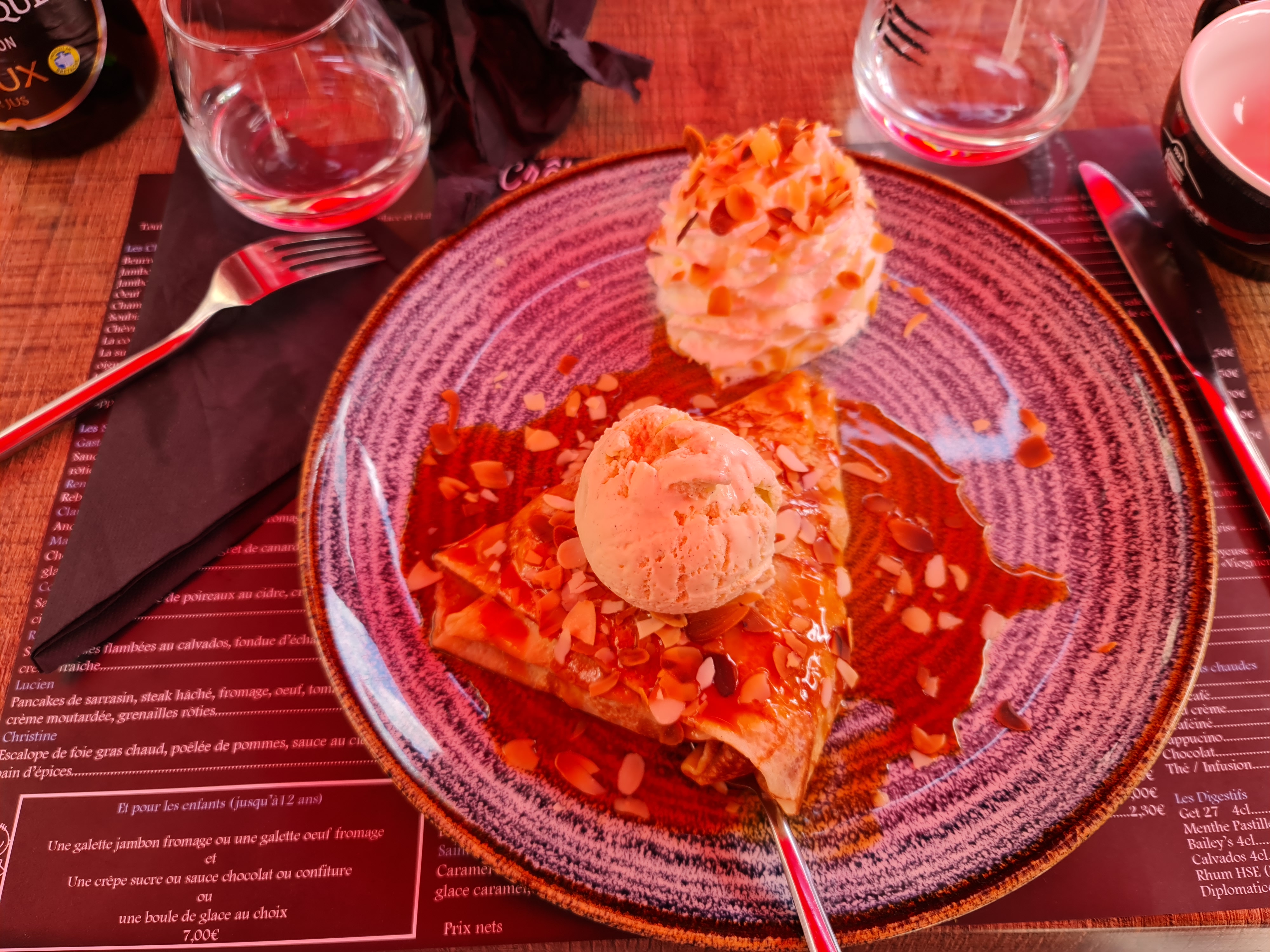 Carte et service au top ! On s'est régalés, deux fois de suite ce week-end. Les galettes spéciales sont très généreuses tant en goût qu'en quantité. Idem pour les crêpes spéciales ! Rien à dire !