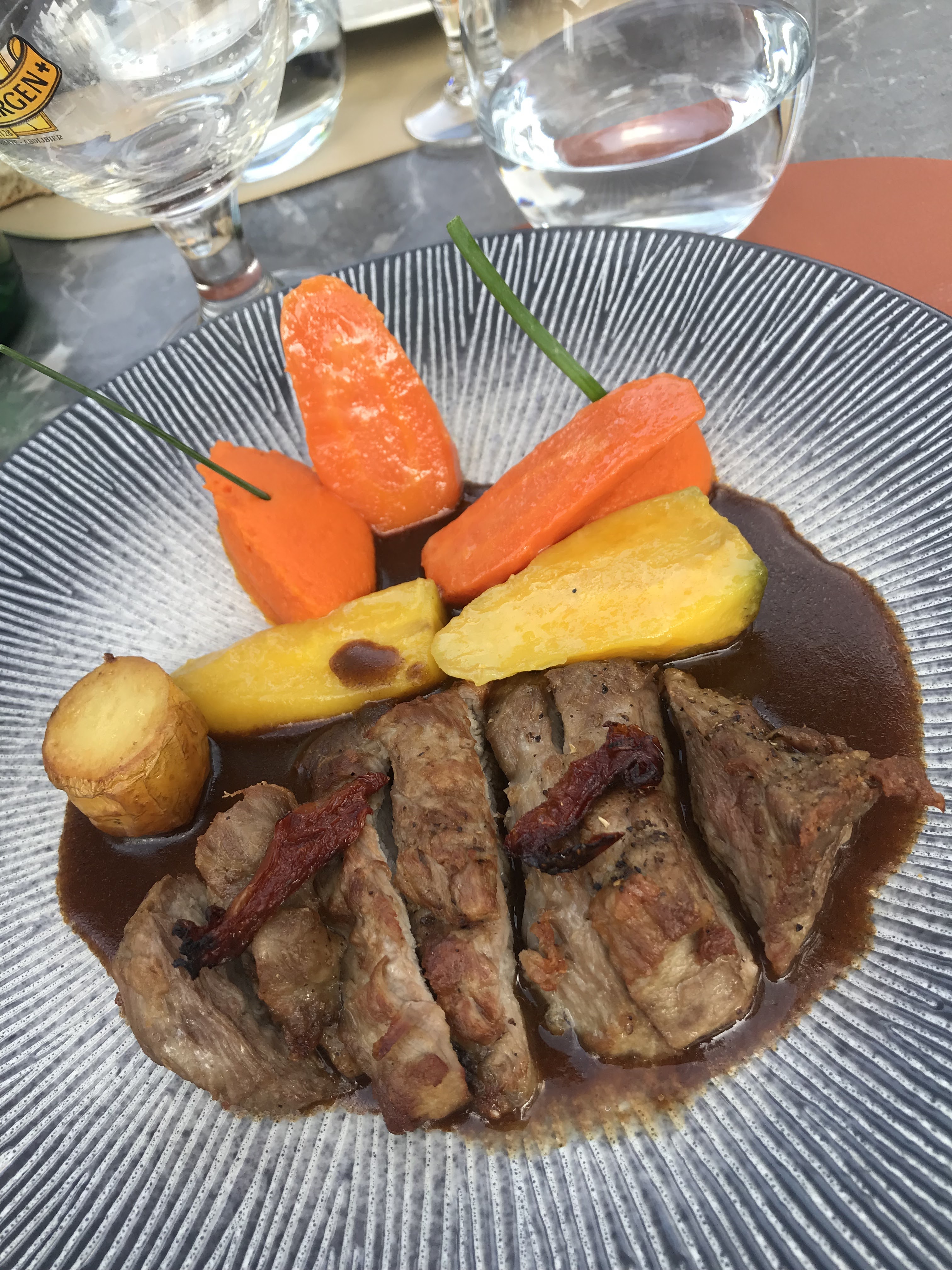 Exorbitant pour la qualité des assiettes : - un onglet ridiculement petit facturé plus de 20€ et pouvant être trouvé n'importe où ailleurs pour une douzaine d'euros. - un plat végétarien à plus de 20€ egalement, sans travail specifique qui se resume a quelques purées de légume - une assiette terre et mer qui ne sont que des produits posés dans une assiette sans geste de cuisine.... Concernant le service nous avons clairement senti que nos bébé n'étaient pas bienvenus Expérience très deceptive vu les prix pratiqués par l'établissement