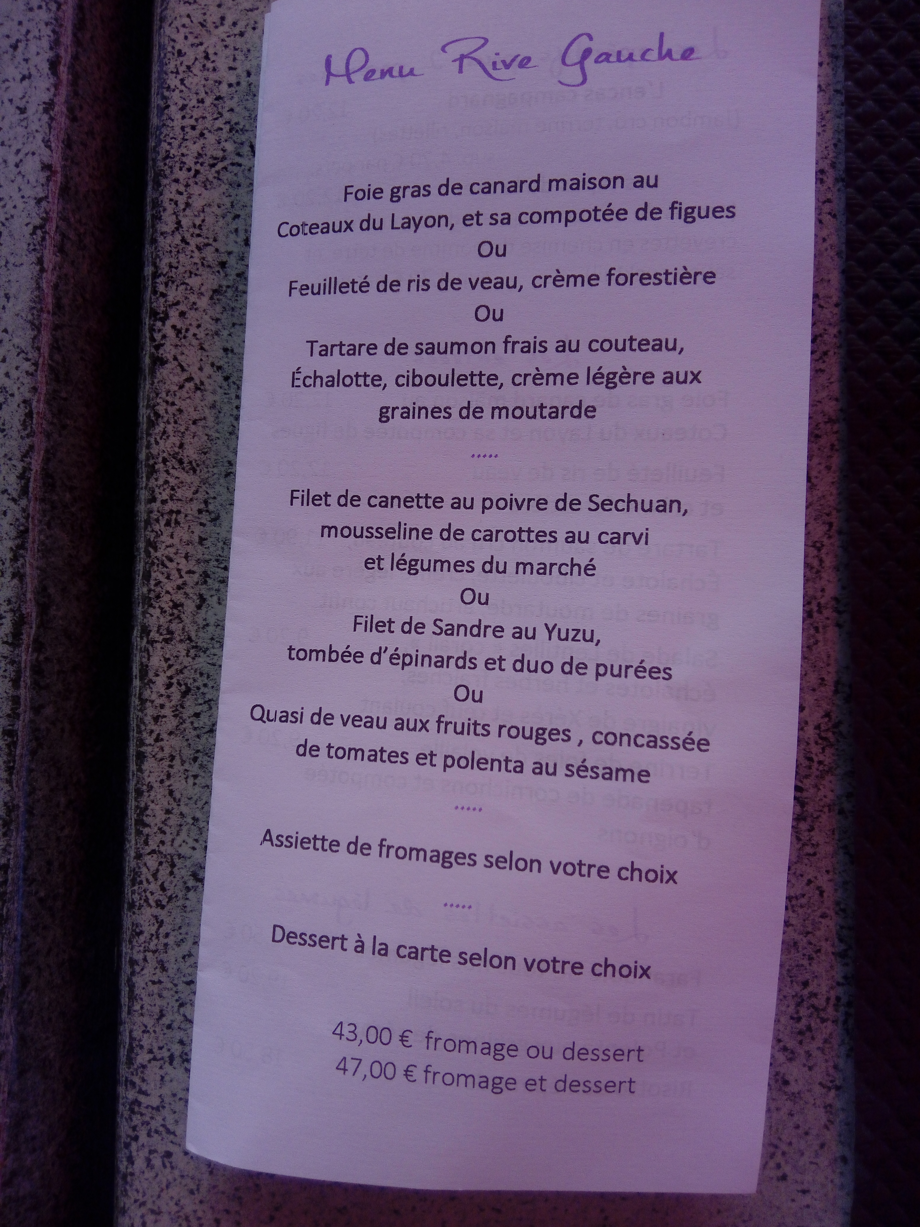 Un dîner à 4 avec les enfants lors de notre séjour à Blois. Menu enfant top (saumon fumé, filet mignon et super dessert) 14€ Nous le menu Rive Gauche super aussi du début à la fin. 37€ Cadre agréable et personnel au top. Je recommande; c'est très fin et les quantité sont descente. Bon rapport qualité prix même si pas donné.