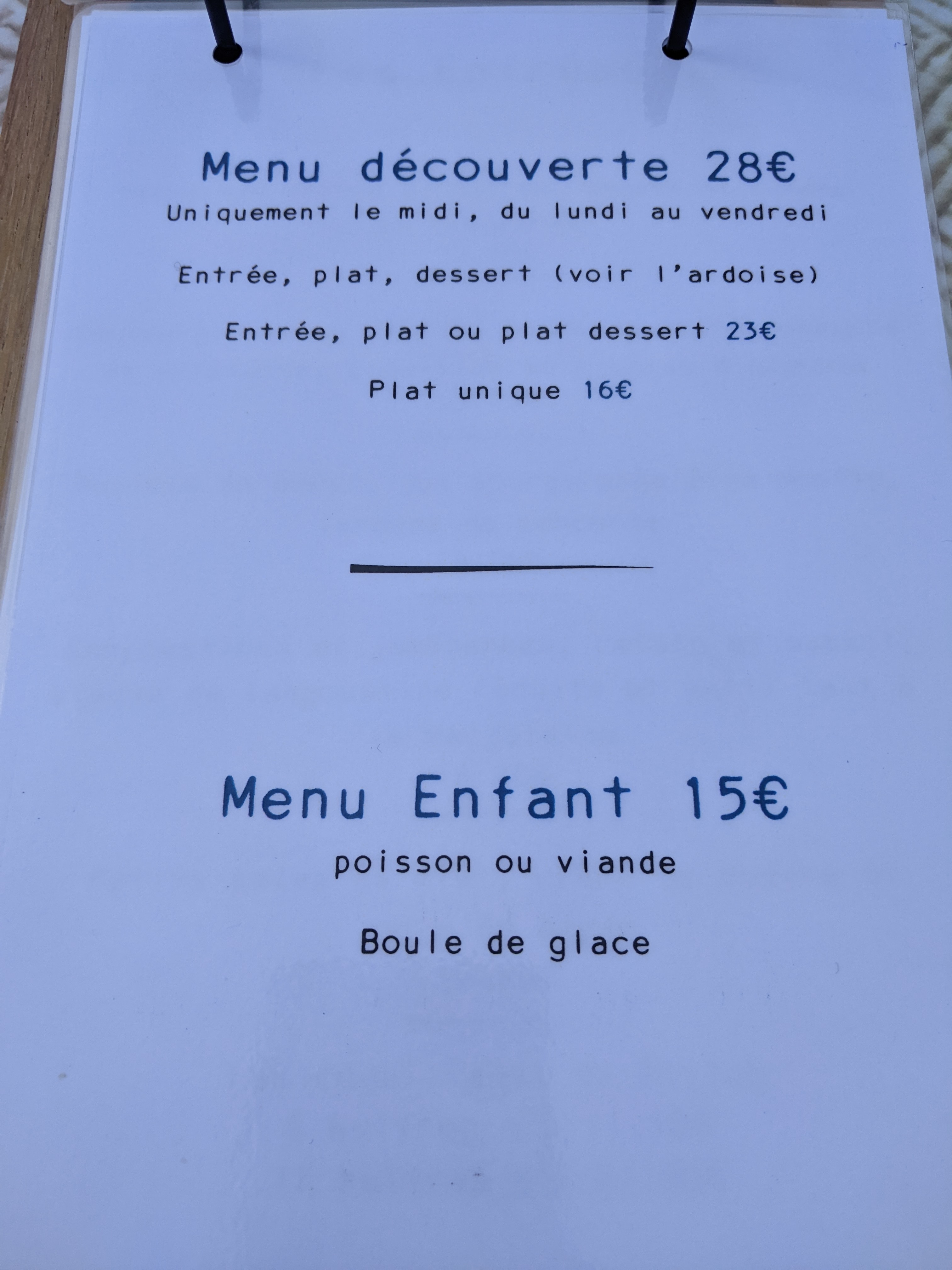 Restaurant sur le bord du port, de l'autre côté de la foule, au calme, très accessible Menu découverte entrée plat dessert pour 28 euros La carte (photos) est également attirante Les produits sont frais et bien cuisinés Je recommande