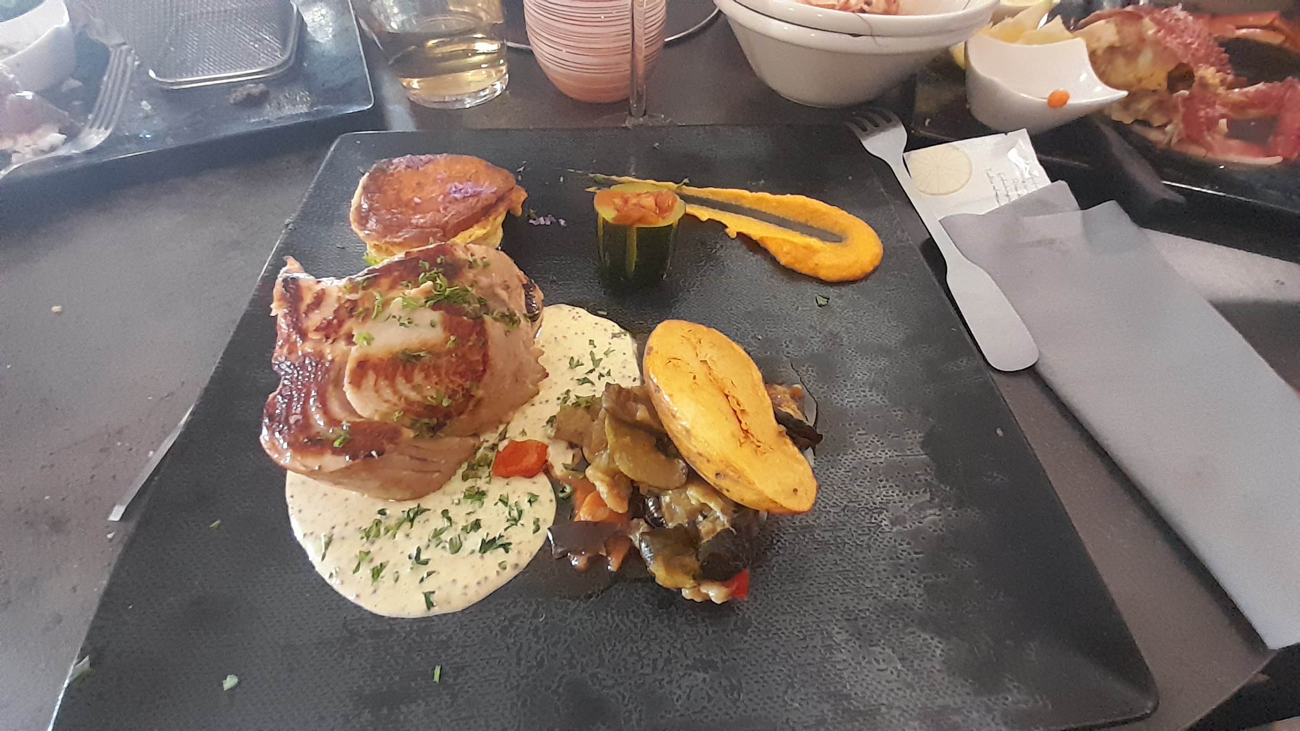 Déçue par l’assiette de fruits de mer!une araignée presque vide, des minis langoustines et quelques coquillages qui se battent en duel pour 26e. Les poissons étaient bons mais un accompagnement tristoune: du choux sous 2 formes avec du riz…en été!? et 3 petites chips!