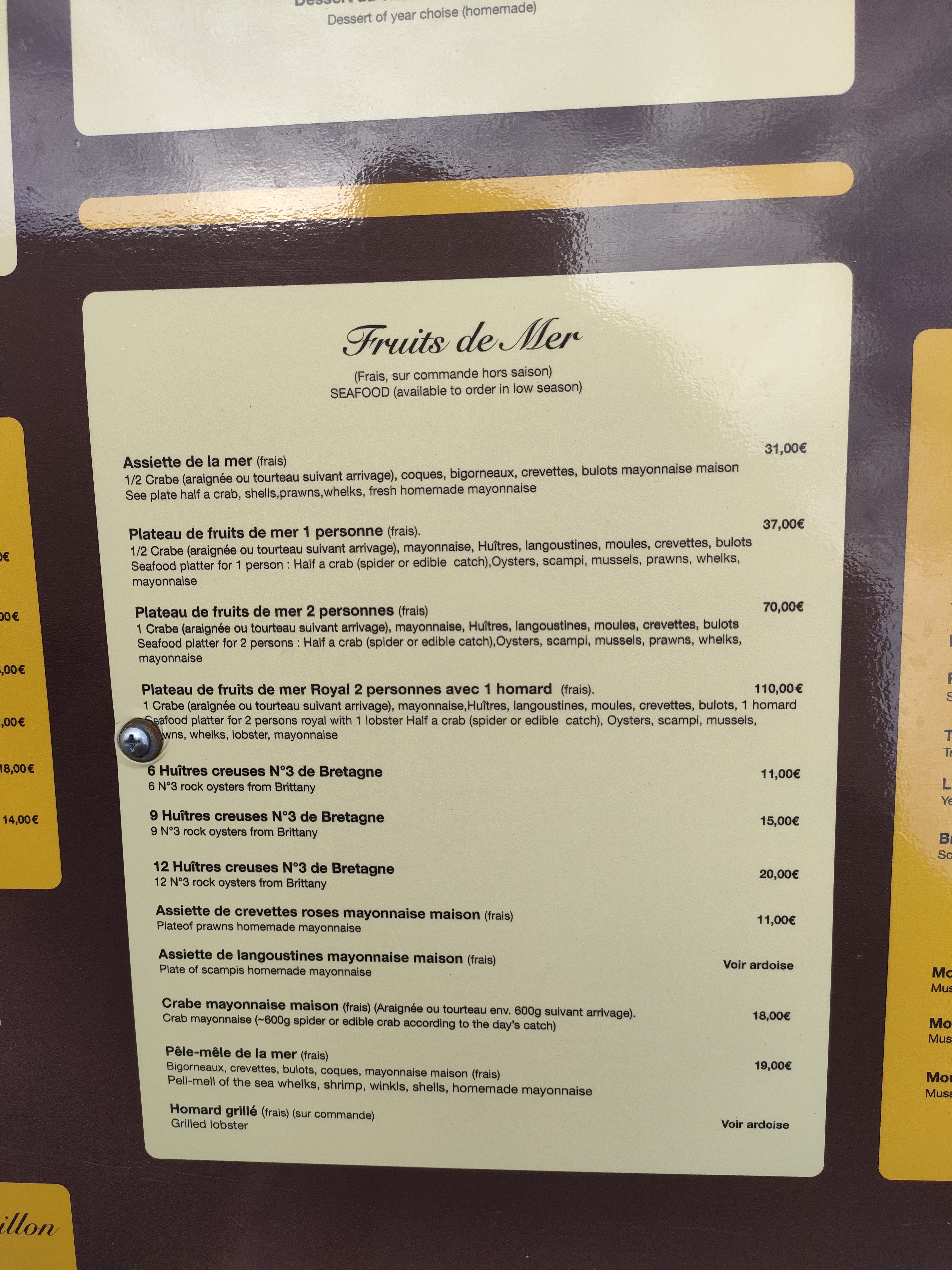 Pas de moules pas de dorade pas de langoustines..plats pourtant sur la carte et nous sommes en début de service ça laisse peut de choix pour le repas .. Le plateau de fruits de mer pour 1 personne a pratiquement 40€ n’est franchement pas assez fournis j’ai connu mieux a ce prix . La demie araignée était vraiment petite je ne pense pas y revenir j’ai été déçu ça ne vaut clairement pas le prix payé pour cette qualité. Et les chansons tristes en son d’ambiance vraiment pas top