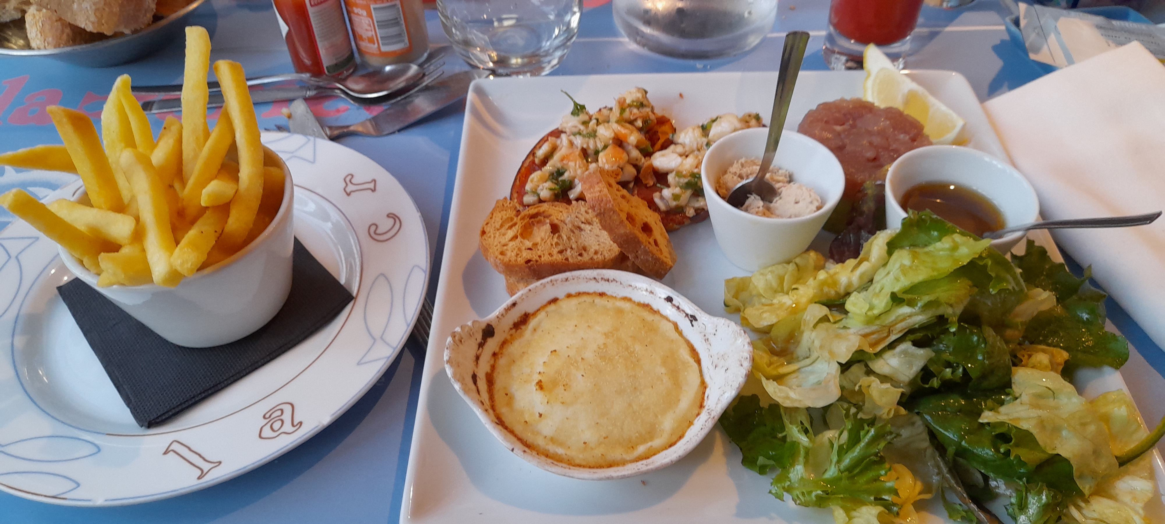 En plat j'ai pris le thon mi cuit, trop sec, trop cuit,une vraie semelle, presque immangeable. Mon épouse a apprécié son plateau de fruits de mer sauf les bulots trop gros ,mal cuits donc élastiques. La serveuse était charmante.