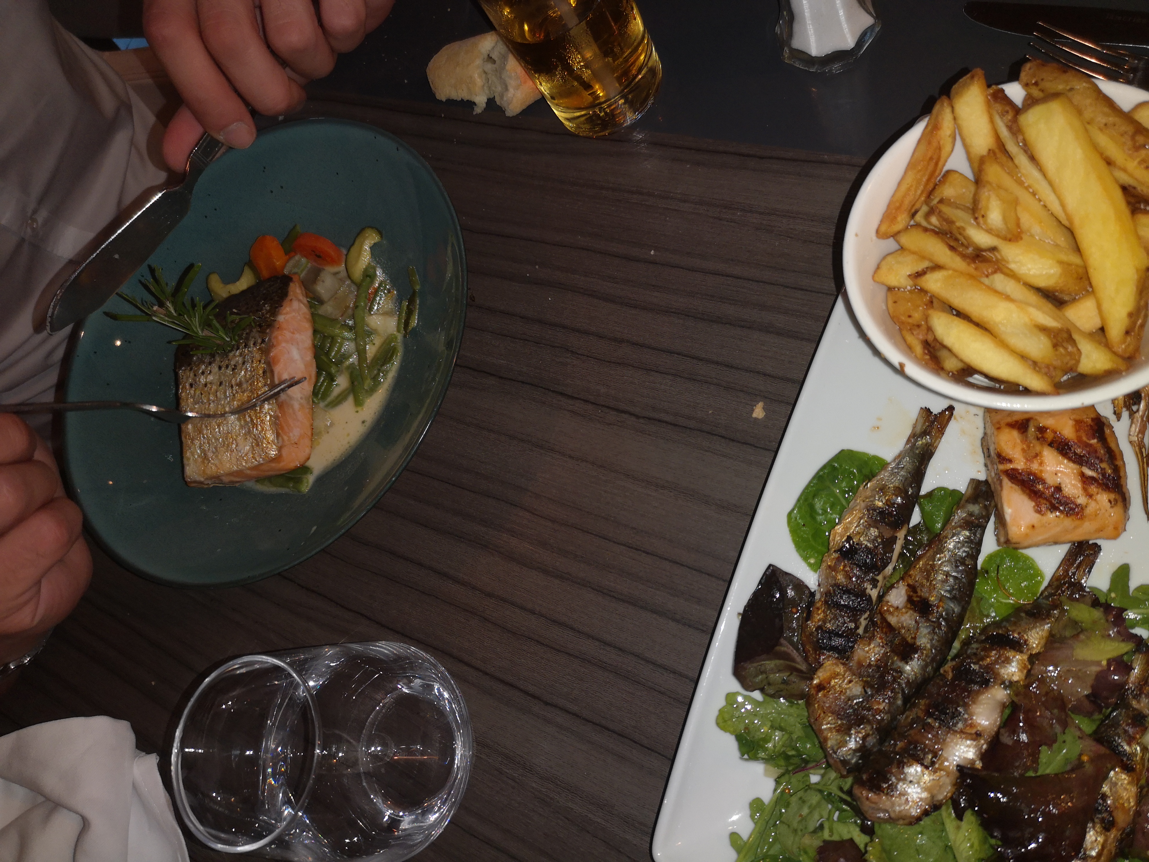 Serveurs serviables, à l'écoute..ce qui rattrape le repas. Assiette à partager peu fournie, les poissons sont fades et assiettes également peu remplies pour le prix. Le moelleux au chocolat n'est même pas un mi cuit mais un pas cuit du tout. Très cher pour ce que c'est ! Payer 45 euros pour un repas médiocre avec une entrée à partager, un apero c'est moyen