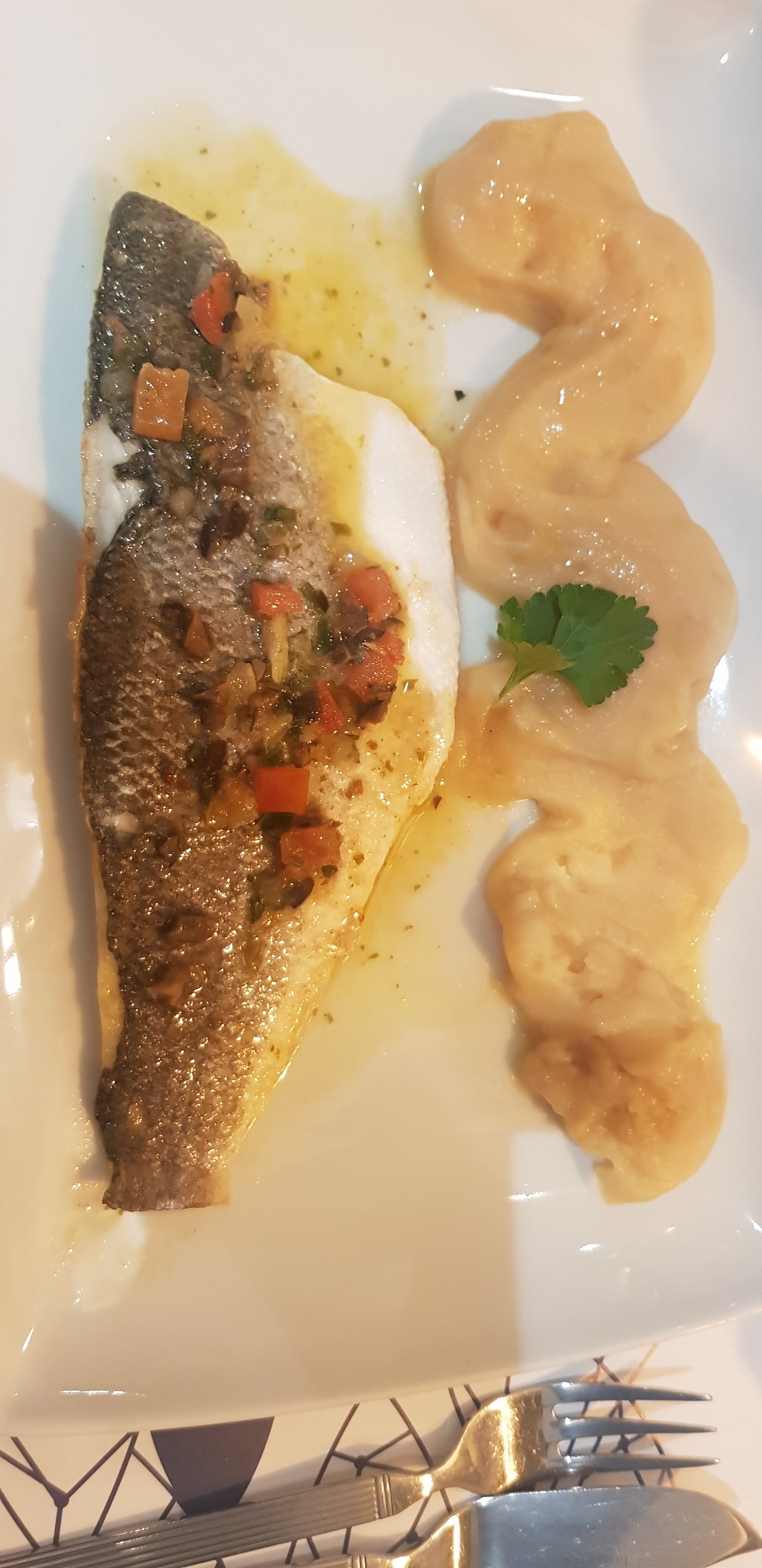Accueil professionnel digne d un resto gastronomique 👍rapport qualité prix correct..nous avons opté pour des news de crevettes sans grand intérêt et un filet de bar citronné; le plat était bon mais cela manquait un peu plus de goût et de présentation- l écrasé de pdt en forme de vague ne donne pas envie bref c est mon point de vue ..après le cadre et le service sont impeccable. A vs de voir.
