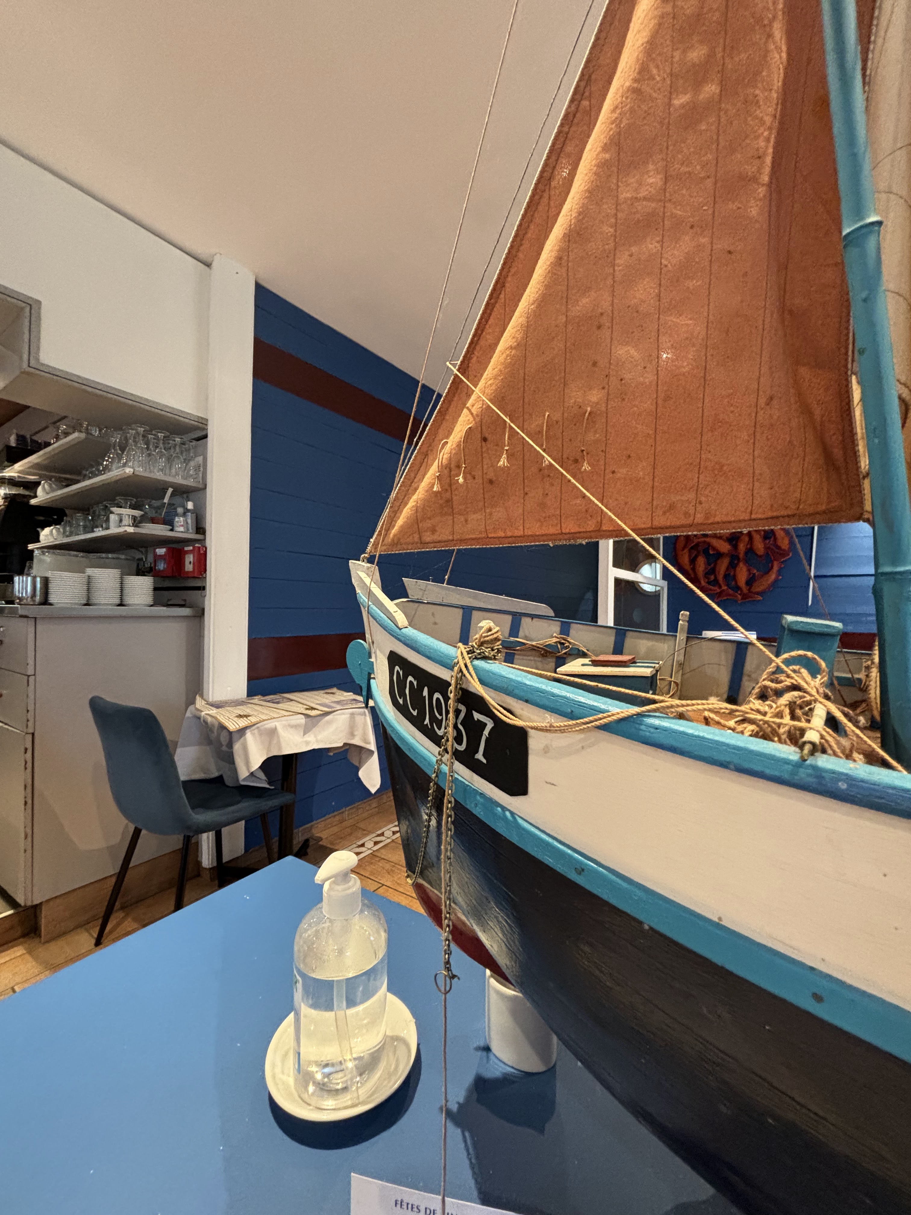 Repas excellent rien à redire serveurs très aimables par contre bémol au niveau de la propreté dans les toilettes nous sommes arrivés à 12h donc 1er service et poubelle non vidée. Poussières non faites au niveau du muret sur lequel se trouve la maquette de bateau
