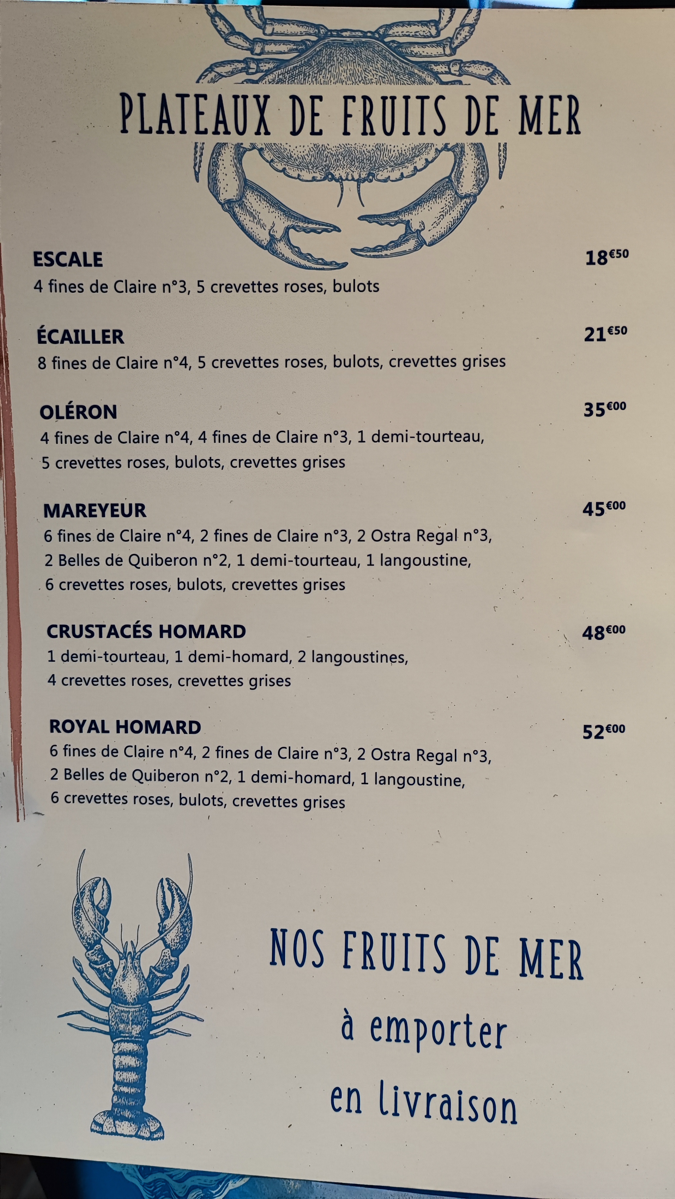 Une carte assez fournie avec une belle variété en terme de produits proposés comme souvent et de manière totalement injustifiée les marges faites par les restaurateurs sur les produits de la mer sont difficilement explicables. Le service est plutôt agréable mais un peu lent. j'ai regretté qu'il ne soit pas indiqué si les produits étaient surgelés ou non mais peut-être ai-je mal lu.