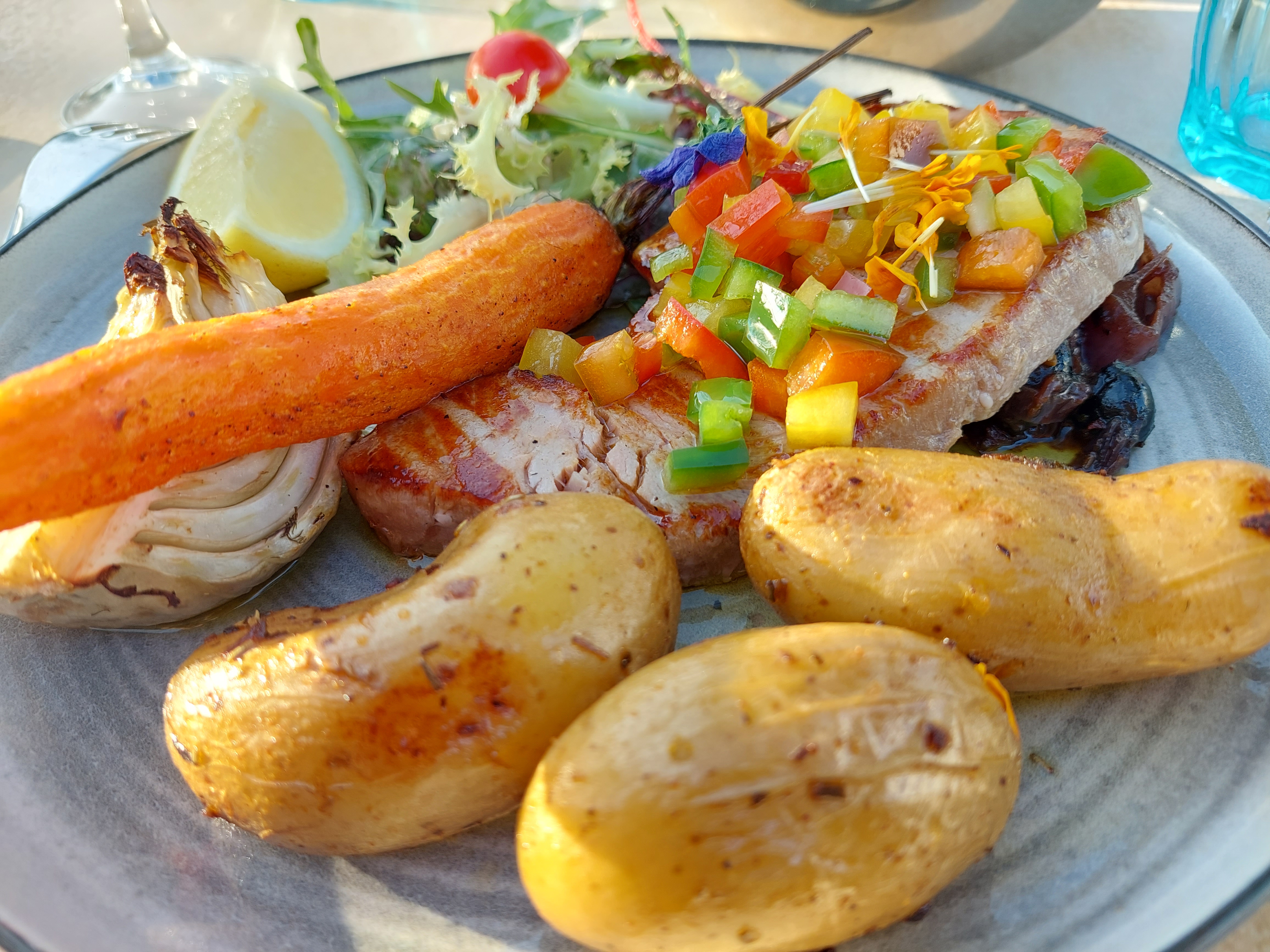 Pour une « pizzeria », le concept est assez étrange : en bas, ambiance assez cheap pour manger des pizzas, en haut terrasse magnifique avec vue sur la mer mais avec un menu à prix d’or qui n’est bien sûr pas affiché en amont. Alors certes la vue est très belle et le service est agréable, mais une daurade sans sauce avec 3 pauvres légumes grillés pour 98€… sachant qu’en bas la portion de poisson de 500gr est à 32€, ça fait mal ! Pour 2 spritz, une assiette de supions et une daurade à partager (dont on nous a imposé le poids de 980gr en nous faisant croire qu’il n’y avait pas plus petit), nous en sommes donc sorties avec une addition de 143€ à deux, de quoi gâcher un peu les vacances, d’autant qu’on a dû se forcer à terminer pour ne pas gâcher 20€ de poisson. Un conseil, réservez plutôt côté pizzeria où il y a quand même la vue sur mer à condition d’arriver tôt, et passez votre chemin si vous aimez le poisson.