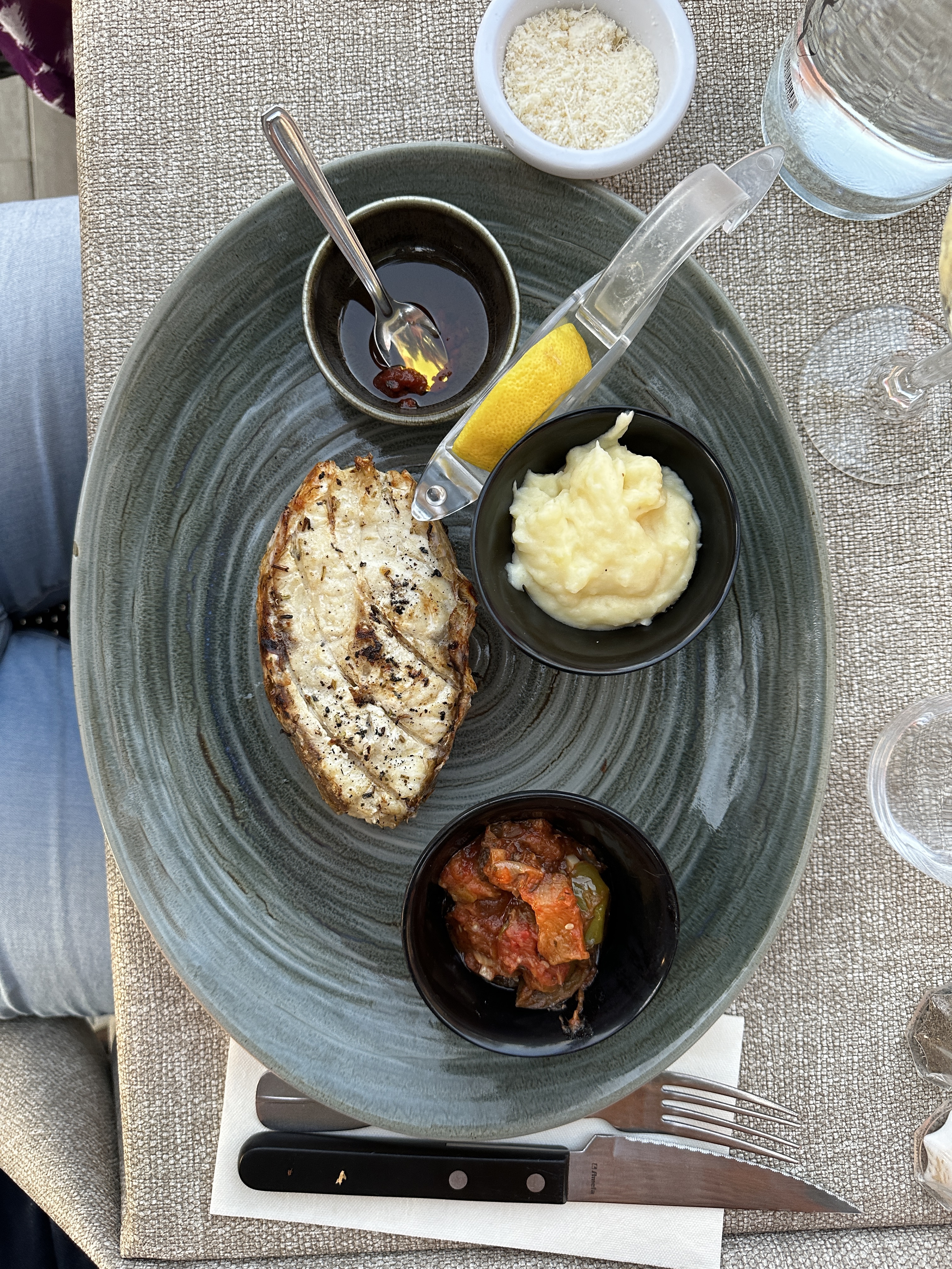 Déjeuner parfait pour deux avec carpaccio de saumon et espadon grillé, en terrasse sous un énorme pin parasol avec une vue idéale sur la mer. Le personnel est charmant et attentionné, le service impeccable. Un moment de qualité, merci !