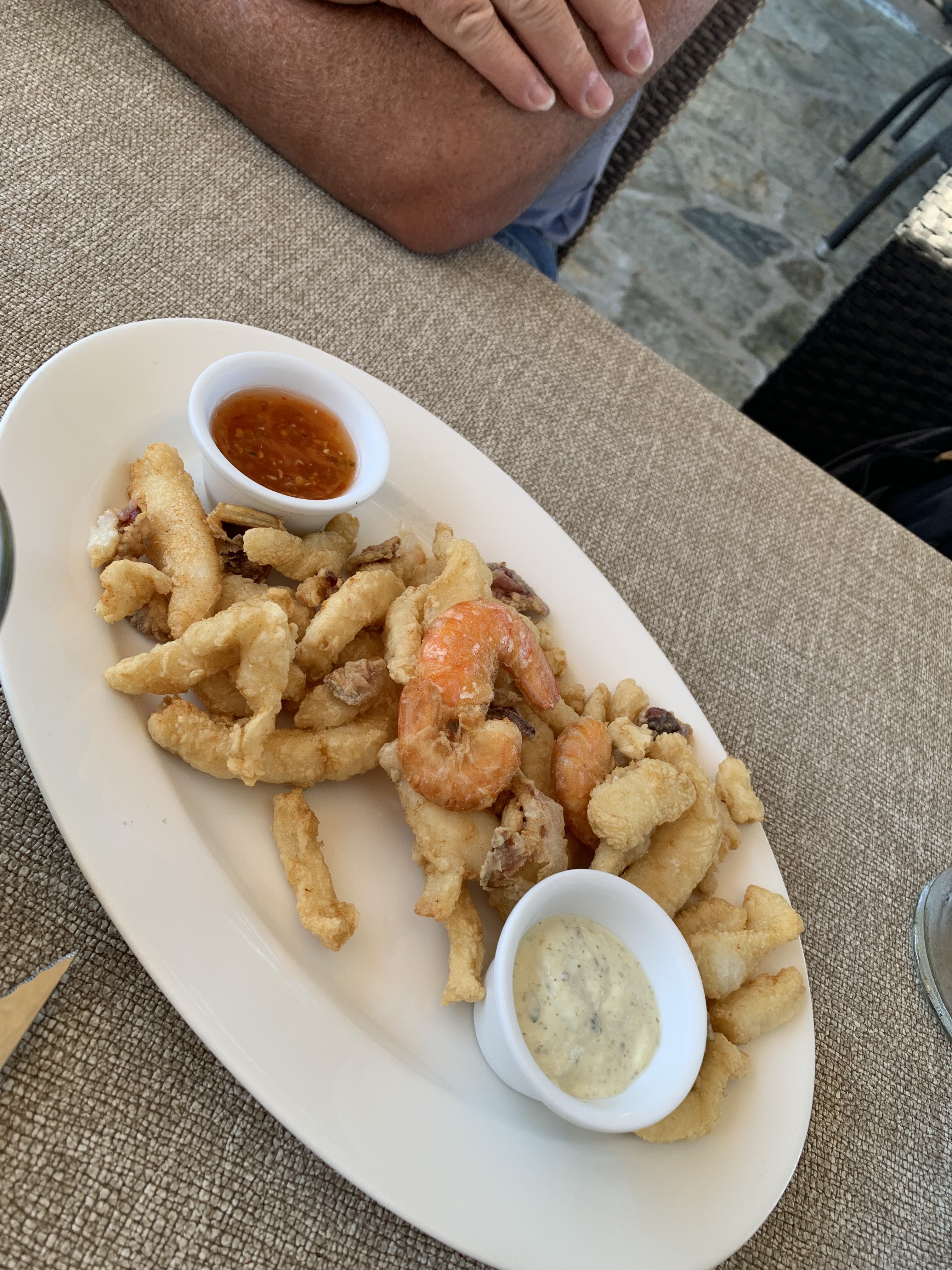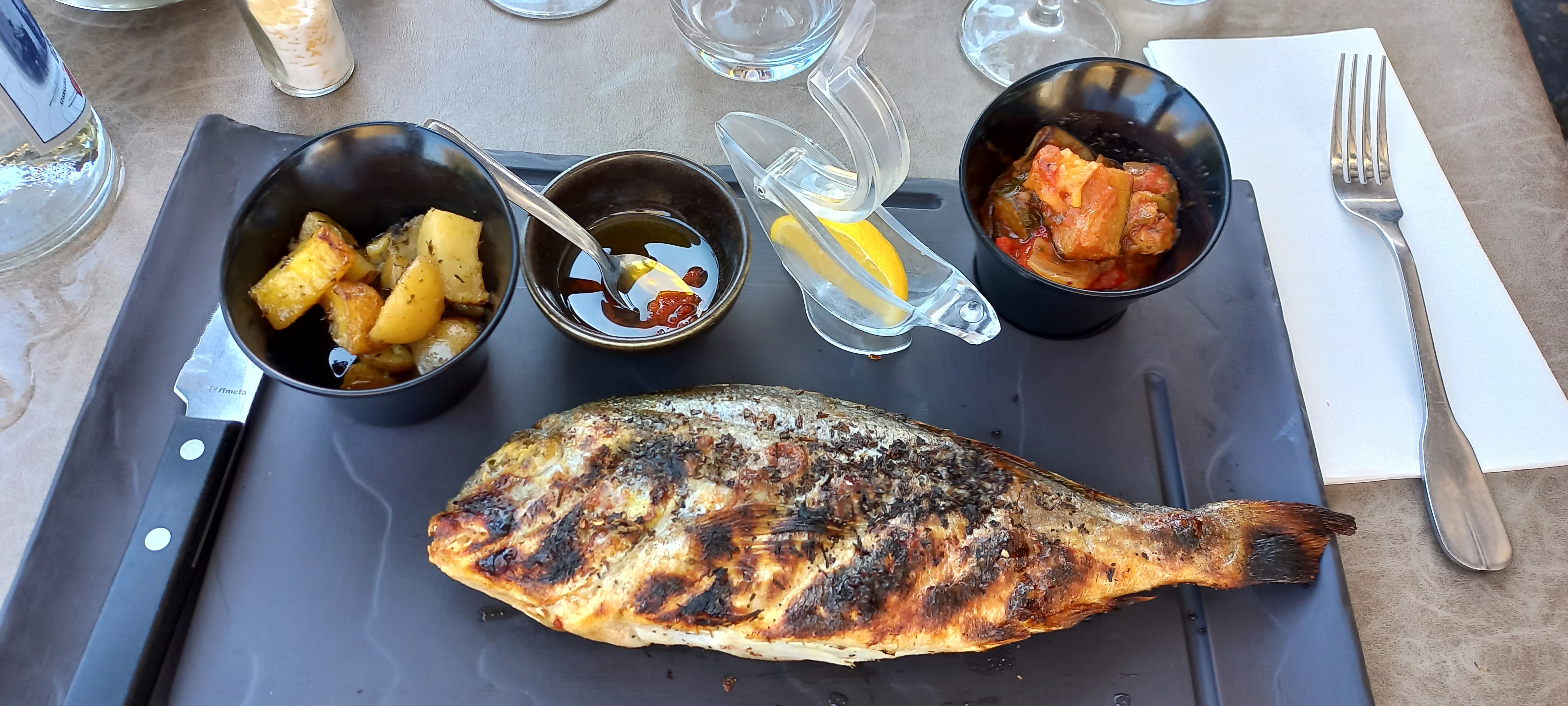 Assez décevant malheureusement, malgré la très belle vue et la terrasse agréable. Nous avons notamment commandé des tartares de daurade en entrée… trop assaisonnés et trop marinés, on ne sentait pas du tout le goût du poisson (la serveuse nous a assuré qu’il n’était pas congelé après lui avoir demandé après dégustation). Ils étaient servis avez du riz un peu dur, fade et pas assez cuit. En plat nous avons pris du poulpe… il aurait été plus judicieux d’appeler ce plat « ragoût de poulpe » ! Quelques petits bouts de poulpe dans une tonne de sauce épaisse et marron. Et ce plat était encore servi avec le même riz que celui de l’entrée… Pas très appétissant. Une de nos amies a pris le poisson du jour grillé : le seul plat qui a donné satisfaction sur notre table ! (Compter quand même environ 40€ par assiette pour le poisson qui est servi a la pesée). Relativement cher pour ce que nous avons mangé.