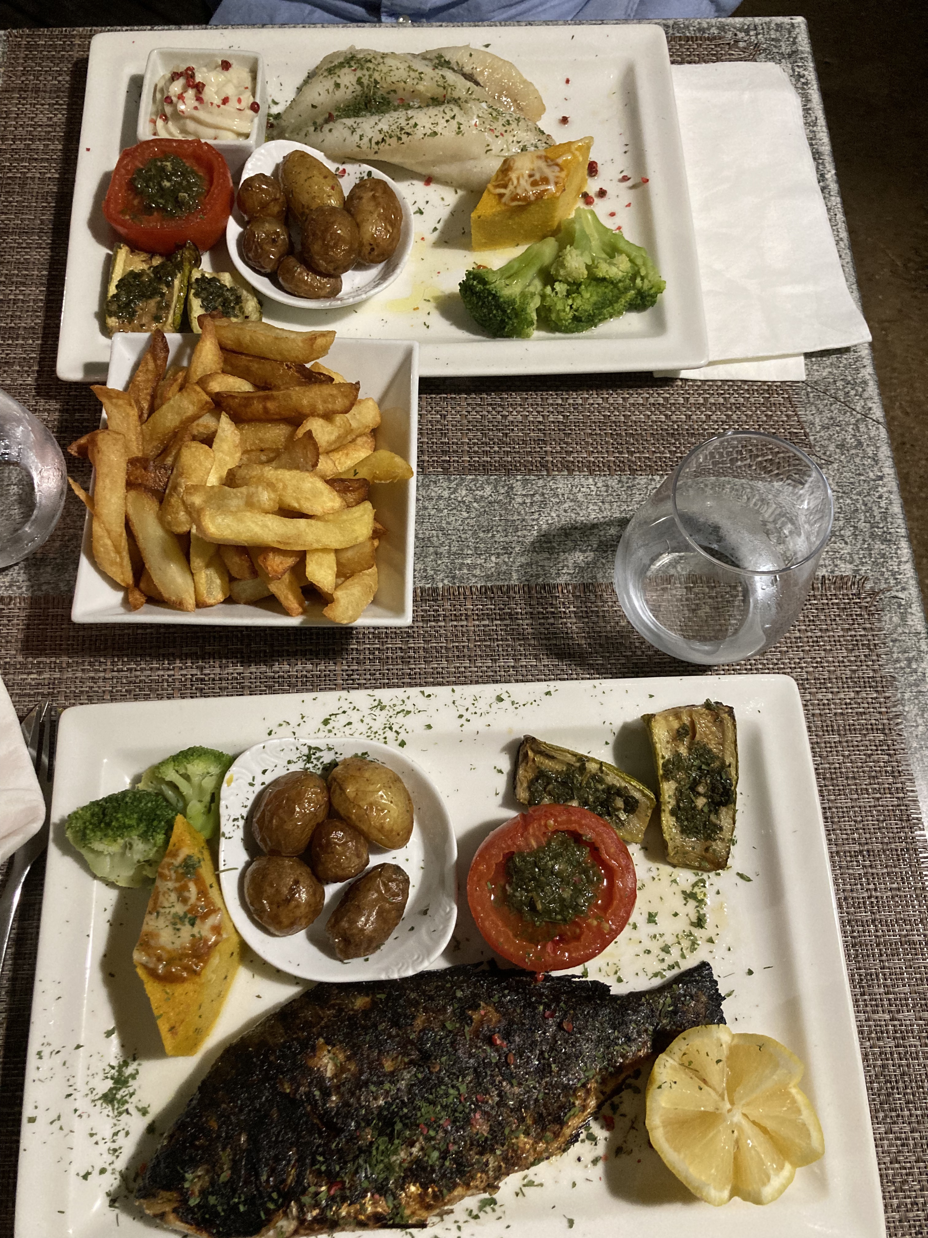 Bon accueil, notre table avait une très belle vue sur la plage ,la mer... Le service est assez efficace. Les poissons, 2 dentis de pêche local proposés par la serveuse. Pas de présentation des poissons... La cuisson sera au grill ,ok Entrée beignets de courgettes...servis rapidement..ne semblaient pas sortis de friteuse..peut-être réchauffés .. Poissons trop cuits ,secs,et insipides....les accompagnements carottes,brocolis ,3 legumes grillés et un petit carré de polenta de maïs avaient l'air réchauffés de la veille... Porte battante de la cuisine qui n'arrêtait pas de taper toute la soirée....dû au va et vient du personnel....insupportable..! dommage pour tout, restaurant décoré sans charme....de si bons poissons gâchés.... un cadre naturel si romantique. ..le clapot de la mer tentait de nous faire oublier ce bruit de porte.. Prix élevé pour ça.