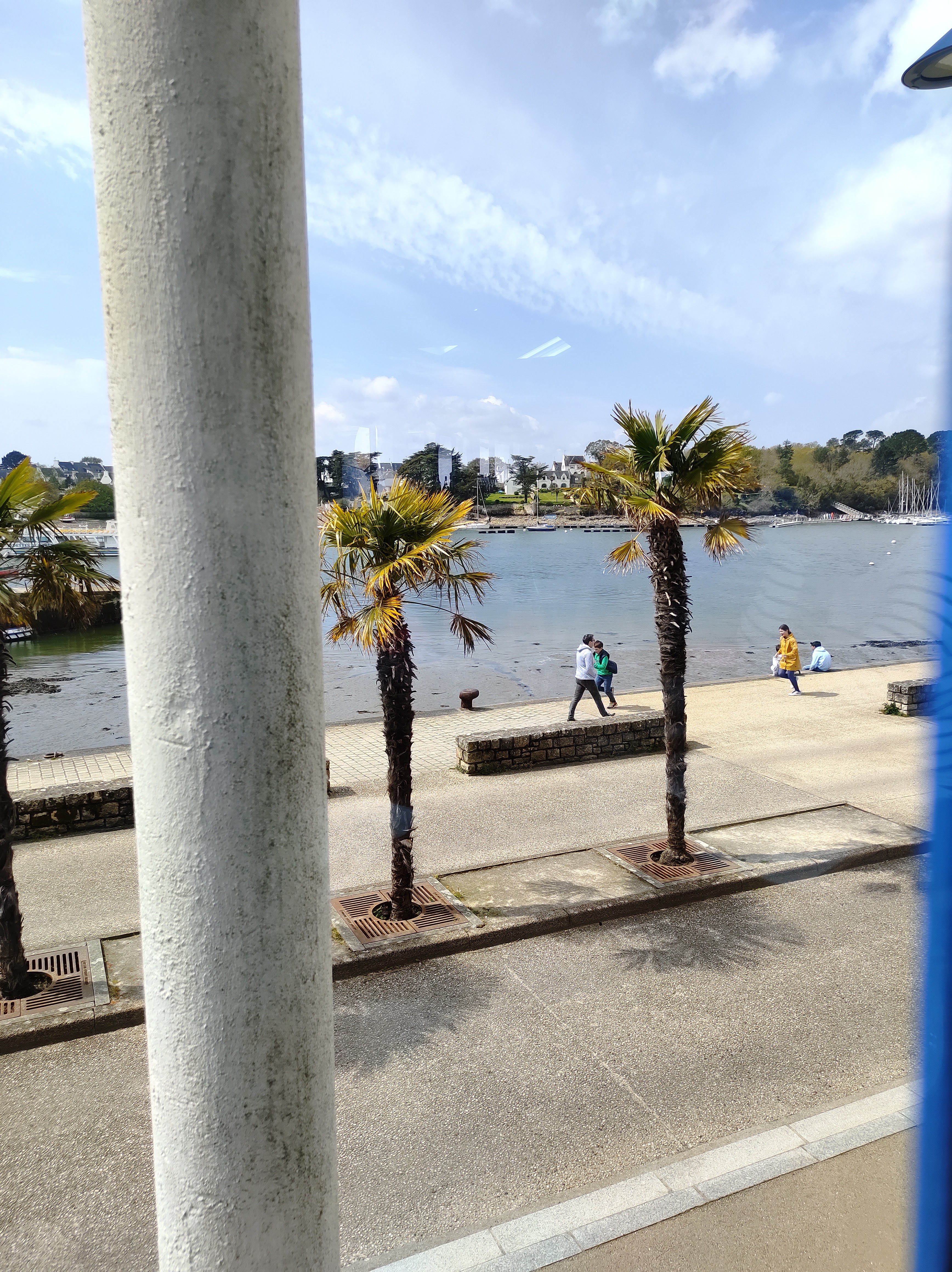 Apéritif (2 verres de Quincy à 3,50 € ==> frais et goûtus) en terrasse (supplément de 0,30 €/verre !!!) servis avec quelques chips plutôt rapidement. 😊Belle exposition soleil couchant frisquet en ce début de mois d'avril. Jolie vue sur l'Odet filtrée par les entrées et sorties du parking. 😕