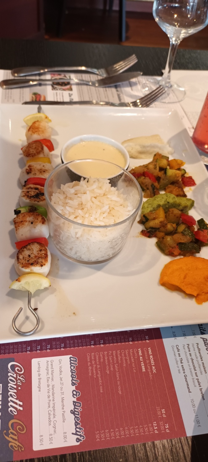 Un repas certes , très bon . Mais la quantité est absente . Quand on commande une brochette de boeuf , ils ne mentent pas . Une seule brochette avec 5 petits morceaux accompagnée de deux très petites purée de légume et de frites qui ne sont pas mauvaises mais encore une fois , sans la quantité appréciée . Tout ceci pour 19 euros ... totalement exagéré selon moi .