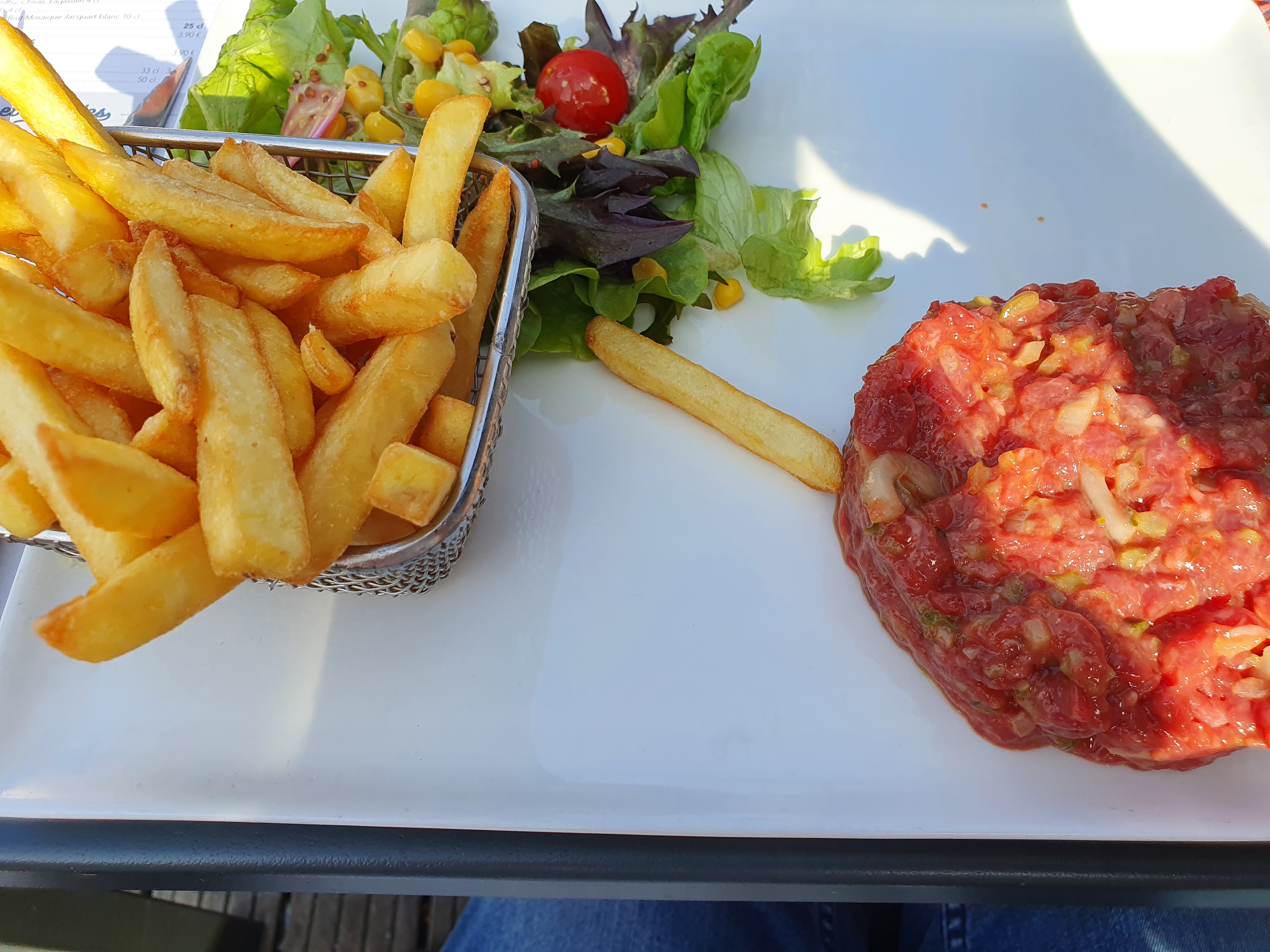 Un restaurant décevant, un service bien désorganisé peu de remise en question suite à notre déception. Cela commence par les panneaux extérieurs qui vendent une formule du jour qui n’apparaît pas sur les propositions de la carte qui se trouve sur la table, des boissons qui augmentent de 50 centimes d’euro de la carte des boissons proposées en terrasse sur la carte des boissons proposées sur la carte du restaurant. Après avoir obtenu une table avec le serveur le plus âgé qui, cela dit, travaille énormément sur tous les fronts et semble vraiment être au four et au moulin, nous devons quémander pour passer commande, de même pour obtenir des verres à eau et une corbeille de pain. Je n’en fait pas grief aux serveurs (je connais bien la restauration étant moi même fils de restaurateurs) ils sont vraiment débordés et semblent désorganisés . Le crottin de Chavignol annoncé sur la carte dans la salade est bien un Chavignol mais à perdu sa forme est trop cuit, n’est pas entier mais probablement coupé en deux. Le plat principal de ma compagne est arrivé froid, viande et frites (la viande était bien cuite à point mais froide, cela est dommage car la qualité de la viande était bonne) le plat a donc été renvoyé en cuisine il est bien revenu chaud mais la viande a subit une sur- cuisson comme les frites rendant le plat bien dénaturé. En ce qui me concerne les frites étaient également froides , le tartare de bonne qualité mais peu assaisonné. Le Tiramisu était assez fade. La réponse des serveurs était peu cordiale, sur la défensive. C’est dommage car l’emplacement et la qualité de la viande est bonne.