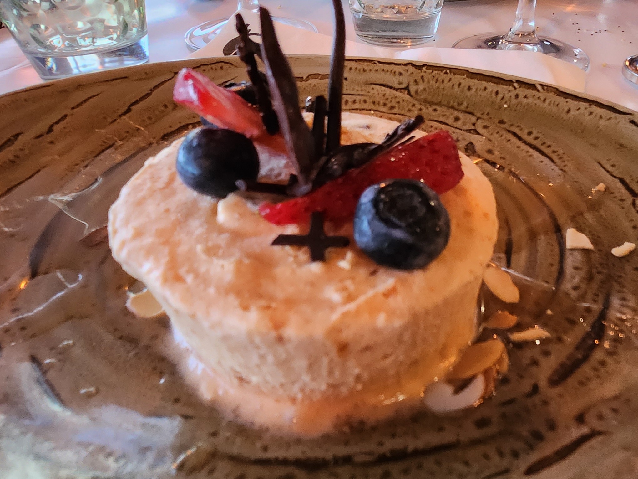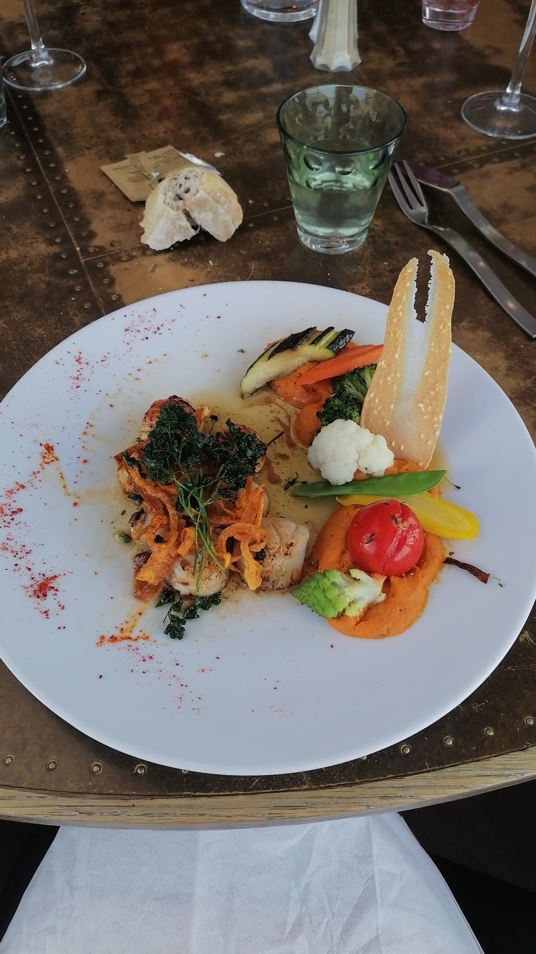 La vue est belle, la carte prometteuse et nous nous sommes laissés tentés par un risotto de St Jacques à l'huile de truffe. Et quelle déception ! Fade, riz trop cuit. Une catastrophe à 31€ l'assiette ! On n'a pas eu envie de prolonger le moment . La prochaine fois, on ira dans une crêperie