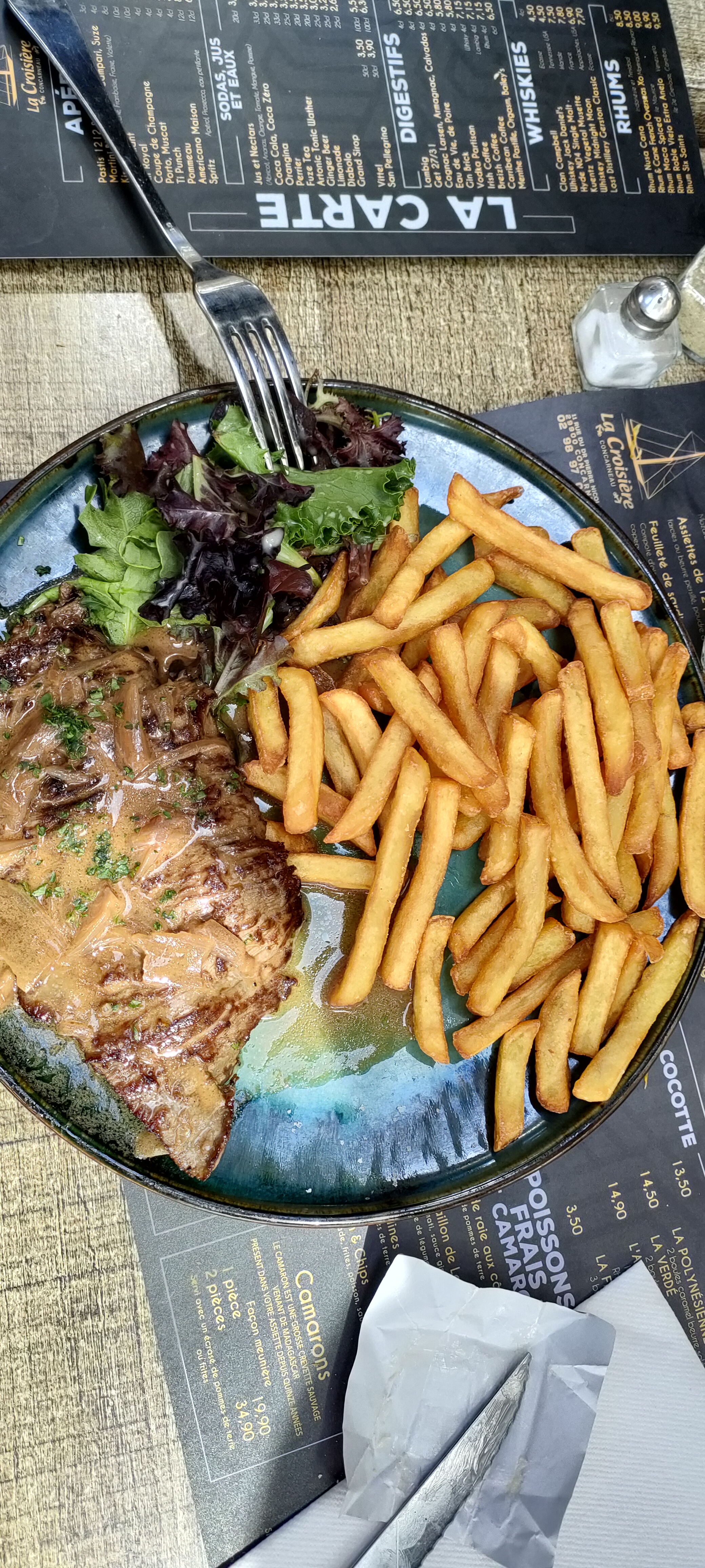 Repas ce 26 juillet 2023 au soir. Commande fish and ships pour moi, moules frites pour madame. Fish and ships à peine tiède et panure bof dans une assiette plus que froide, mais bon, je ne suis pas difficile. Par contre une heure et demi plus tard, ma compagne a été prise de douleur intestinales très violentes, asile dans une creperie et appel des pompiers... Nuit affreuse, puis journée suivante aux urgences... Intoxication alimentaire... Comme nous avons mangé strictement la même chose à tous les repas précédents sauf ce soir là, forte suspicion sur les moules....