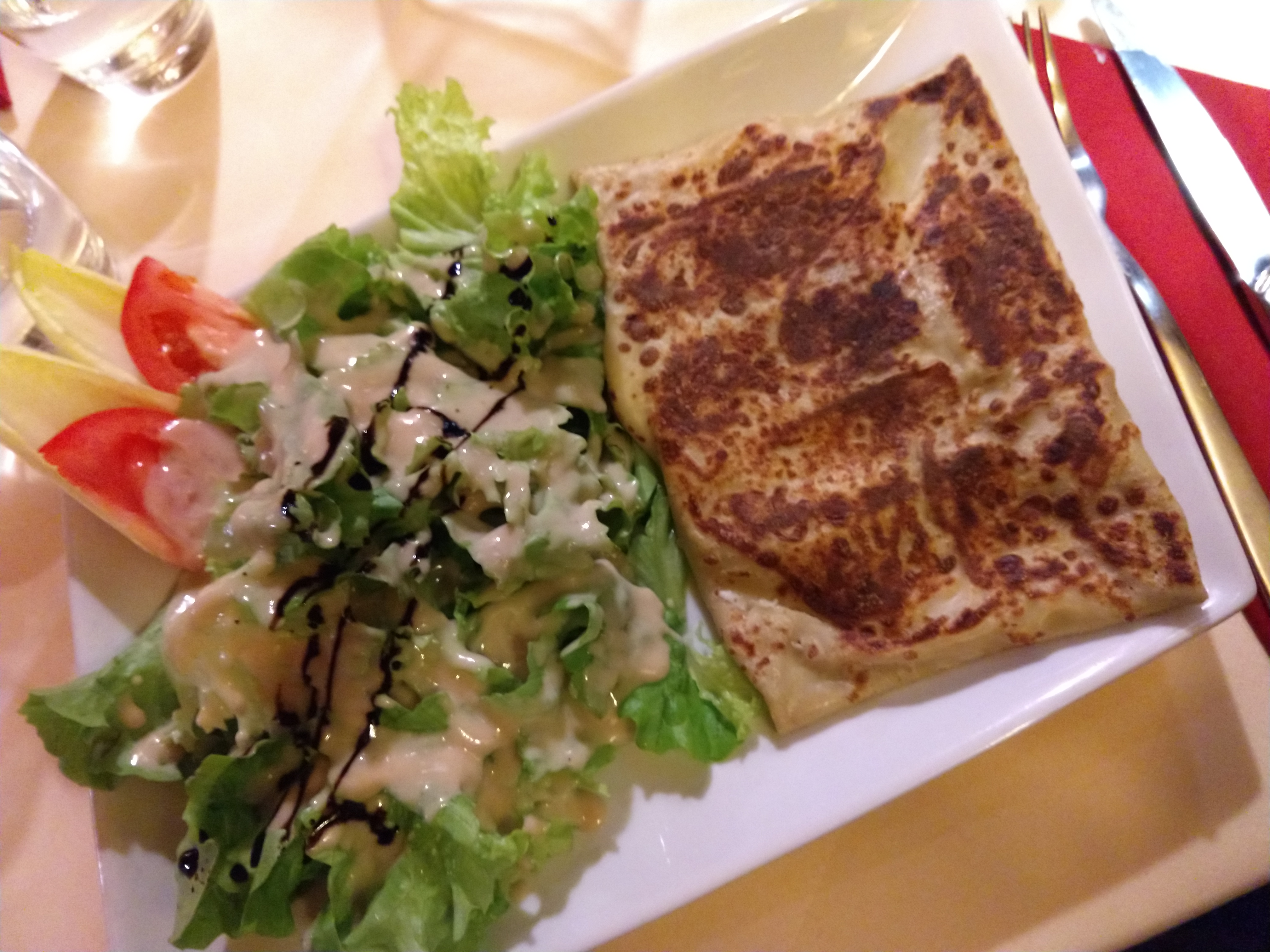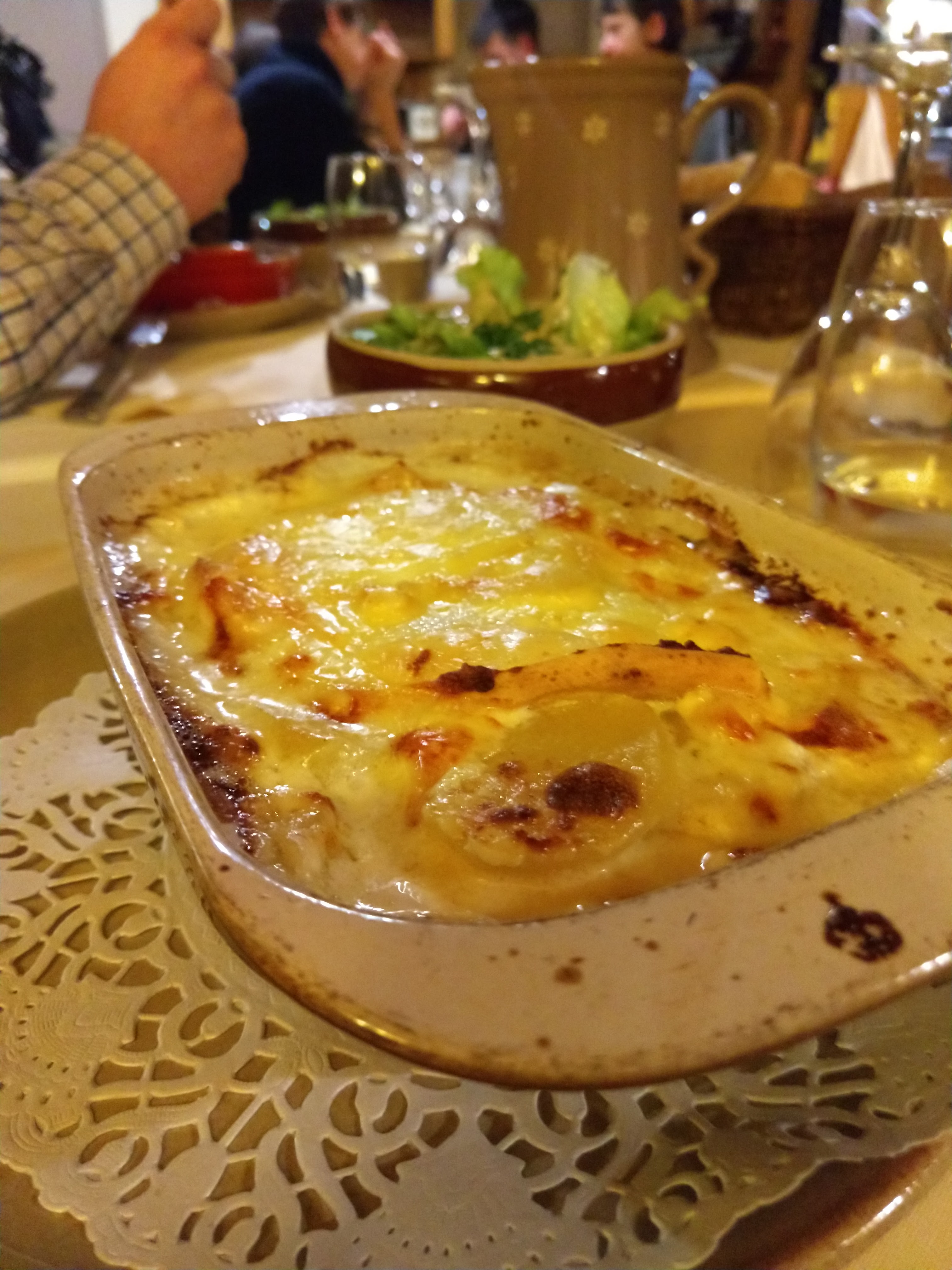 C'était notre première fois ici, nous sommes venus de l'hôtel grâce à une superbe photo sur Google. Nous ne savions pas ce qu'était le Savoy auparavant, mais nous l'avons étudié pendant le dîner. J'ai eu une crêpe La Savoyarde - oignons, pommes de terre et fromage, qui était incroyable et une très bonne portion, je n'ai pas pu tout manger. Il était également accompagné d'une salade généreuse avec une vinaigrette savoureuse. Hubs a eu Le Berthoud - du fromage fondu avec des mini pommes de terre au vin doux, de la viande, de la salade, des cornichons, il a tout mangé. J'ai essayé du fromage fondu sur du pain, il avait un goût de beurre et de paradis, je le commanderais certainement la prochaine fois. Deux amis ont eu une Gratinée à l'oignon - une soupe au fromage et au pain, ils ne savaient pas avant ce qu'ils commandaient, mais c'était un grand bol, ils les ont remplis et ils ont beaucoup aimé. L'hôte ne nous a pas parlé en anglais mais a été très gentil, a essayé de nous aider avec la prononciation de la cuisine française et a même deviné quel dessert mon ami voulait en faisant des mouvements de la main et en montrant du doigt. Elle a demandé à un autre serveur qui parlait anglais de prendre nos commandes. Lui aussi a été utile et nous a conseillé sur la prononciation, ce que nous avons apprécié. J'ai aussi eu un cappuccino délicieux, les hubs ont eu une glace au café car il pense que cette région a le meilleur. Bel intérieur, nappes, vieilles poutres en bois, bel éclairage du soir, excellent service, nourriture parfaite.