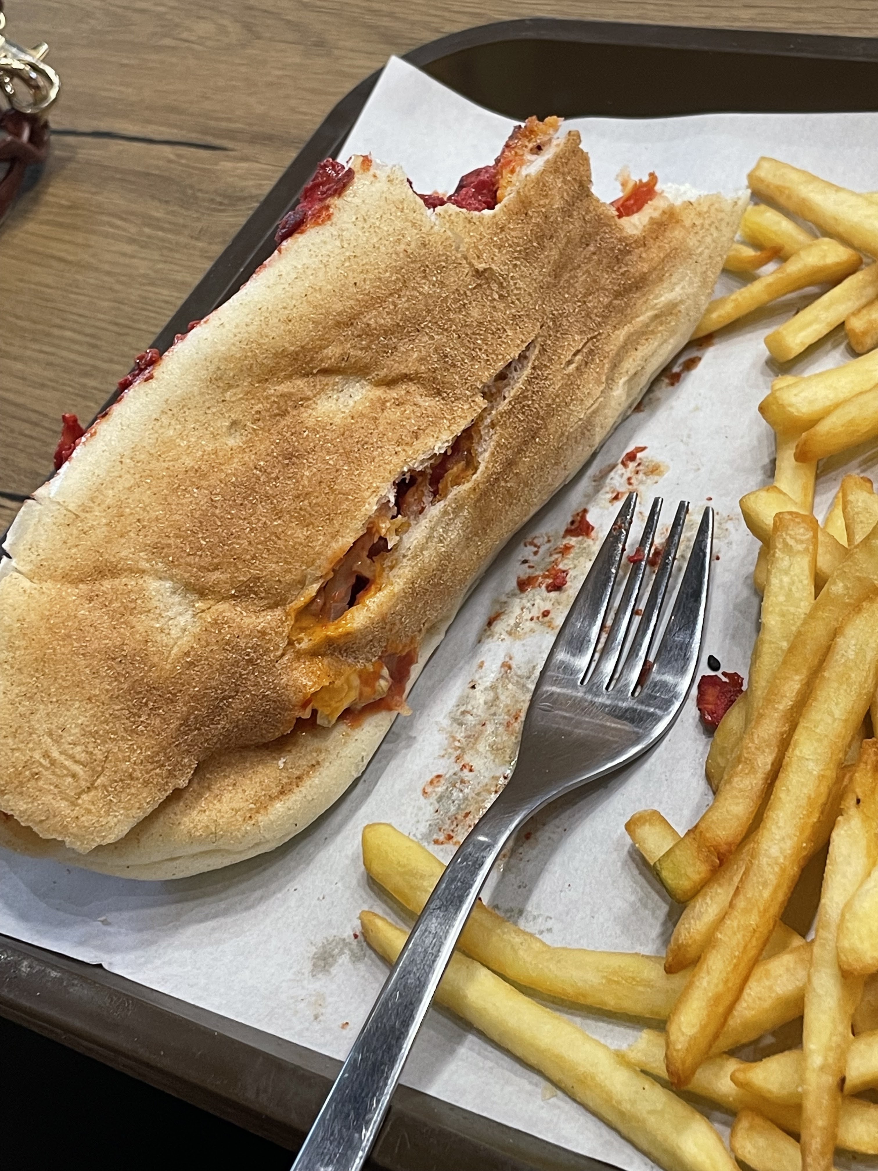 Expérience laborieuse. Le pire sandwich de ma vie. Viande au goût désastreux, sans épices, cuisson moyenne, aucune sauce donc extrêmement sec. 2 crocs dedans puis poubelle malheureusement