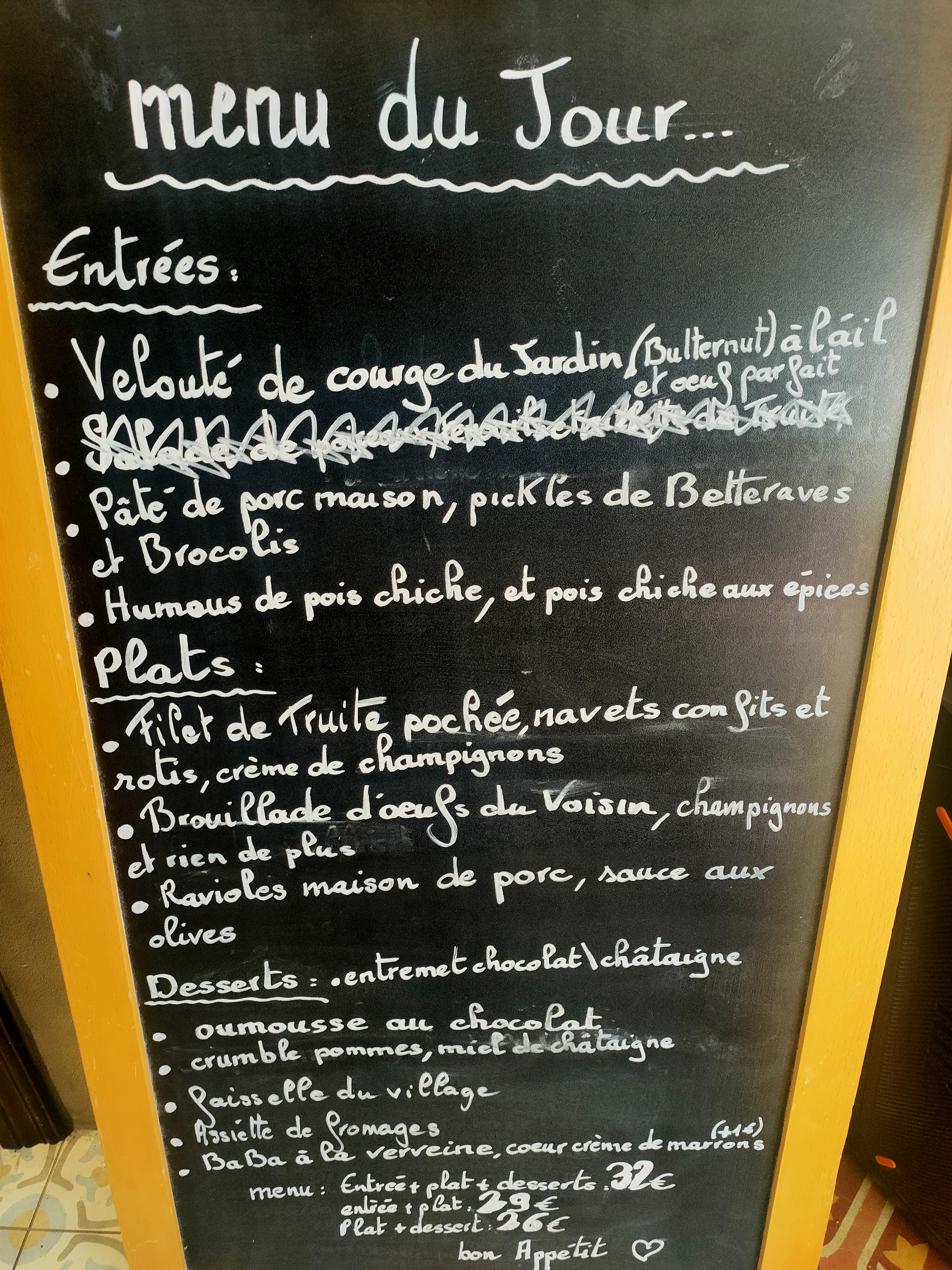 Je vais faire “tache” mais déçu…pour un deuxième dîner ! Une entrée: assiette terroir (chèvre du pays avec du jambon blanc 🤨)pour 13€ Plat : Hampe grillé laissée dans l’assiette…une carne ! C’est sûr le chef, n’est dans la viande mais c’est lui qui l’a choisie ! Pour rappel, la carte ne propose que 2 choix (1 viande ou 1 poisson…une truite) pour 18€ ☹️ Remarque au personnel (sympathique et accueillant) qui sans excuses. Bref, j’attendais au minimum un geste commercial, du style des 2 bières pression consommées à l’apéro offerte… Mais 👎 Dommage pour moi, l’établissement retrouvera sûrement d’autres clients.
