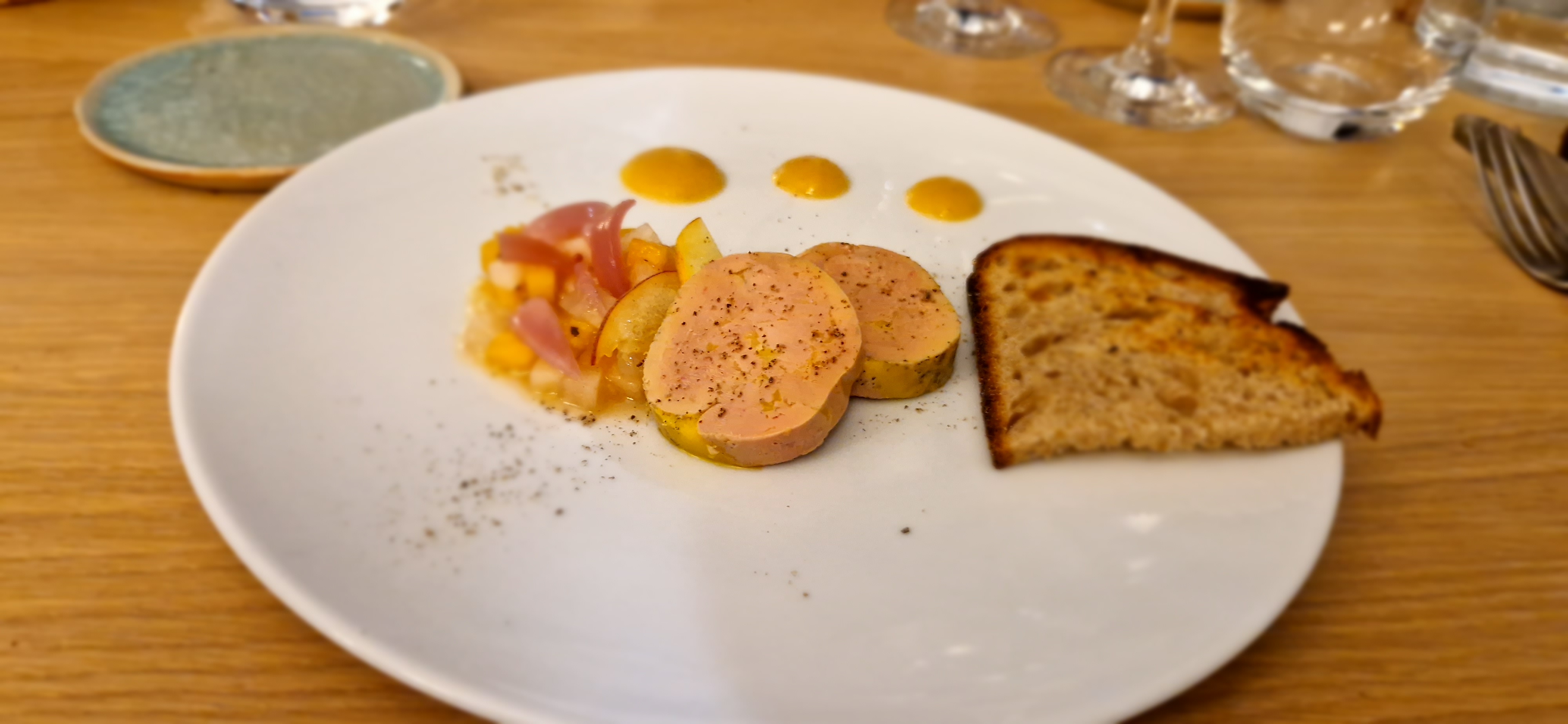 Super restaurant avec un menu en 5 services très abordable. Nous avons eu 2 mise en bouche (accra de lotte, tartare de maquereau),2 entrée (foie gras, tartare de dorade) 1 plat (baillotine de lotte avec purée et champignons), 1 assiette de fromage et un dessert autour de l'abricot. Je n'aime pas le poisson et pourtant j'en ai mangé ! Les différents mélanges des saveurs étaient vraiment délicieux. Le service a été très agréable. Je recommande les yeux fermés.