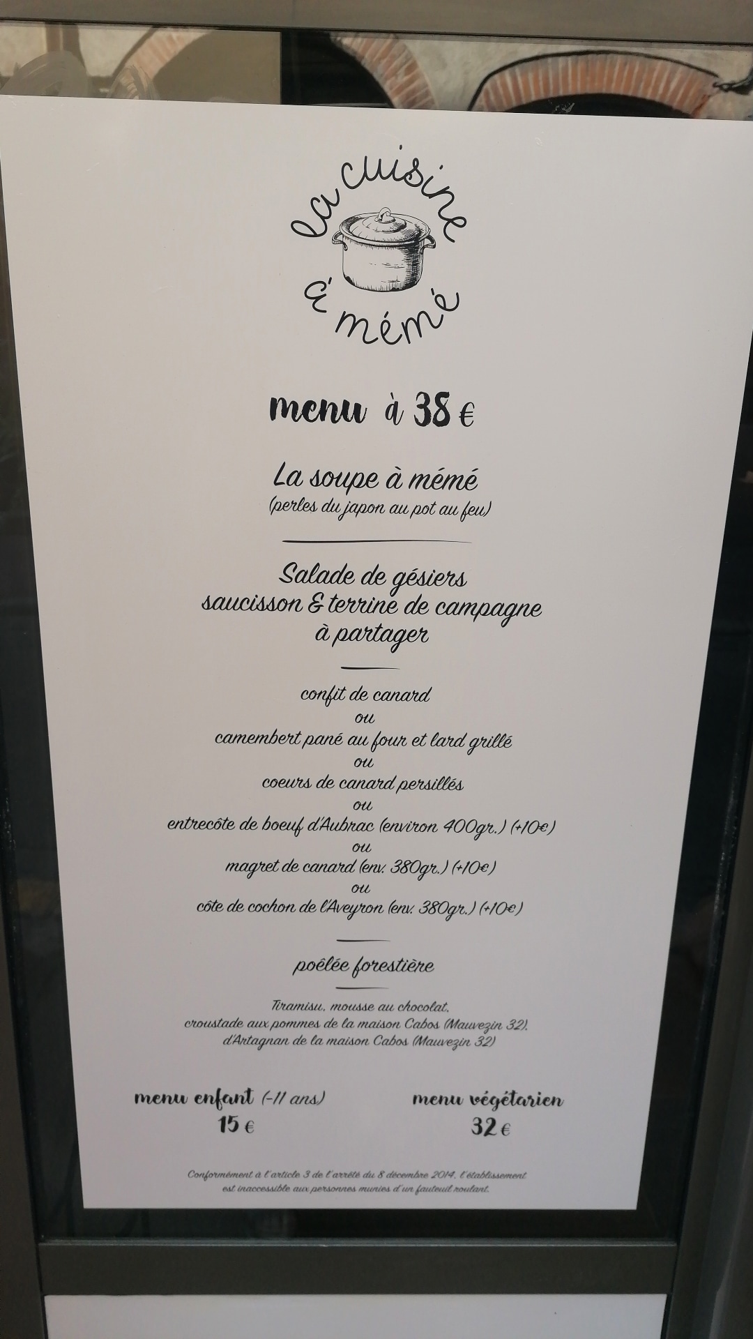 Menu unique à 32€ ou 42€ en fonction du choix du plat. Il faut avoir faim c'est bon et copieux! La soupe à mémé et les entrées à partager sont excellentes. On a passé un bon moment.