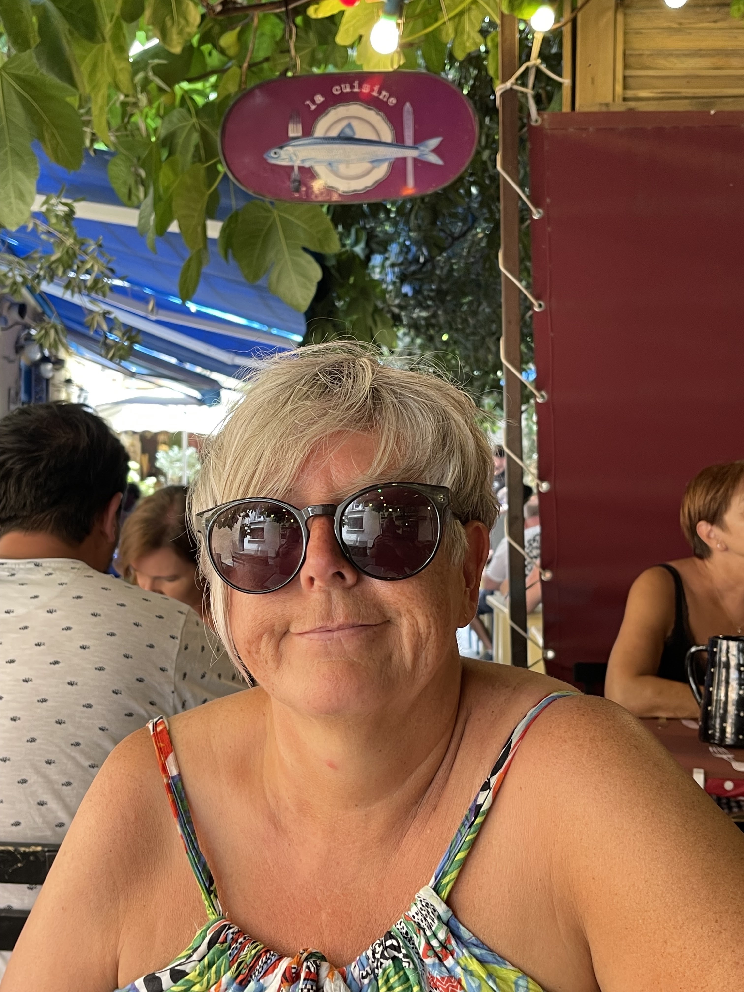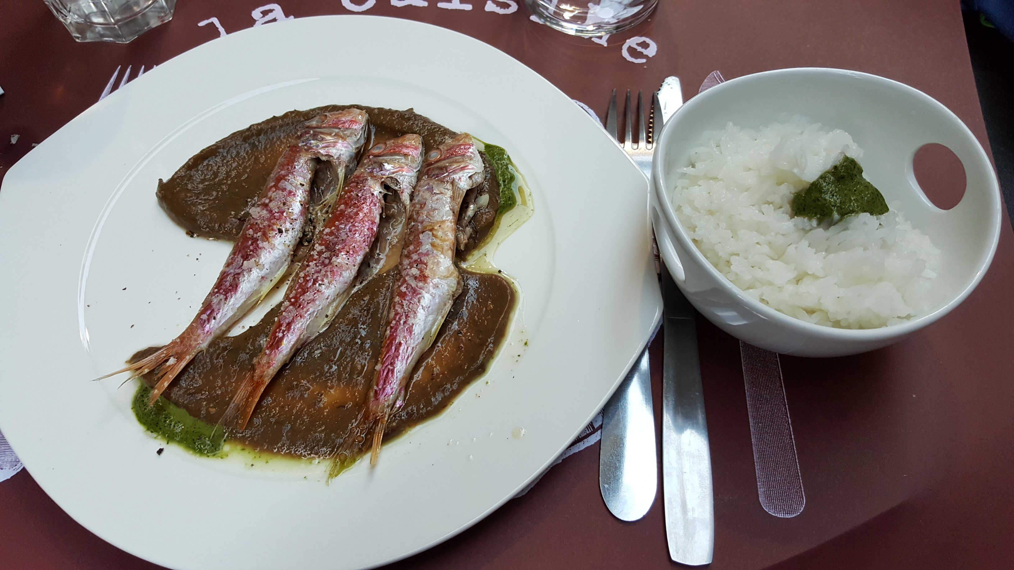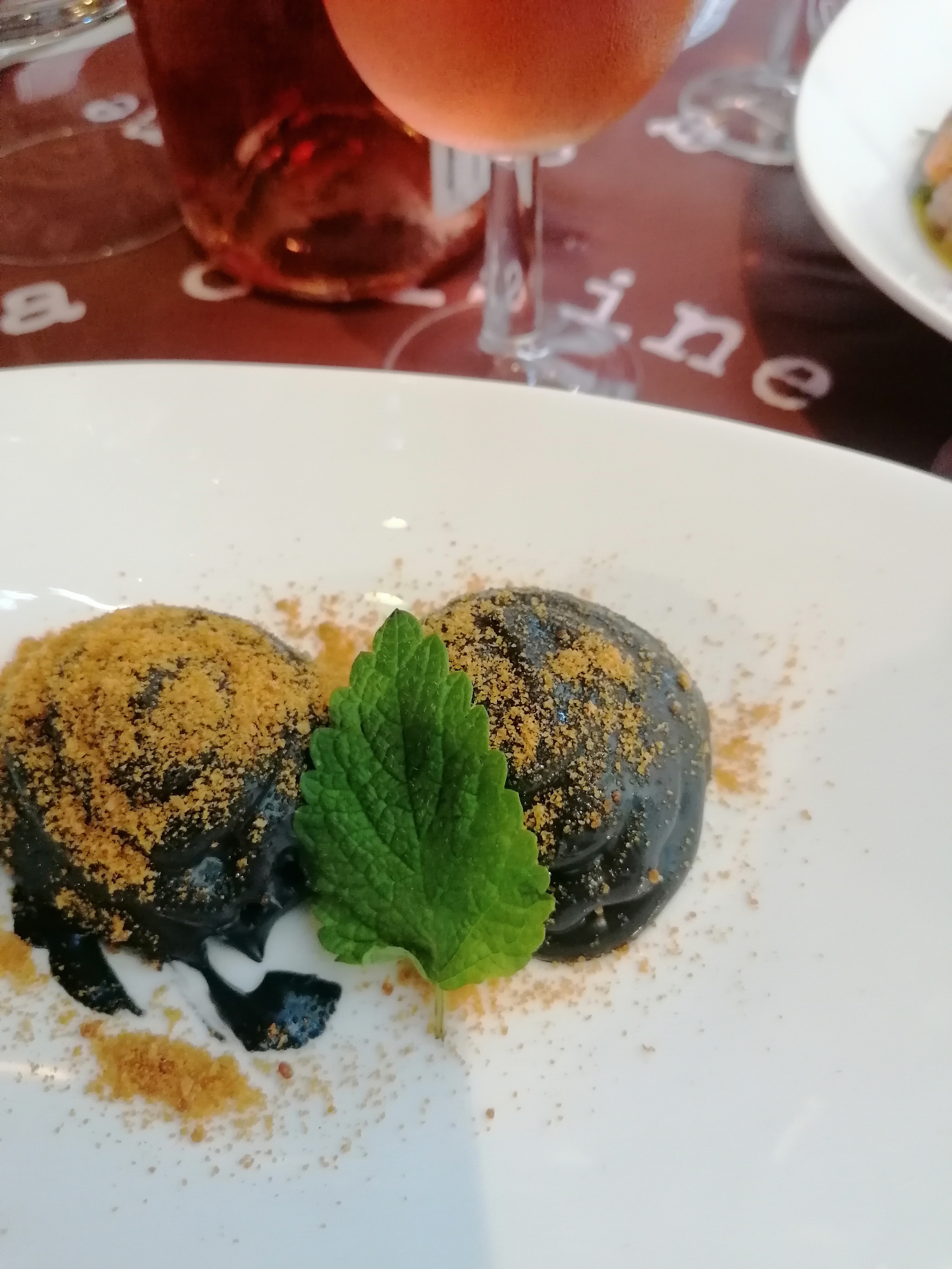 Déjeuner en amoureux lors d’une belle balade à Collioure. Il est des petits coins perdus dans les ruelles de Collioure où il faut s’arrêter absolument et la cuisine comptoir en fait partie. Gambas rouge simplement sautées à l’huile d’olive et fleur de sel, maquereau en gravlax et confit de citron en entrée. Comme un risotto de fragola sarda morilles et volaille, arroz negro et fruits de mer en plat. Fromage de chèvre demi sec confiture d’olives, chèvre affiné et cerises confites au Banyuls avec un bon verre de Rancio sec( une découverte pour moi). Bref une tuerie sous le figuier pour ne rien gâcher. Foncez-y