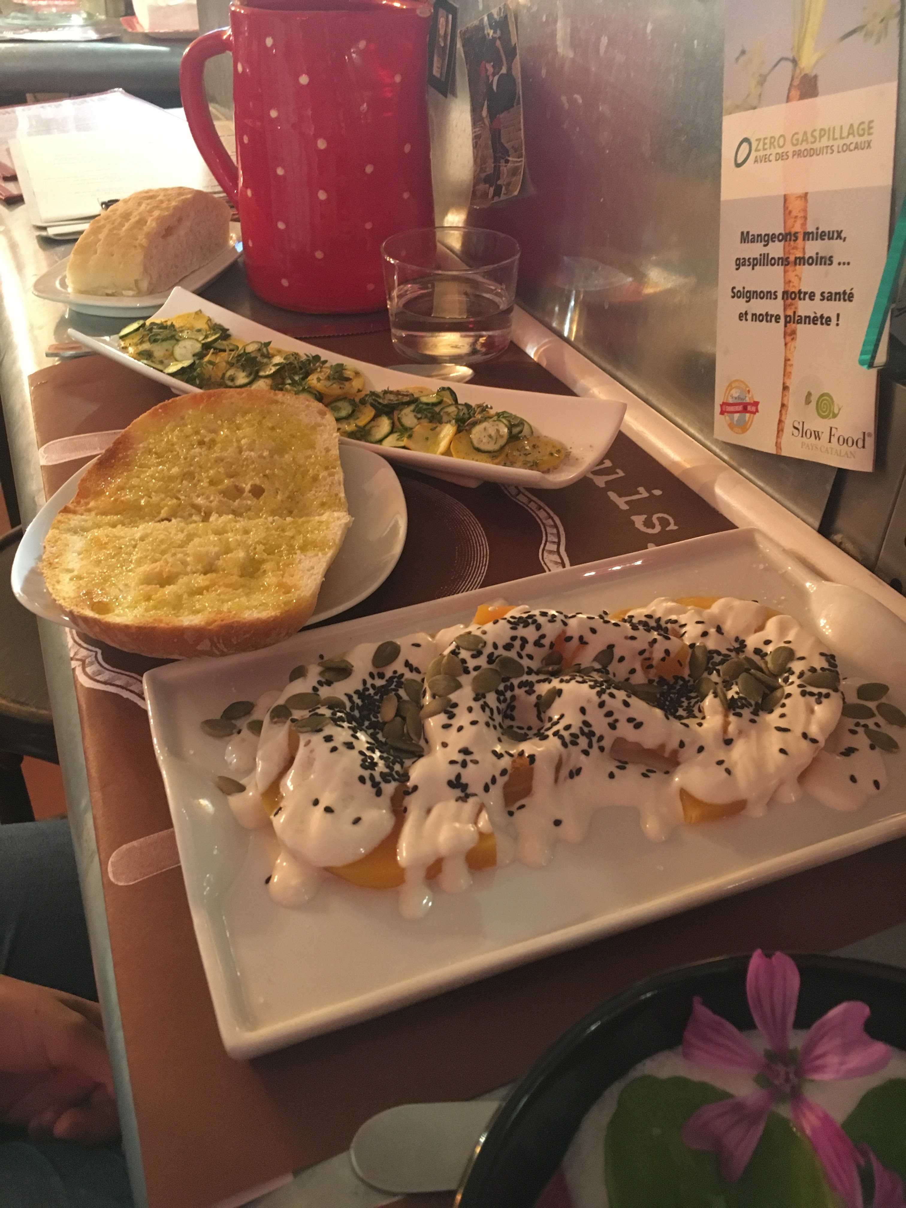 Belle découverte! Petit restaurant à l’intérieur atypique, terrasse ombragée adorable! Le serveur est accueillant, sympathique et connaît parfaitement sa carte que se soit les plats ou ses boissons. De bons conseils qui nous ont fait découvrir de très bons plats! Le choix végétarien est un réel plus! J’ai adoré mon dahl de lentilles ainsi que la ganache au chocolat et sa confiture d’olives! Pour ce qui est du prix, c’est je pense justifié quant aux ingrédients sélectionnés qui sont de la région et de qualité.