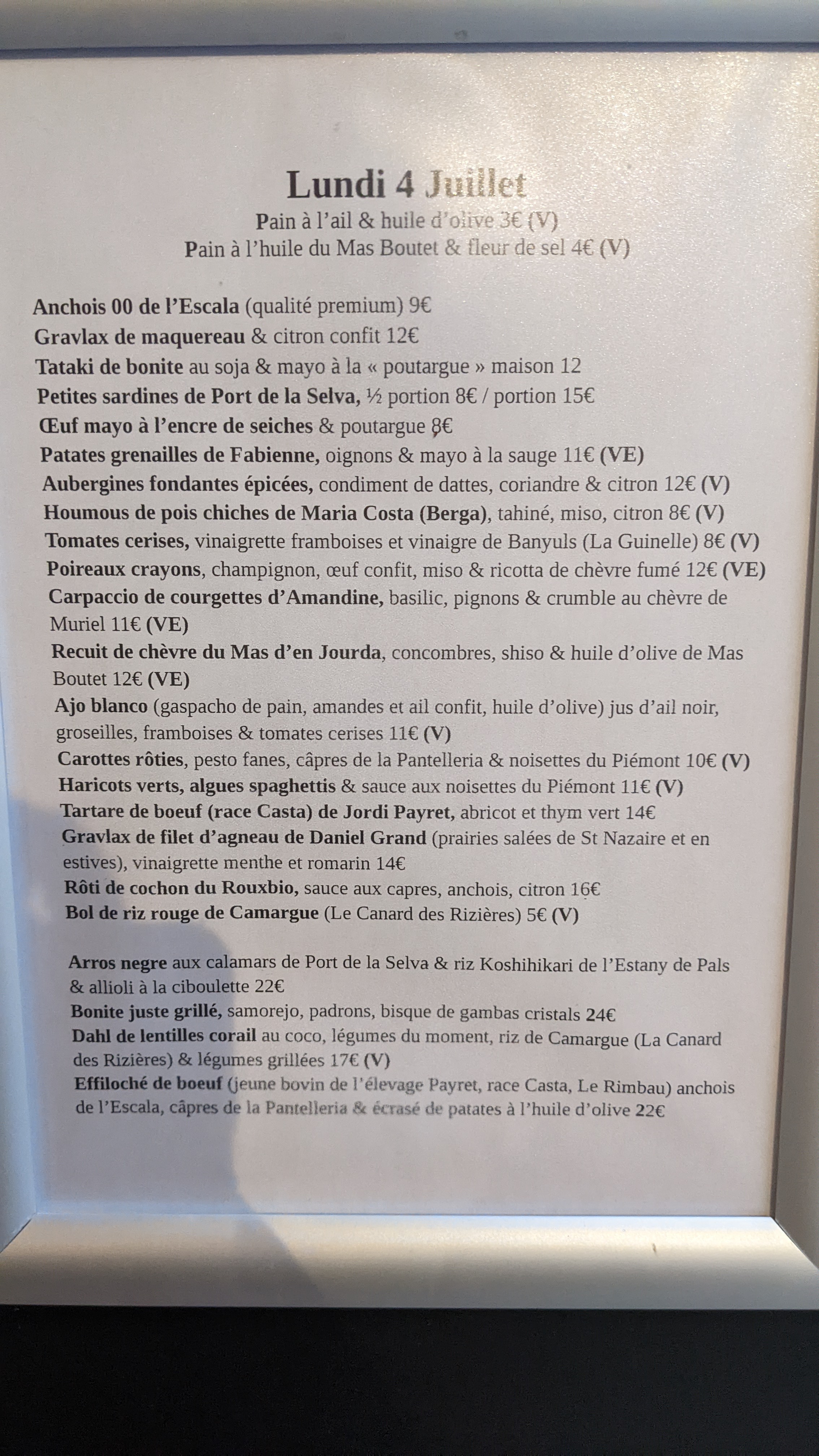 Alors c'est vrai, c'est un petit peu cher MAIS..... C'est vraiment très très bon, très frais, produits locaux, savoureux.....et on est à Collioure !! Un paradis pour les végétariens, car il a très peu de plats autres.... Et le pain à l'ail et huile d'olive, une merveille... Donc oui, un certain budget mais on passe un bon moment.....Je ne mets pas 5 * à cause du rapport qualité/prix...