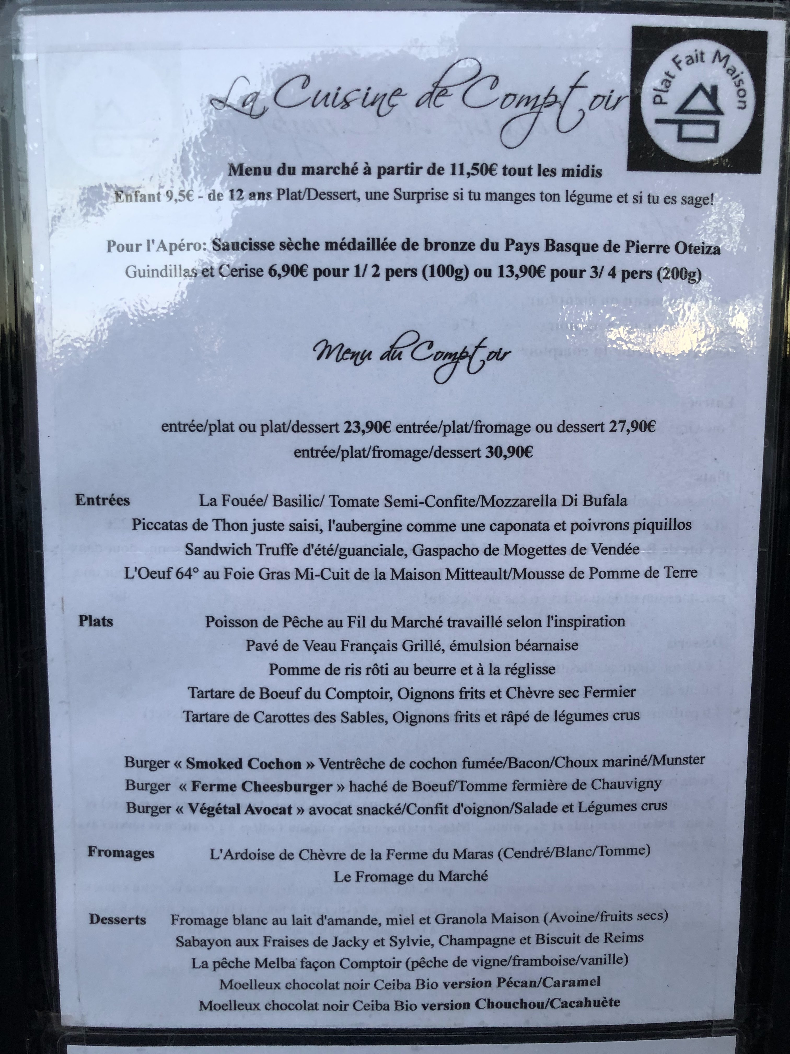 Produits de qualités très bon repas,mais très bruyant et également un super grand tableau pour afficher les menus cela prends une place monstrueuse devant la table et en plus la où les personnes assises en bout de table on pas la visibilité de moité bas de celui-ci..