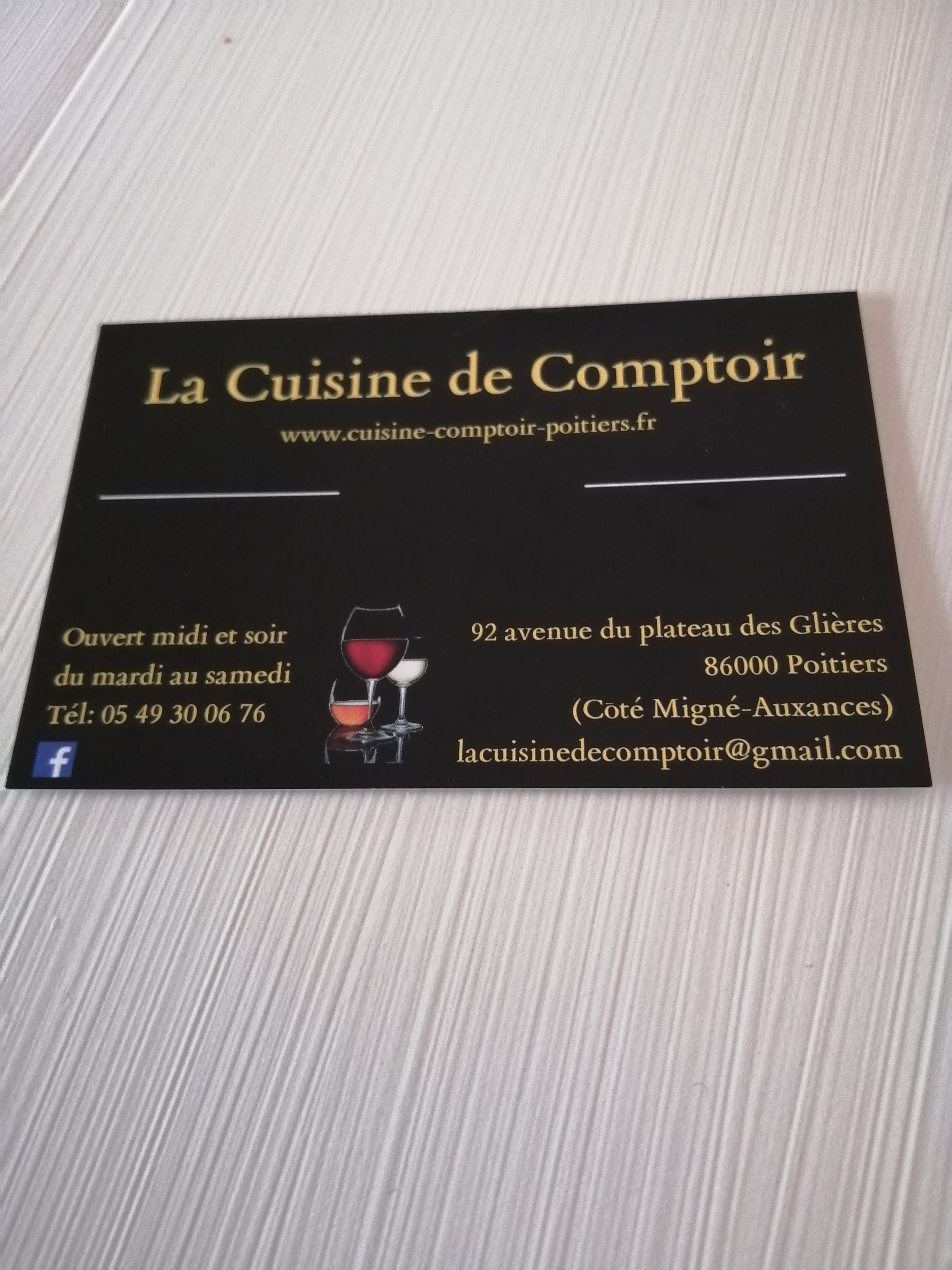 Voici toutes les informations sur le Restaurant français La Cuisine de Comptoir qui ce trouve au 92 Av. du Plt des Glières, 86000 Poitiers (86). Sur cette fiche vous trouverez les photos, l'adresse, les horaires d'ouverture, le numero de téléphone et les avis clients.Vous pouvez églement rédiger un avis si vous le souhaitez en bas de page.