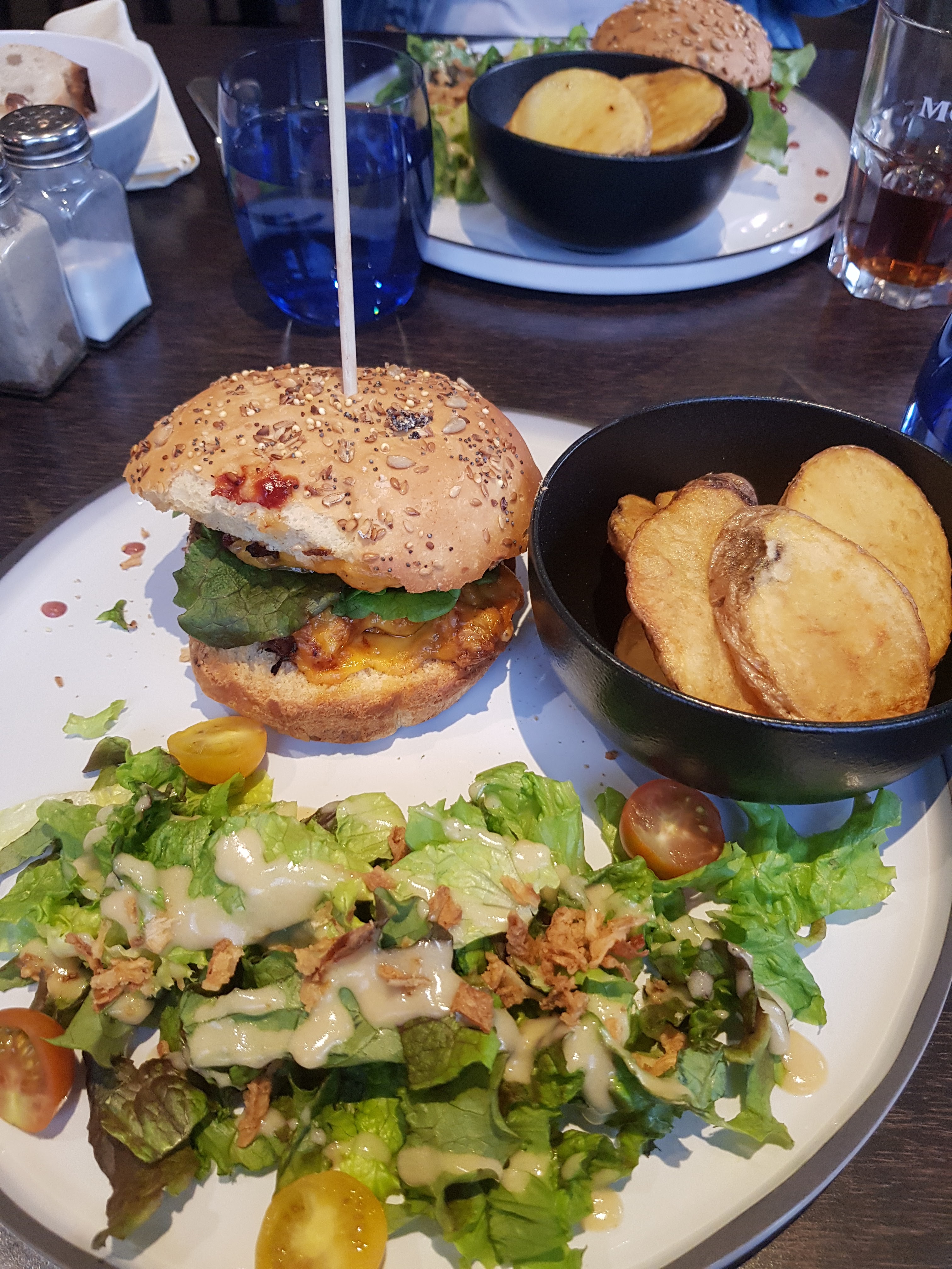 J’ai pris le burgers mozzarella pesto j’ai juste adoré servie avec des frites qui étais tout aussi délicieuse et une salade également savoureuse (graine de courge et oignons fris dessus ) J’ai pris également le cocktail sans alcool il était délicieux Quant au service très rapide et très accueillant et à l’écoute Je reviendrais et je recommande