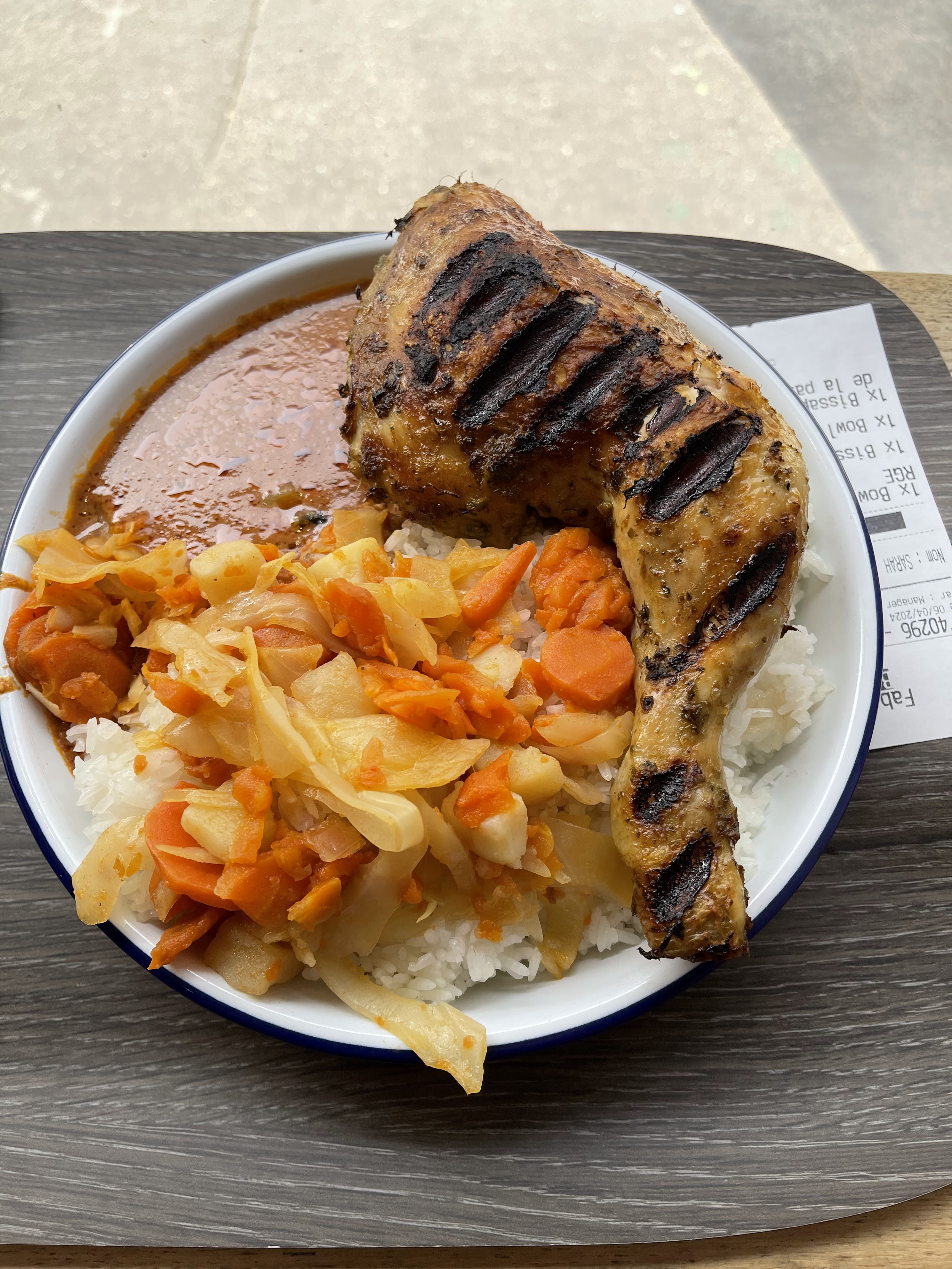 Je ne comprends pas vraiment les avis très élogieux. Le poulet était complètement cramé et donc sec et le thiep n’avait pas le bon goût du thiep… le bissap est par contre bon et les pastel aussi