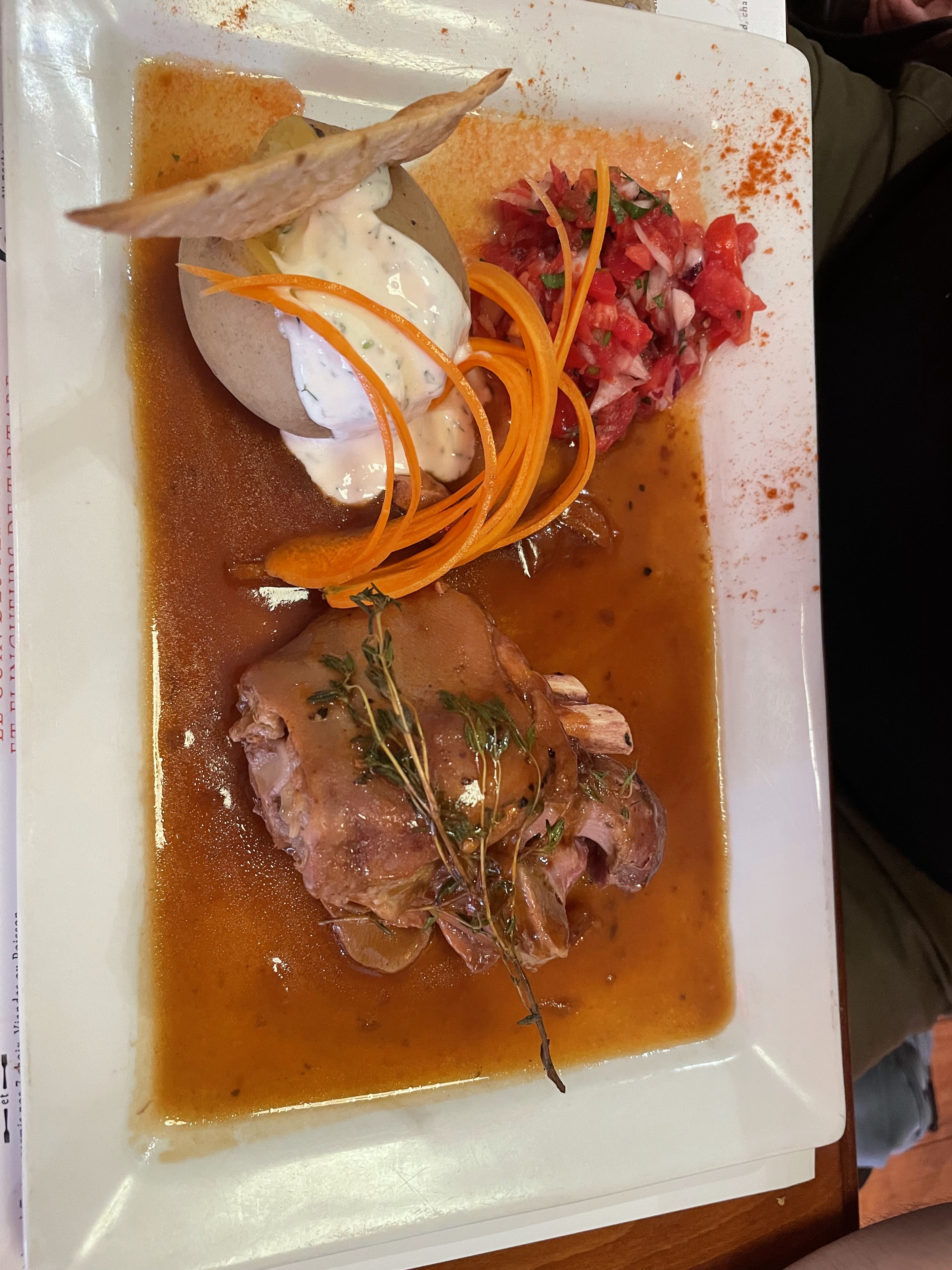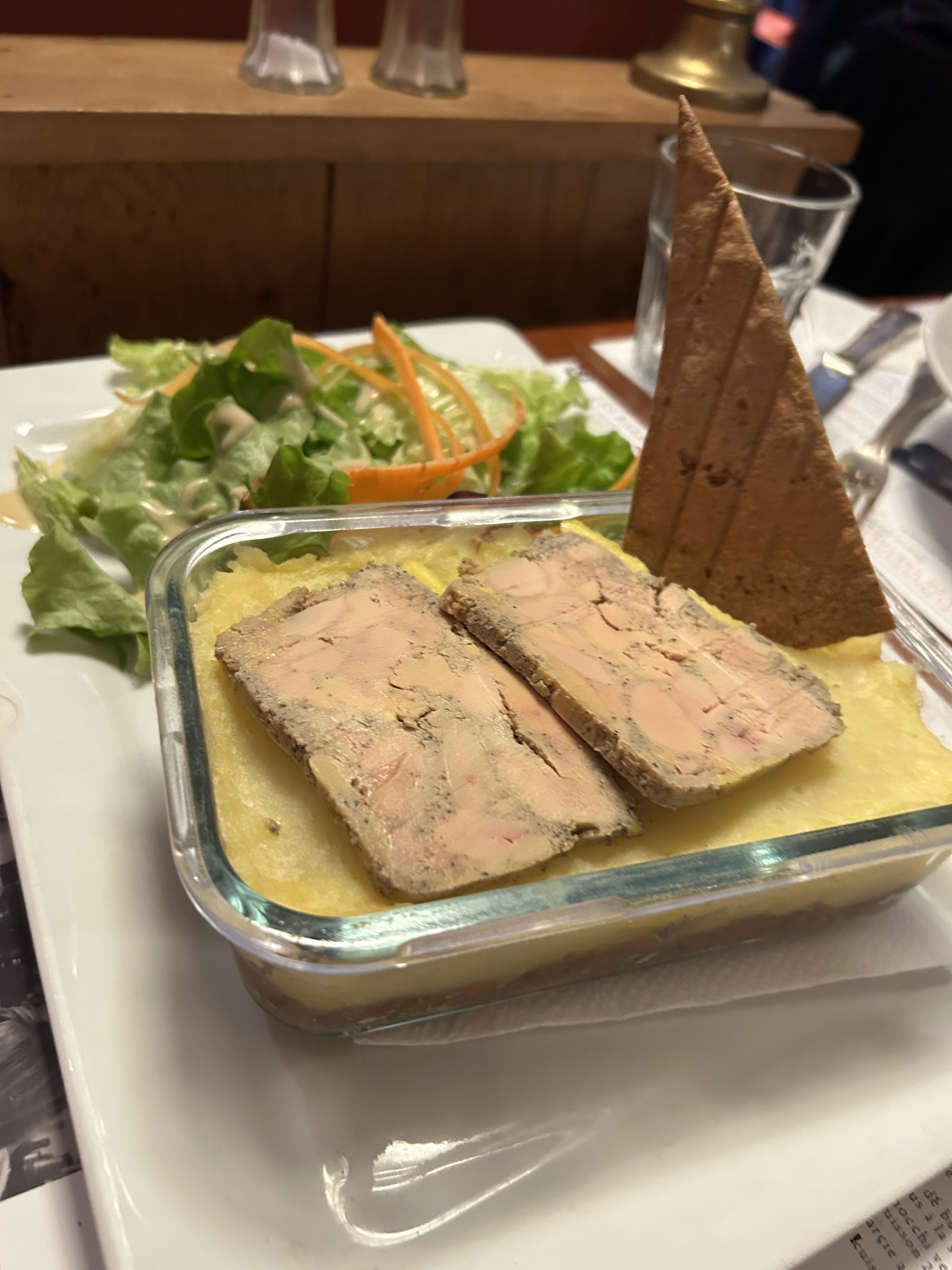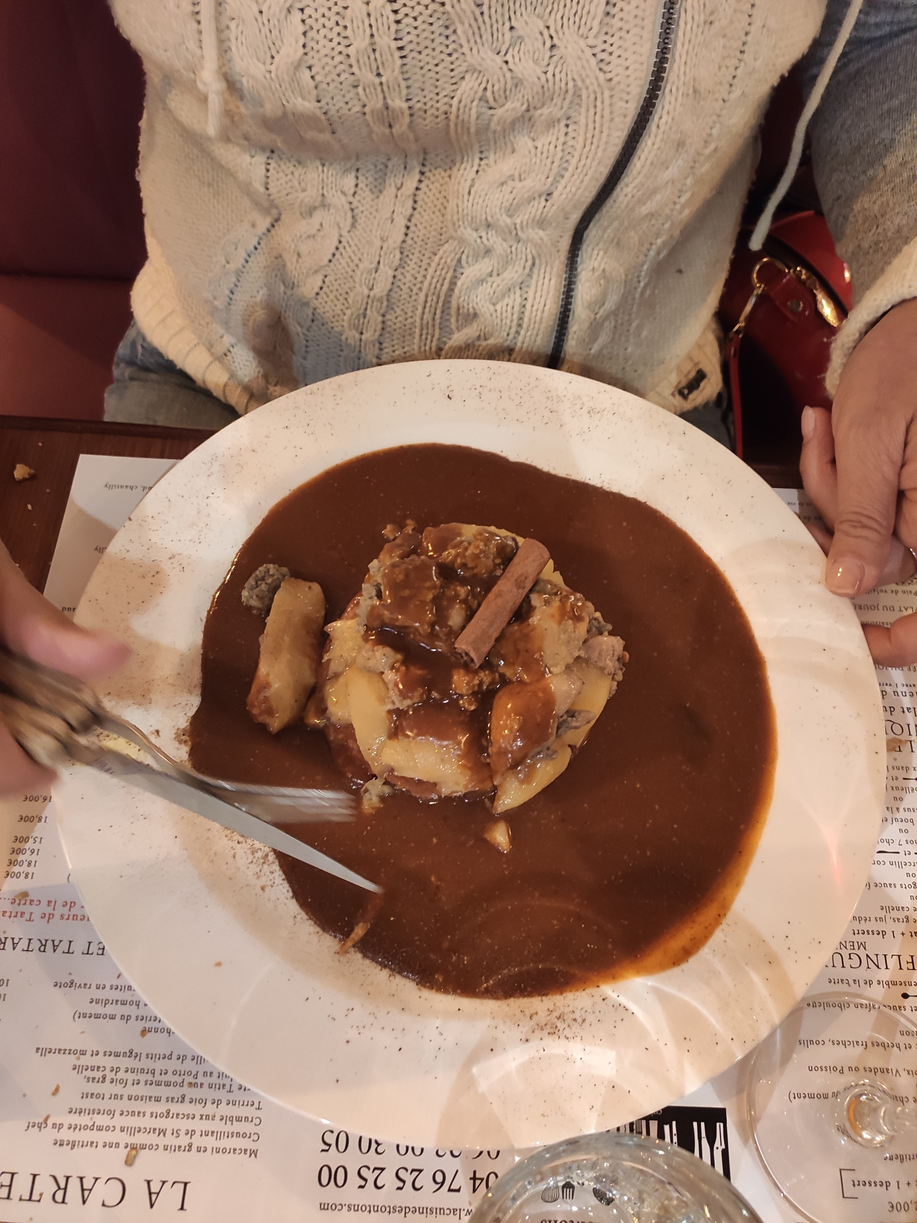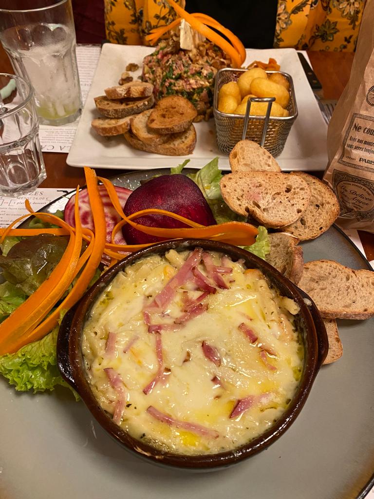 Pedimos un menú le pacha (terrine de foie gras sur toast, le petite surprise offerte par les cuistots, souris d’agneau fondante jus brun au romarin, un snookers à ma façon et un petit digestif création maison), unos macaroni en gratin comme une tartiflette y un jarret de cochon moelleux jus du plat au thym. Todo exquisito, muy buena cantidad y precios razonables. Muy contentos con el trato recibido y la comida consumida, sin duda repetiremos.
