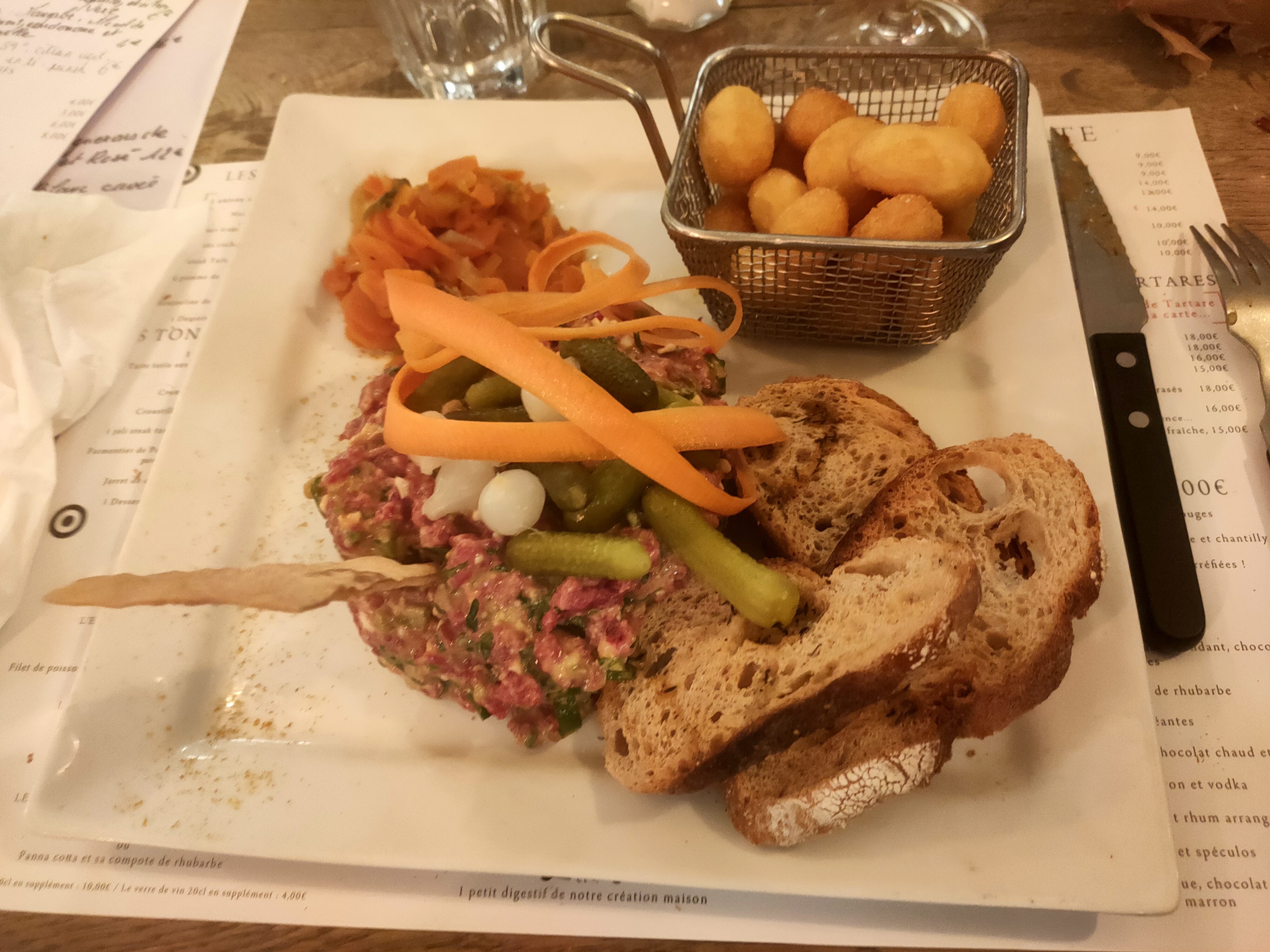 Au vu des bons avis sur ce restaurant, nous avons décider de nous rendre là-bas, service et entrées tops ! Cependant l'ambiance reste assez bruyante et les tables sont très très proches les unes des autres... Vient ensuite le moment du plat où nous allons pouvoir gouter ces dit super tartares, mais déçu : Beaucoup de persil et une sauce qui prenaient le dessus... Nous avions choisi le tartare avec les tartines de foie gras, peu de temps après nous avons tous les 2 été malades de fait que nous n'avons pas eu l'occasion de gouter les desserts. (Mais merci cpt à la serveuse qui s'est inquiétée de notre cas).