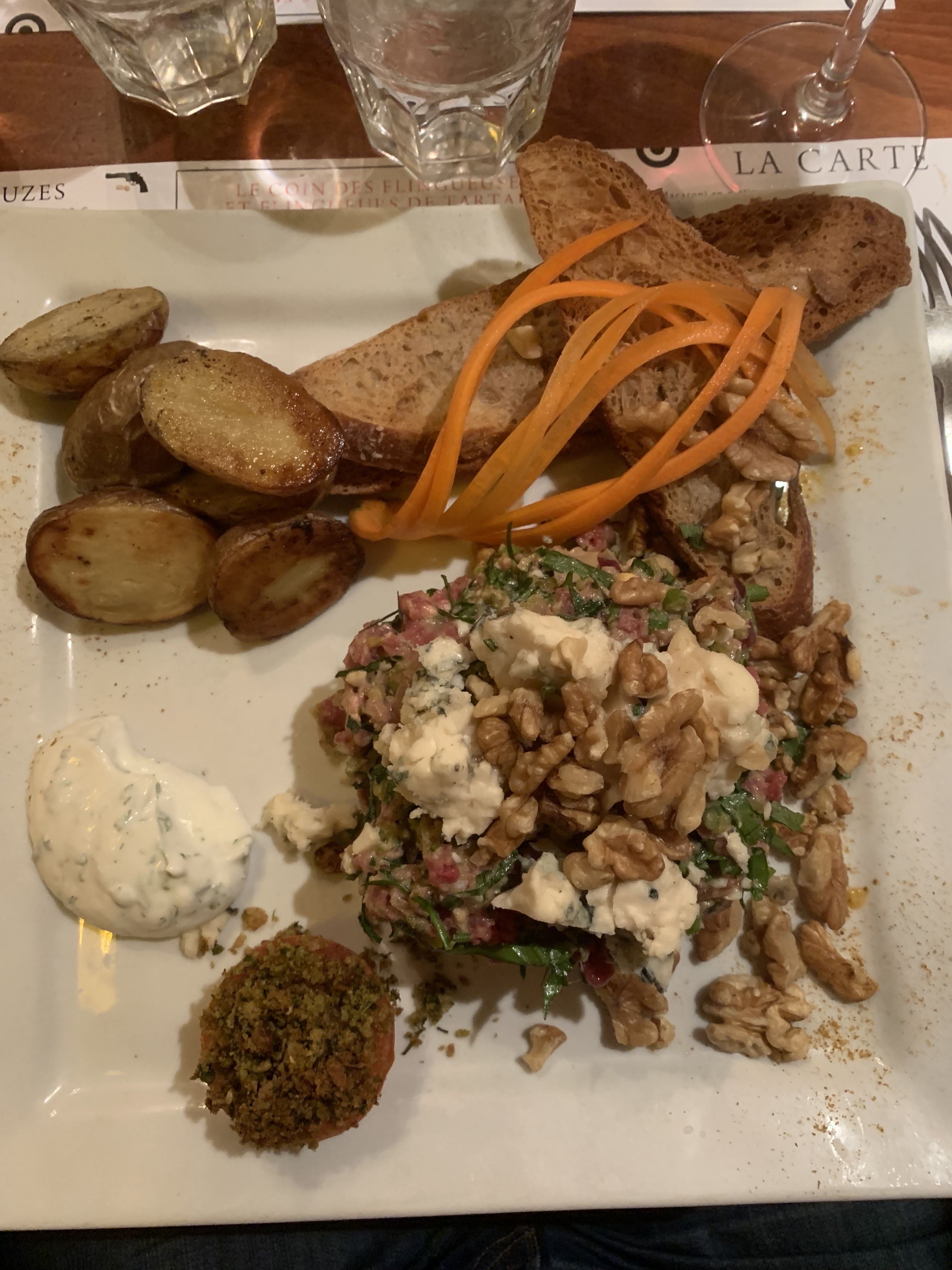 ABSOLUMENT À FAIRE ! Un must do à faire à Grenoble ! 20 euros entrée plat dessert café et verre de vin ! Assiette très copieuse et délicieuse Leur tartare sont excellents !!! Je recommande absolument !!!!
