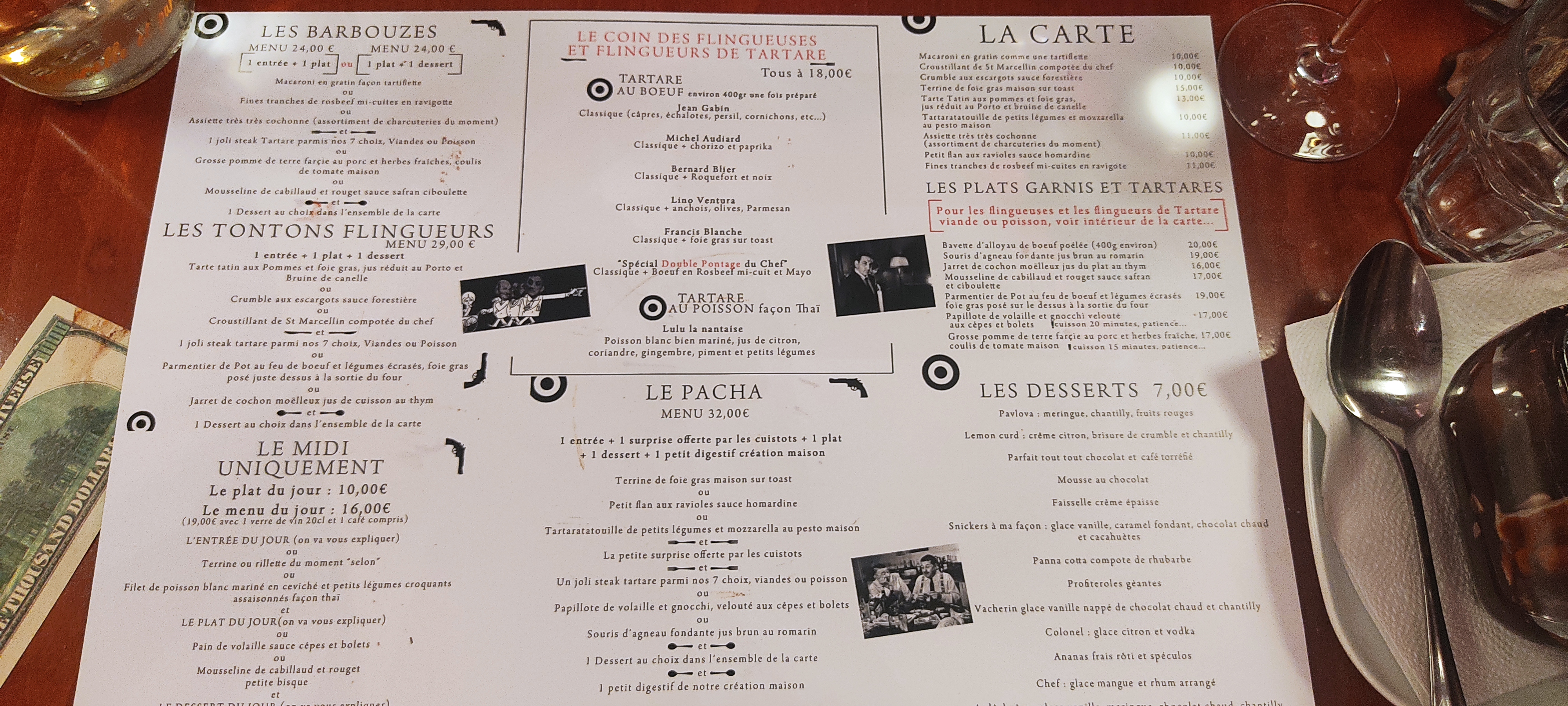 Restaurant atypique avec un thème tonton flingueur bien présent. J'ai pu essayer leur steak tartare dont on m'avais venté la qualité et quantité. Je n'ai pas été déçu, le repas était très copieux, un large choix de tartare est disponibles (différentes variantes) mais le reste de la carte a également l'air appétissant ! Un accueil très agréable et chaleureux par le personnel du restaurant. Il faut néanmoins penser à réserver, le restaurant est souvent plein.