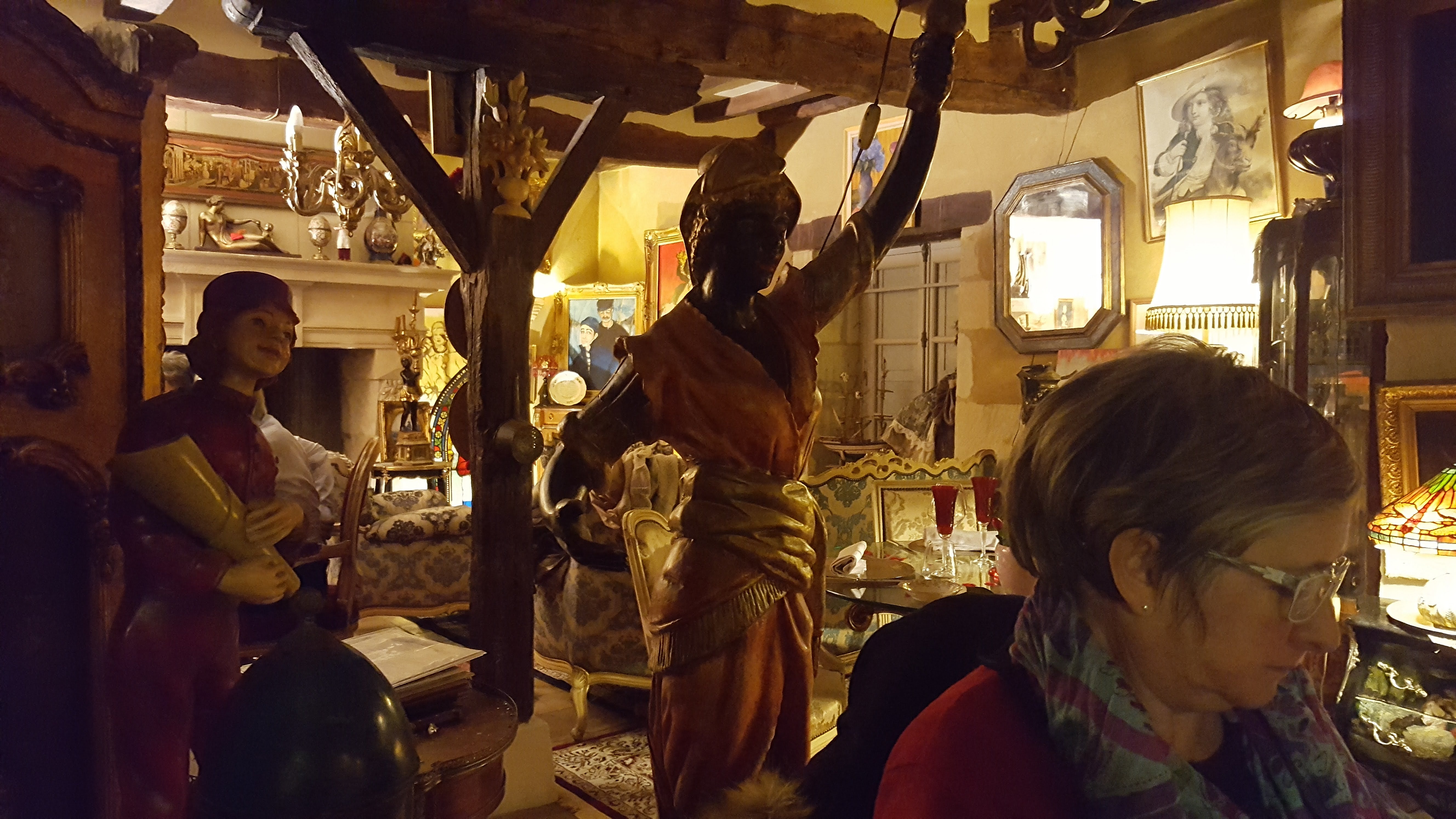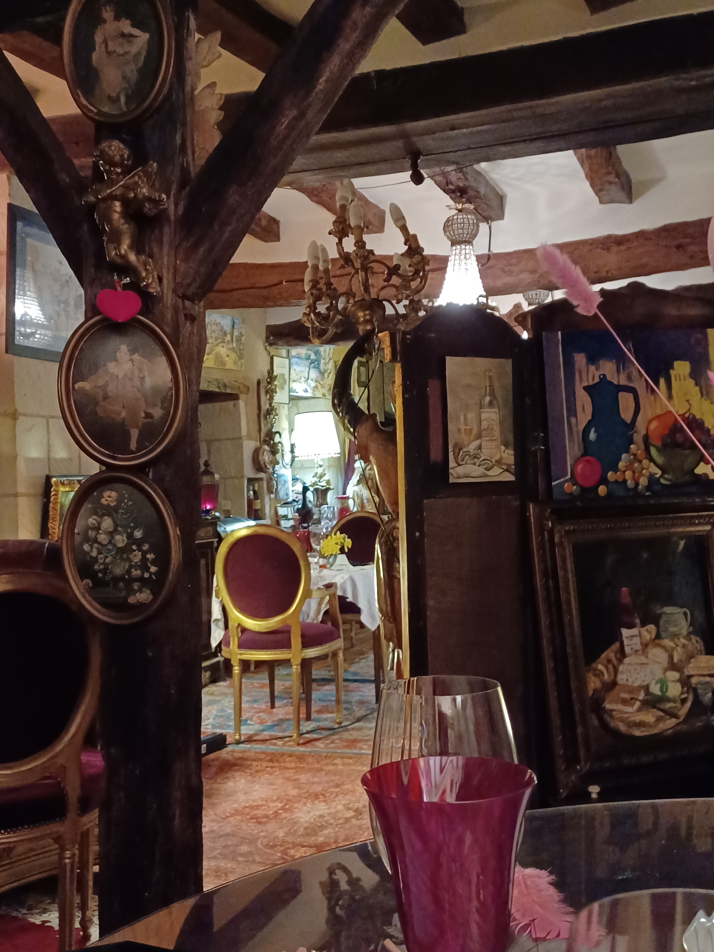 Insolite, atypique, étonnant, dépaysant, irréel…les adjectifs manquent pour qualifier cette maison ! Car il faut bien parler de maison : aucune publicité tapageuse, ni aucune enseigne aguicheuse pour vous attirer dans ce logis à l'arrière du château ; vous êtes alors chaleureusement accueilli par le maître des lieux qui vous fait entrer dans son univers après avoir traversé la cuisine ; et là, vous plongez dans son cadre intime d' un autre monde, transporté dans un autre siècle par l'ambiance sonore, votre table dressée au milieu d'un décor indescriptible en raison de tout ce qui y a été rassemblé par votre hôte au long de son parcours, autant sur les murs qu'autour de vous, à tel point que vous avez plutôt l'impression de festoyer au milieu d'un musée… Vos papilles gustatives ne seront pas en reste : après les amuse-bouches variés et copieux, vous dégusterez les mets simples mais excellents et joliment présentés, de l'entrée au dessert, préparés par ce grand chef, sans oublier de déguster sa célèbre gallimafrée, une de ses spécialités ! Et puis, à lui seul, Michel Belcour mérite votre visite : à la fois maître d'hôtel, chef-cuisinier, serveur et conteur, il n'a qu'une ambition : vous faire plaisir ! Alors, allez-y vite, car malgré son empressement et son allure alerte, le personnage accumule les années, et il ne faudrait pas que lui vienne l'idée de prendre une retraite pourtant bien méritée ! N.B. : indispensable de réserver, car seule une dizaine de convives peut en profiter…