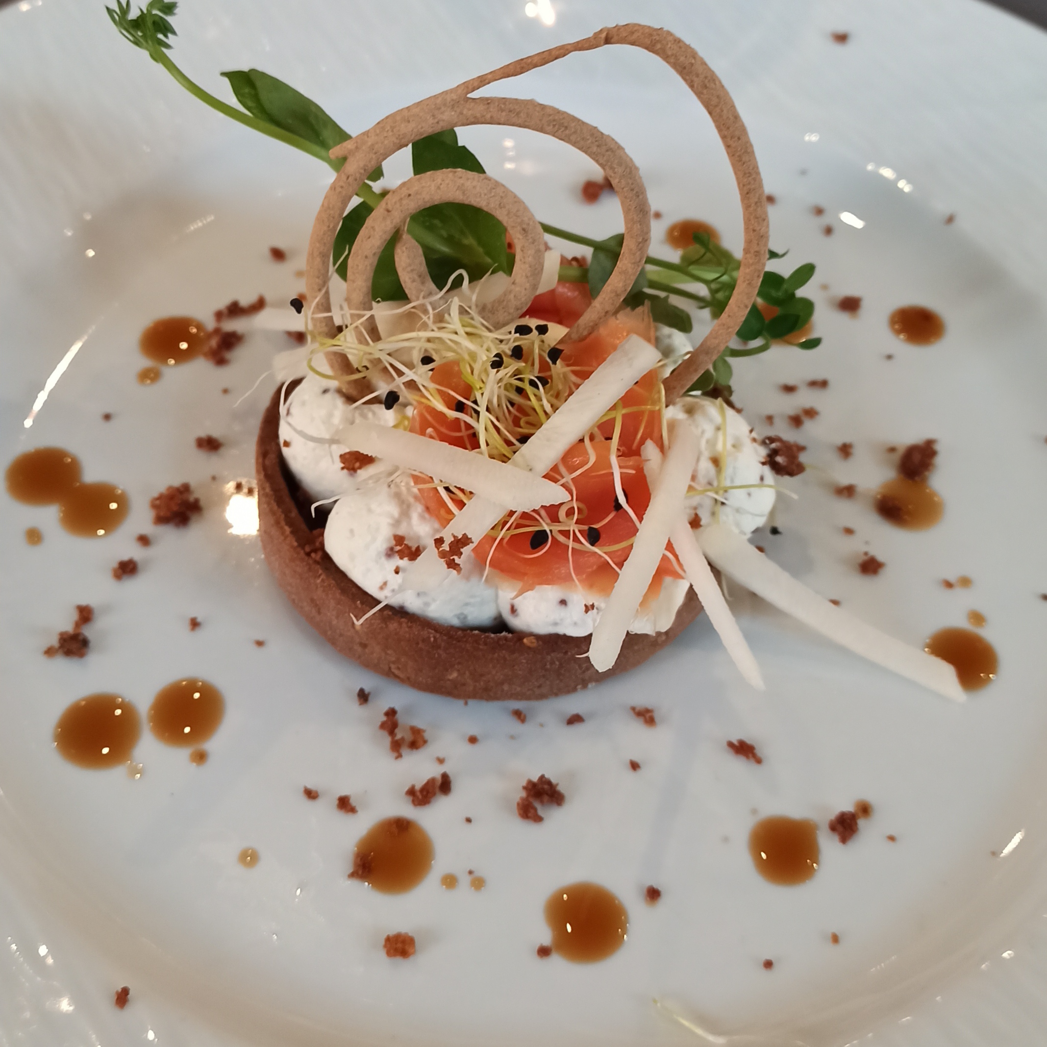 Bons produits mais peut mieux faire avec juste de petits ajustements sur une présentation plus soignée et régulière entre les assiettes. Accueil top. Bons conseils sur les boissons en fonction des plats. Un peu chaud à l'intérieur. Ne pas laisser les gens fumer à côté de la porte d'entrée car l'odeur de fumée entre.
