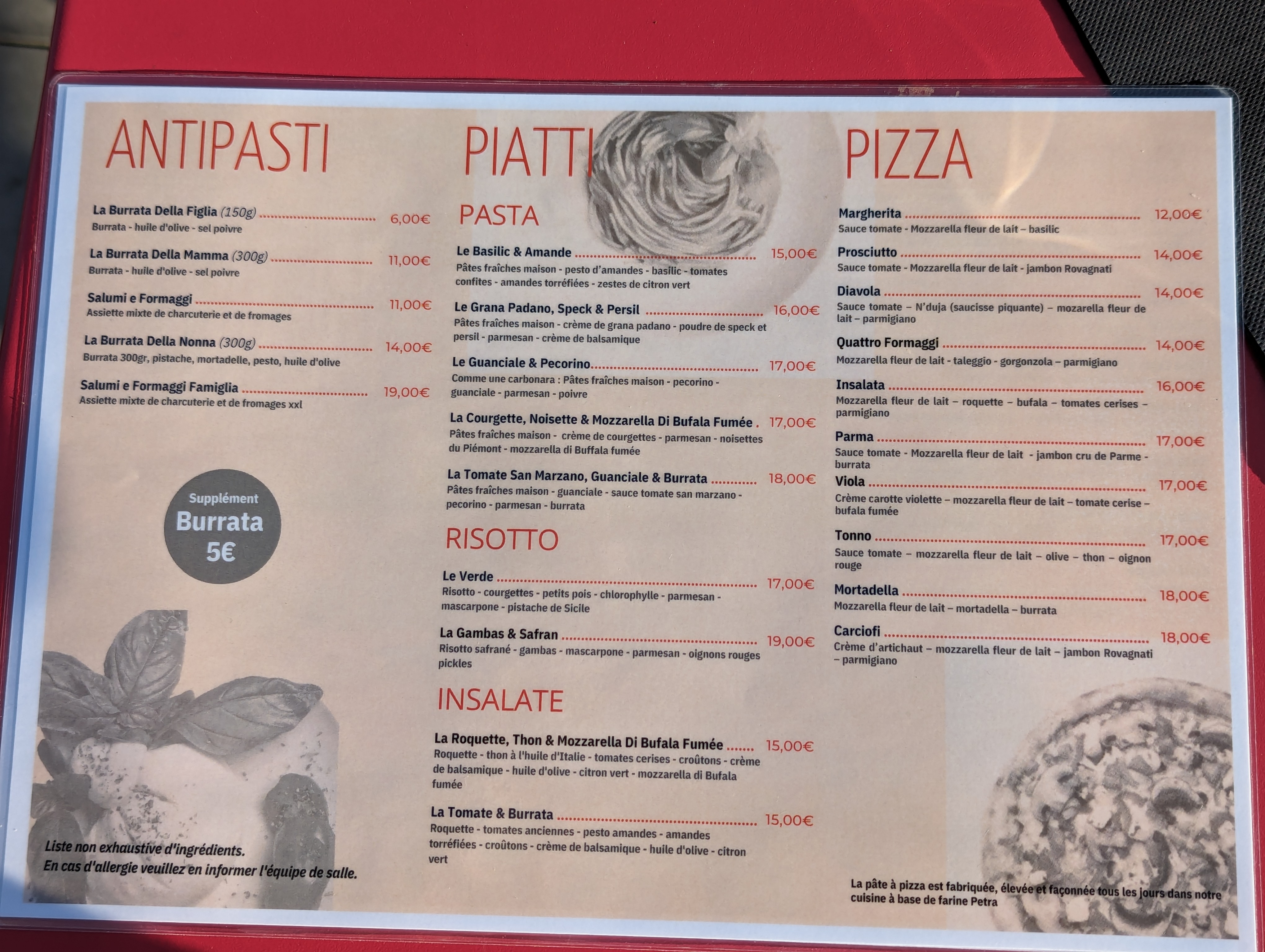 Je vous écris ce commentaire 10mn après notre sortie du restaurant, depuis les bornes du Burger King d’à côté tellement ce repas était décevant. La planche à 17€ amenée en 30sc chrono après que nous ayons commandé, bien fraîche sortie du frigo. Rien d’italien, de la rosette et du jambon de supermarché. Le risotto « Gambas et Safran » où ces pauvres gambas trônent au milieu d’un riz où je cherche toujours le goût du safran. Les pâtes au guanciale n’ont pas eu le droit à plus de 3 morceaux de guanciale. Pourtant, les commentaires étaient plutôt positifs et nous n’avons pas un palais gastronomique, souvent satisfaits d’une cuisine basique tant qu’elle est bien réalisée. Ce qui n’était pas le cas ici.