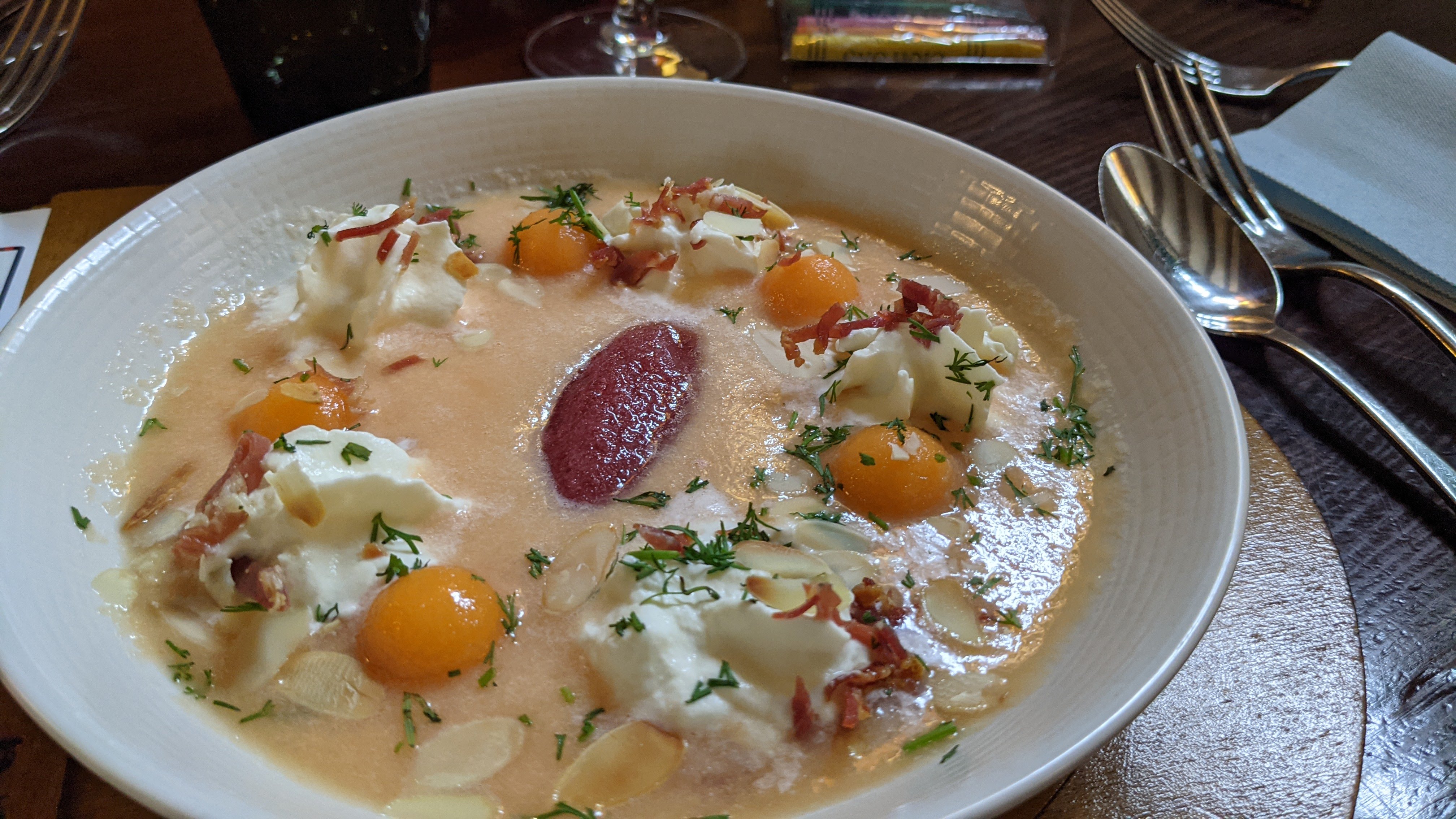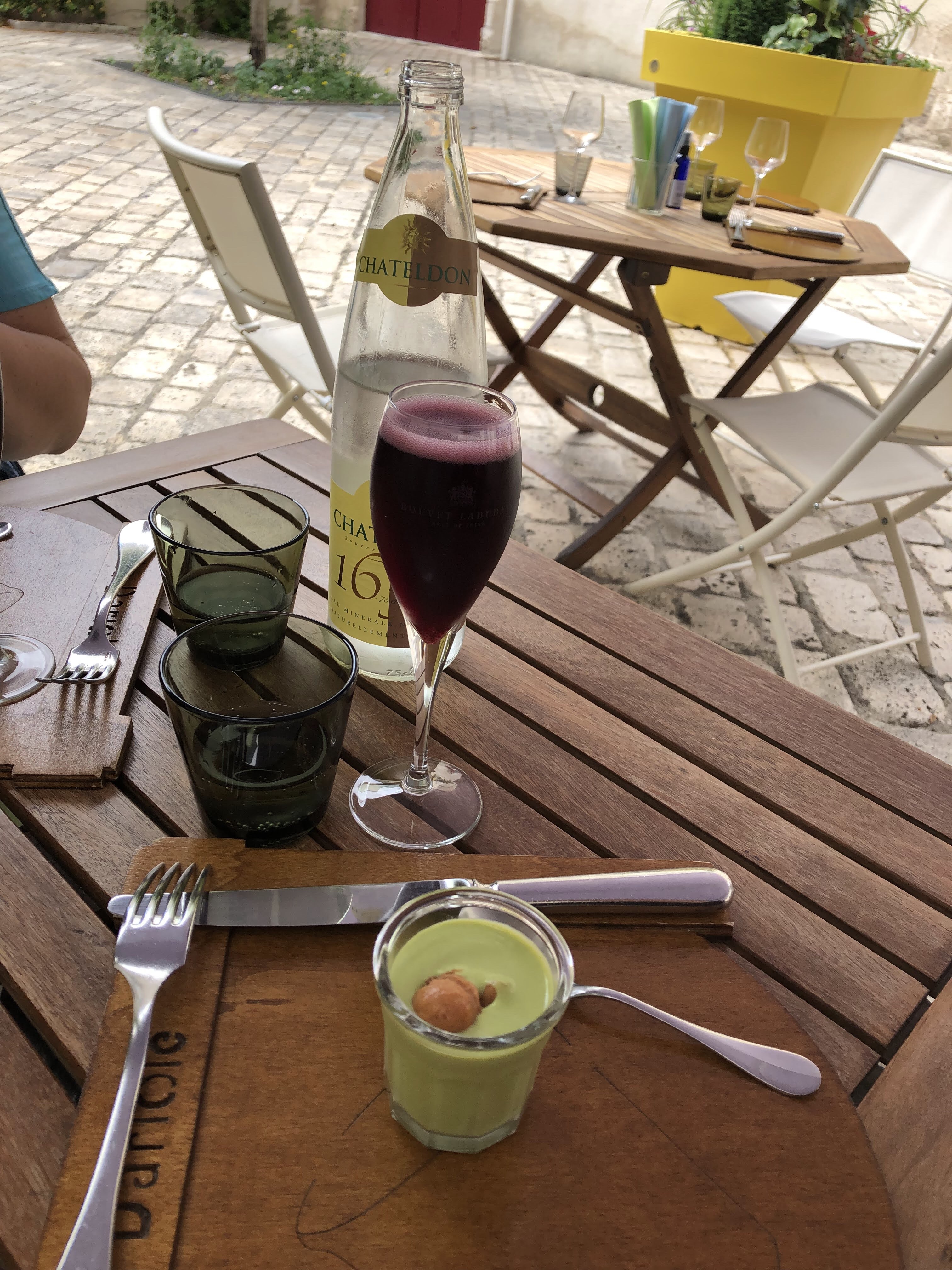 Un menu entrée + plat donne un repas sans vin ni café mais avec apéritifs et eau gazeuse a 37€ par personne (juin 2021). Bon restaurant a la cuisine réussie mais aussi charmant tant à l’intérieur qu’en terrasse située sur une jolie petite place à l’arrière du bâtiment. Les cuissons des viandes et poissons sont réussies et le goût est au rendez-vous. Le menu semble changer fréquemment aussi je ne commente pas chaque plat dégusté. Néanmoins nous gardons un bon souvenir d’un velouté froid de melon au sorbet Porto et des préparations à base de petits pois servies en amuse bouche ou accompagnement du poisson. Le service est attentionné