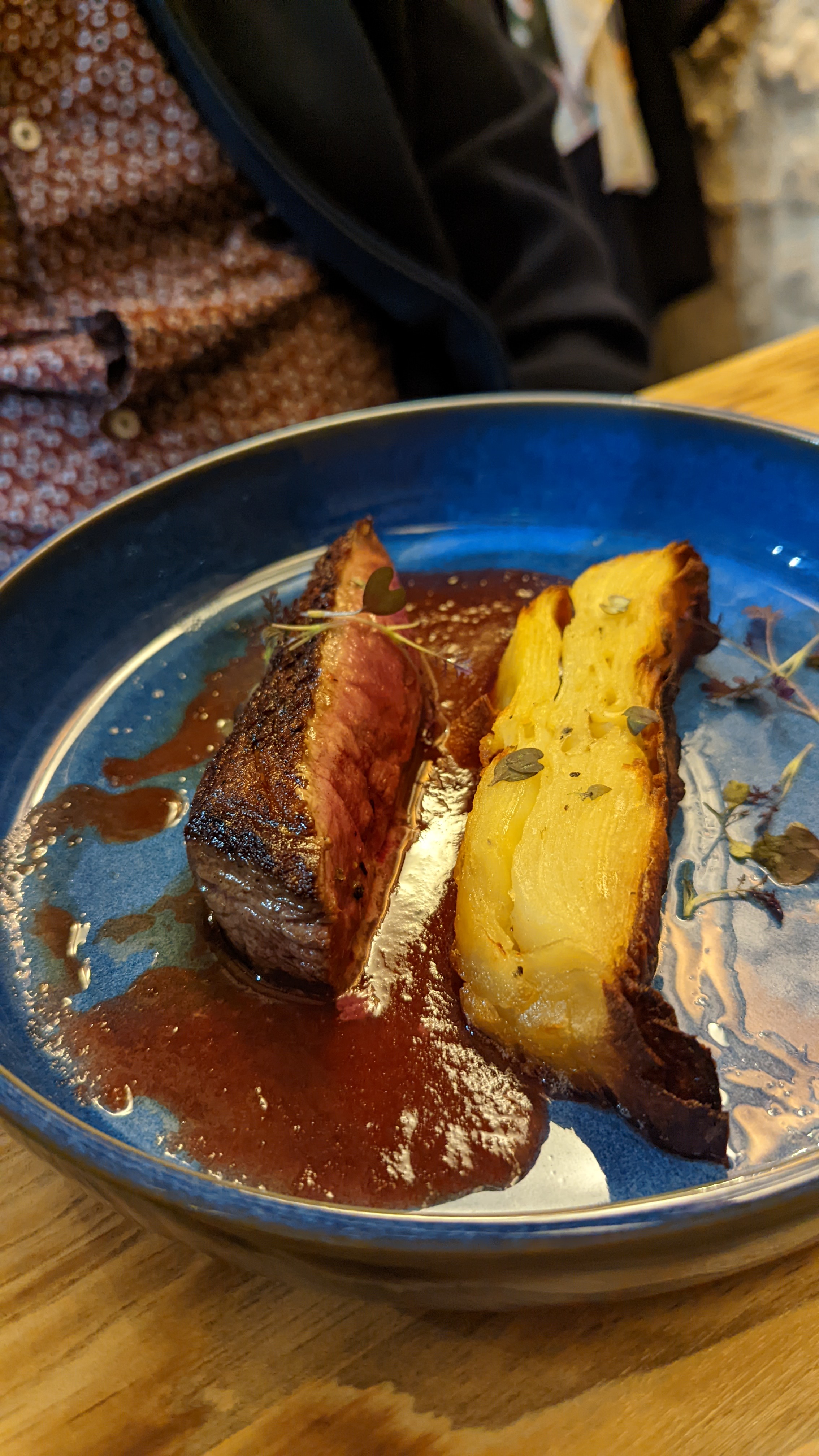 Entrée très goûteuse , plat de viande excellent, dessert bof Mais le prix est à mon avis 10€ trop cher . Les vins hors de prix Les portions minimalistes .