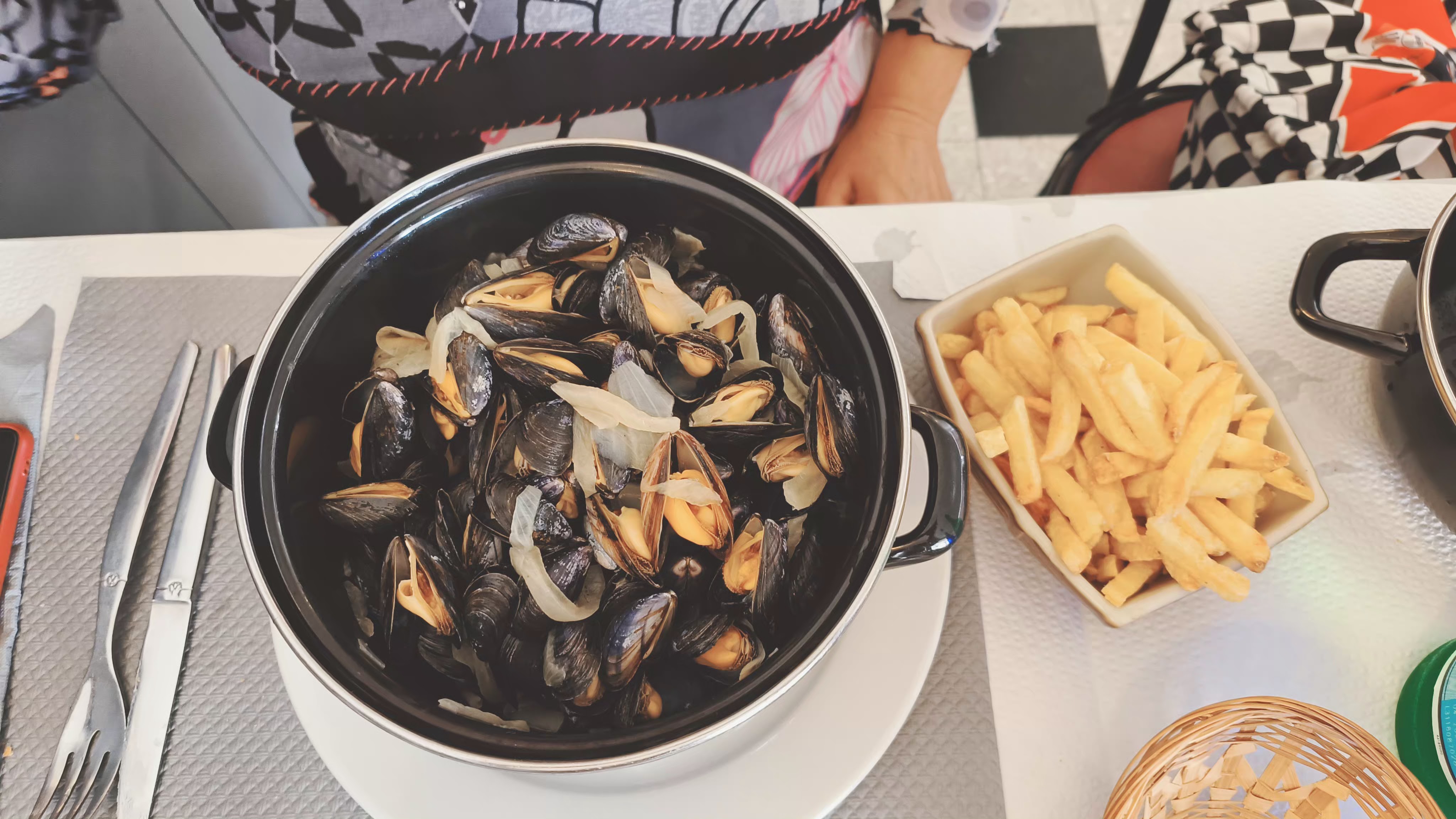 Super endroit pour déjeuner sur la route des vacances... moules cuites et servies dans des poêlons individuels, frites maison... bien détendu pour reprendre la route