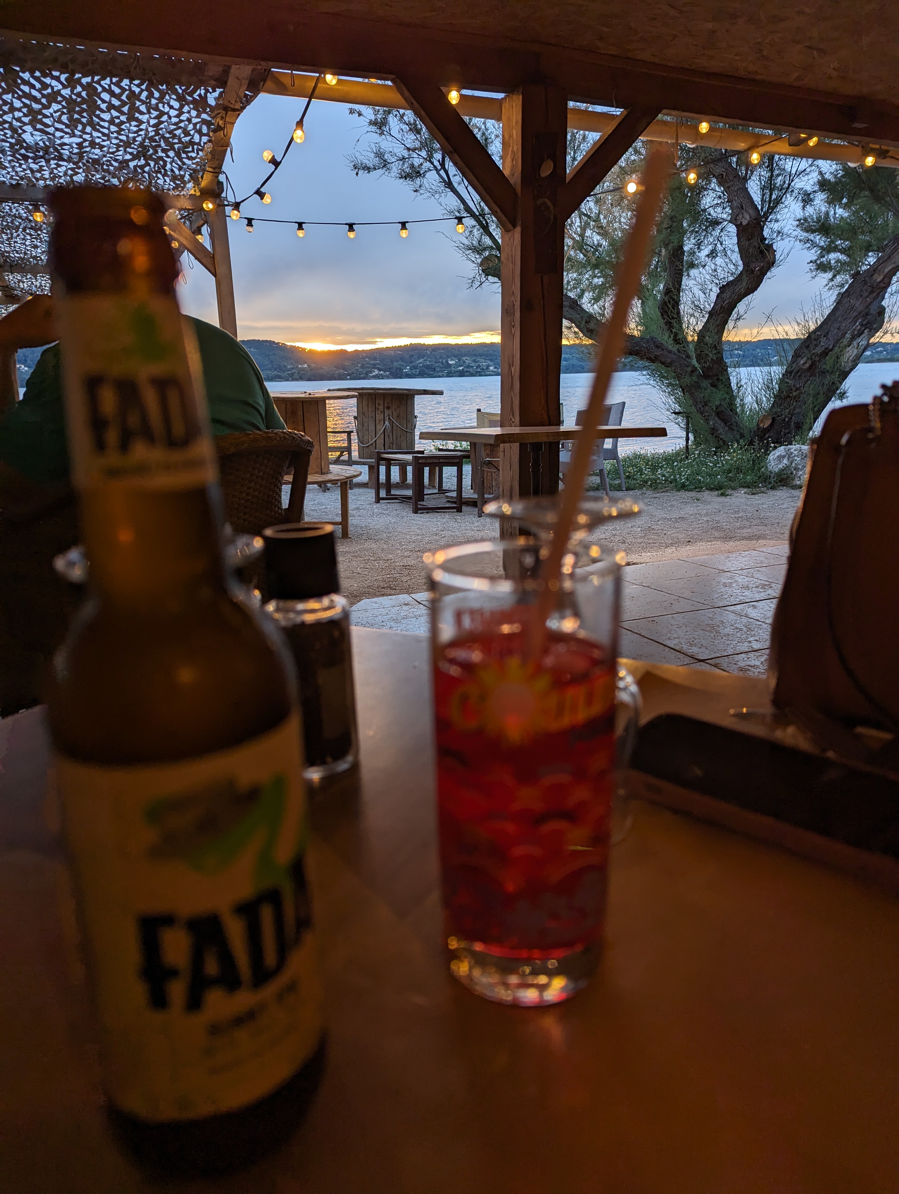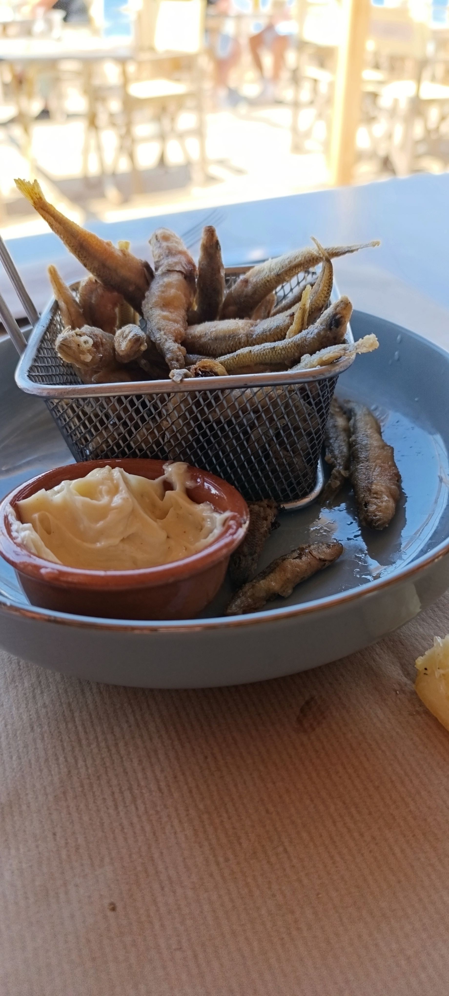 Je suis vraiment déçu par notre repas ici. Nous sommes venus à 20h un dimanche, avec une réservation donc ils nous attendaient (table de 3, tous adultes). Nous avons commandé nos cocktails et nous avons pu regarder lecoucher du soleil... tout allait bien our l'instant. Au bout d'un moment, on a remarqué que les serveurs (l'un d'eux était peut-être le patron) étaient très en colère et ont commencé à se crier dessus. Cela a mis les clients environnants (et nous) assez mal à l'aise. Notre serveur est devenu assez nerveux à cause de cette expérience, et il a pratiquement oublié que nous existions. Il était environ 22h quand nous avons finalement dû demander le menu et prendre notre commande pour notre repas. Nous avons attendu DEUX HEURES avant qu'ils prennent notre commande pour notre nourriture. D'autres personnes qui étaient venues après nous ont commencé leur dessert au moment où nous avons eu le menu pour LES PLATS PRINCIPAUX. Finalement, à 22h30, nous avons reçu notre nourriture, et nous avons été très déçus par la qualité. Pour 22€ on s'attendait à ce que le fish and chips soit fraîchement préparé, avec de vraies frites. C'était définitivement du poisson congelé et des frites qu'ils avaient frites pendant 10 minutes avec une petite salade triste à côté. Les pâtes au pesto burrata étaient dégoûtantes. En plein été, ils n'utilisaient même pas de tomates fraîches, mais plutôt une boîte de tomates avec plein d'eau, sans sel ni assaisonnement, et une boule de mozzarella dure (et bien sûr sans pesto). Je pense que la seule chose que vous payez vraiment, c'est pour la vue et même dans ce cas, vous feriez mieux de prendre un filet de poisson McDonald's et de le manger sur la plage devant le restaurant. Cet endroit ressemble à un piège à touristes et je resterais à l'écart si vous voulez une vraie expérience de qualité avec de la bonne nourriture.