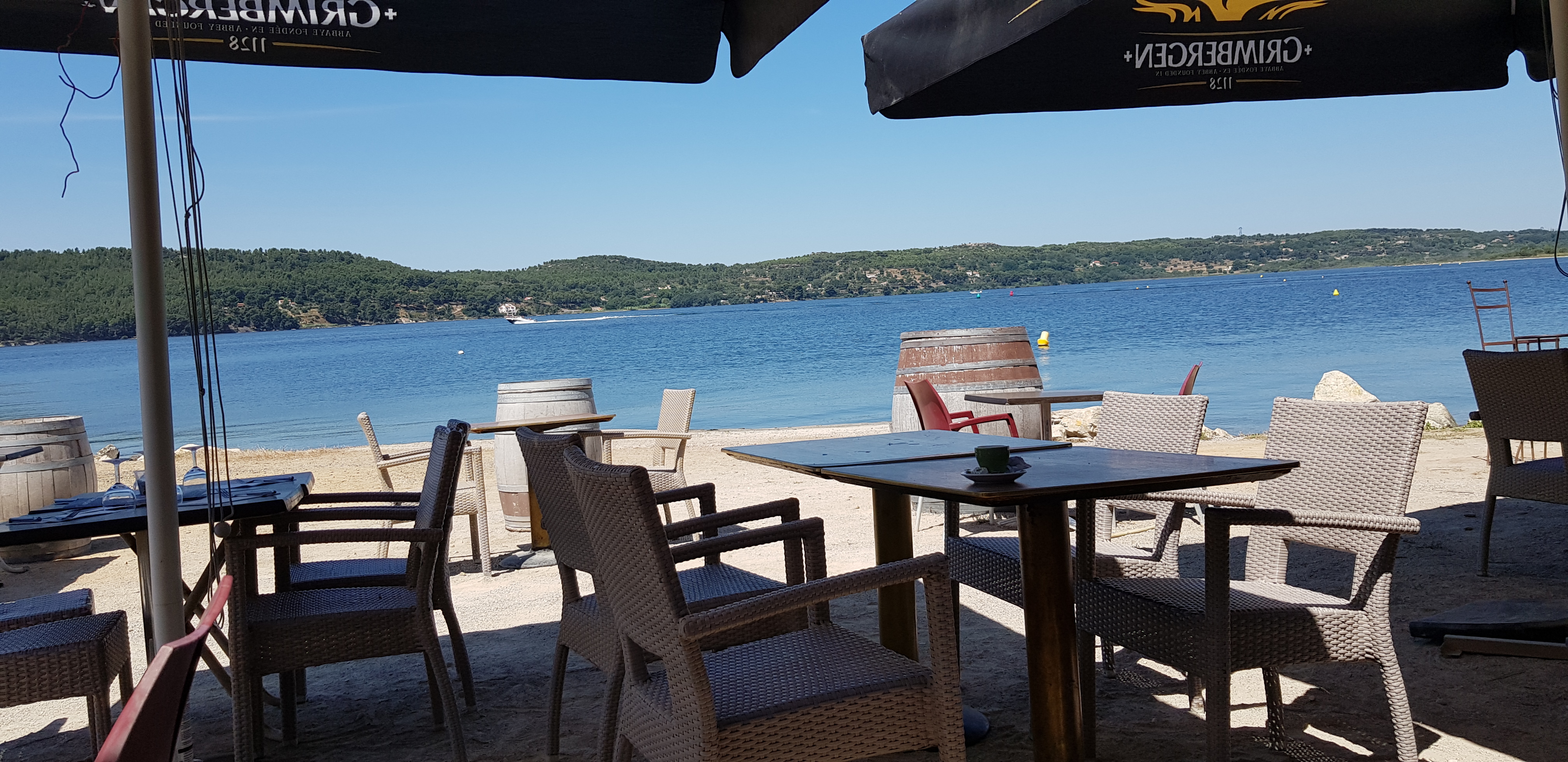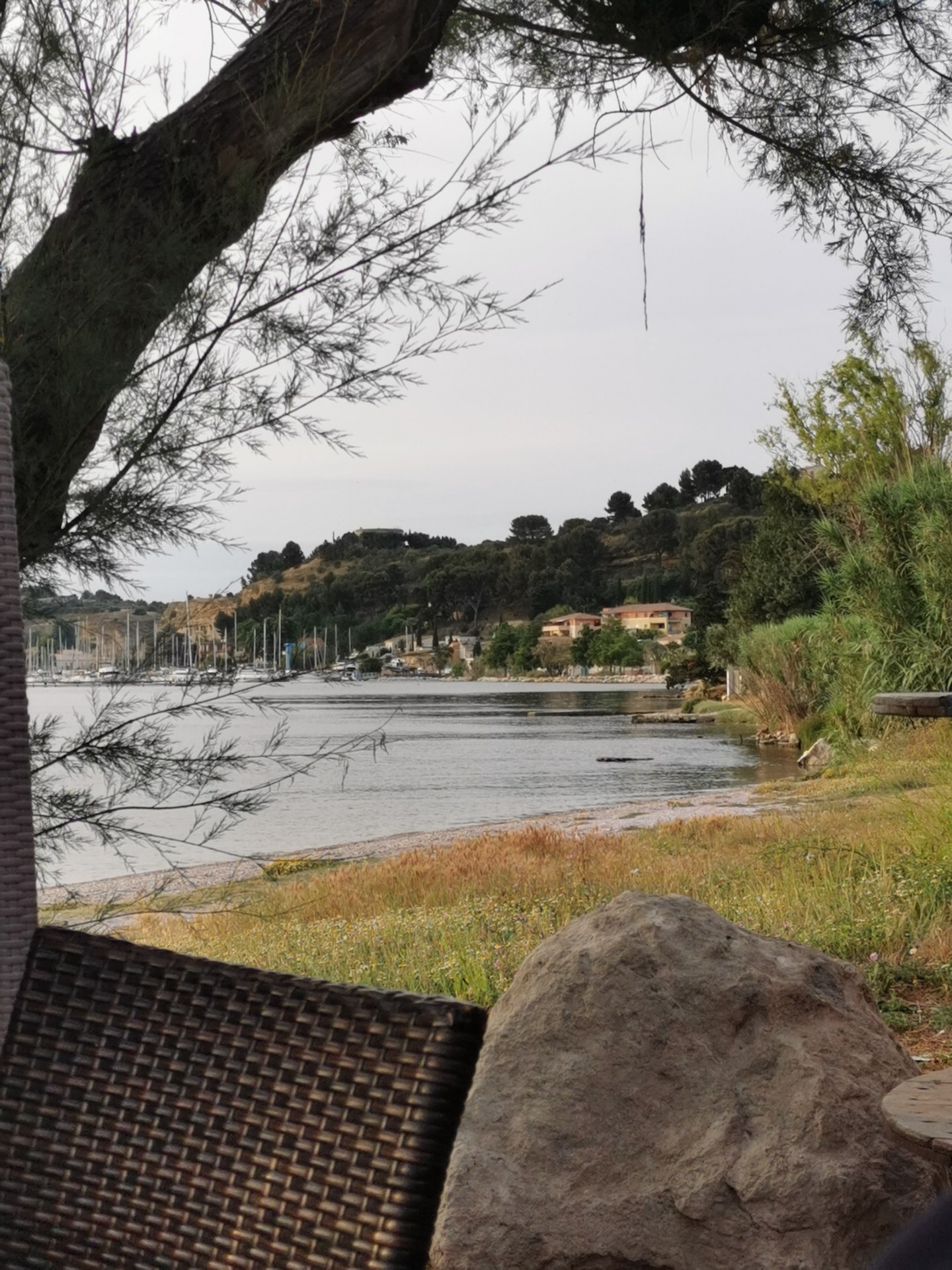 Grâce au Covid-19, nous étions seuls à table sur la terrasse avec magnifique vue sur l'étang. Nous avons fait un excellent repas acheté au restaurant LES EAUX CLAIRES à ISTRES. Nous avons débarrassé la table mais avons laissé les fauteuils pour montrer que nous sommes bien venus 😄