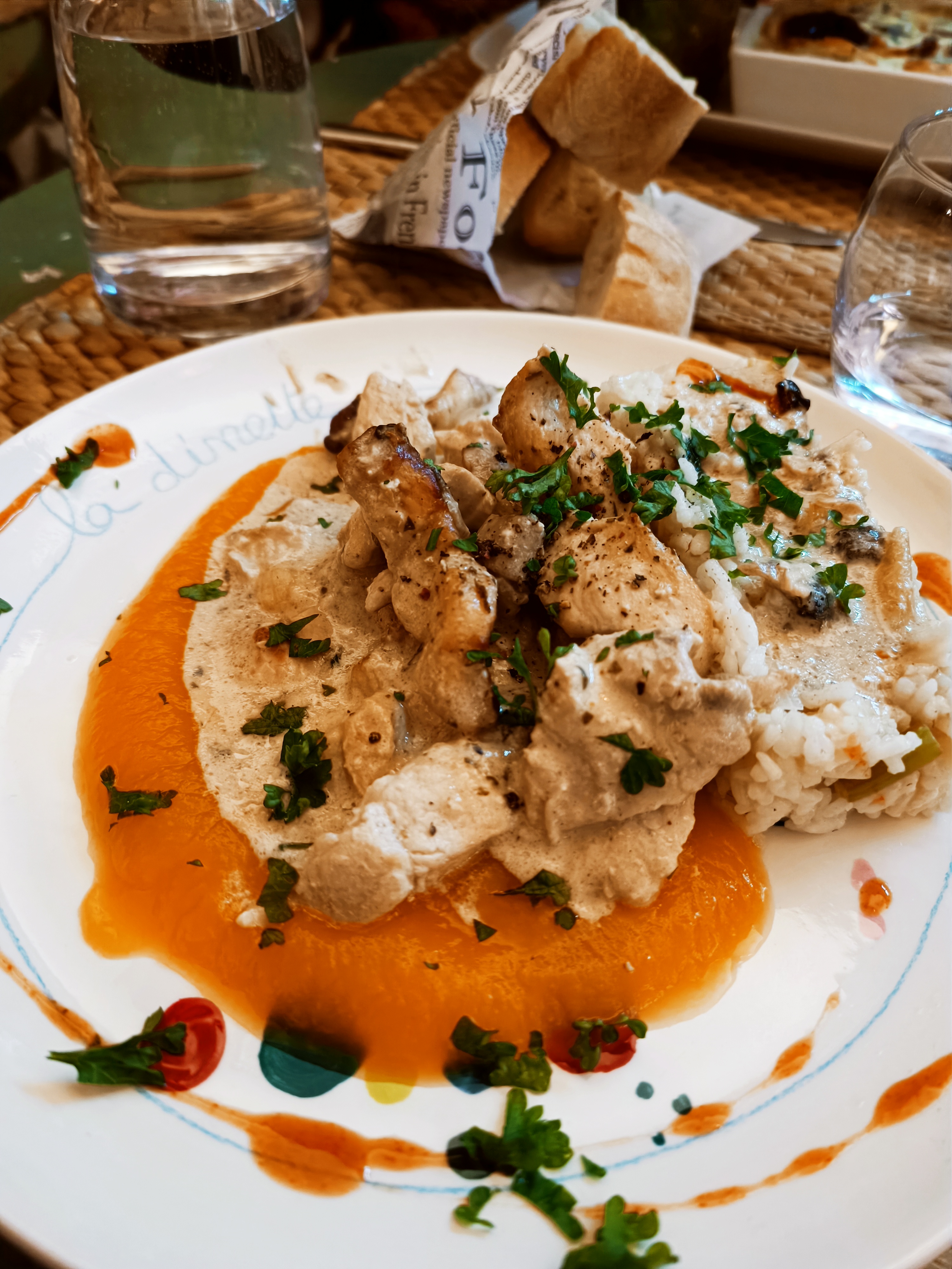 Accueil chaleureux, plats délicieux avec une total maîtrise des cuissons de la viande, bravo c’est très rare de déguster un si gros filet de poulet en restant ultra tendre et fondant. Le clafoutis m’a renvoyé en enfance dans les jupes de ma maman 🥰 La générosité dans les plats et dans vos précieux conseils de cuisine. Prendre le temps en plein service d’échanger sur ses recettes c’est du jamais vu ! Quand au tarif : 1 copieux filet de poulet et son accompagnement + 1 grosse part d’un succulent clafoutis pour 17€ ! Je ressort rassasiée et mon porte monnaie se porte à merveille. Après une longue promenade dans le marché du jeudi, une adresse génial pour vous restaurer et vous régaler !