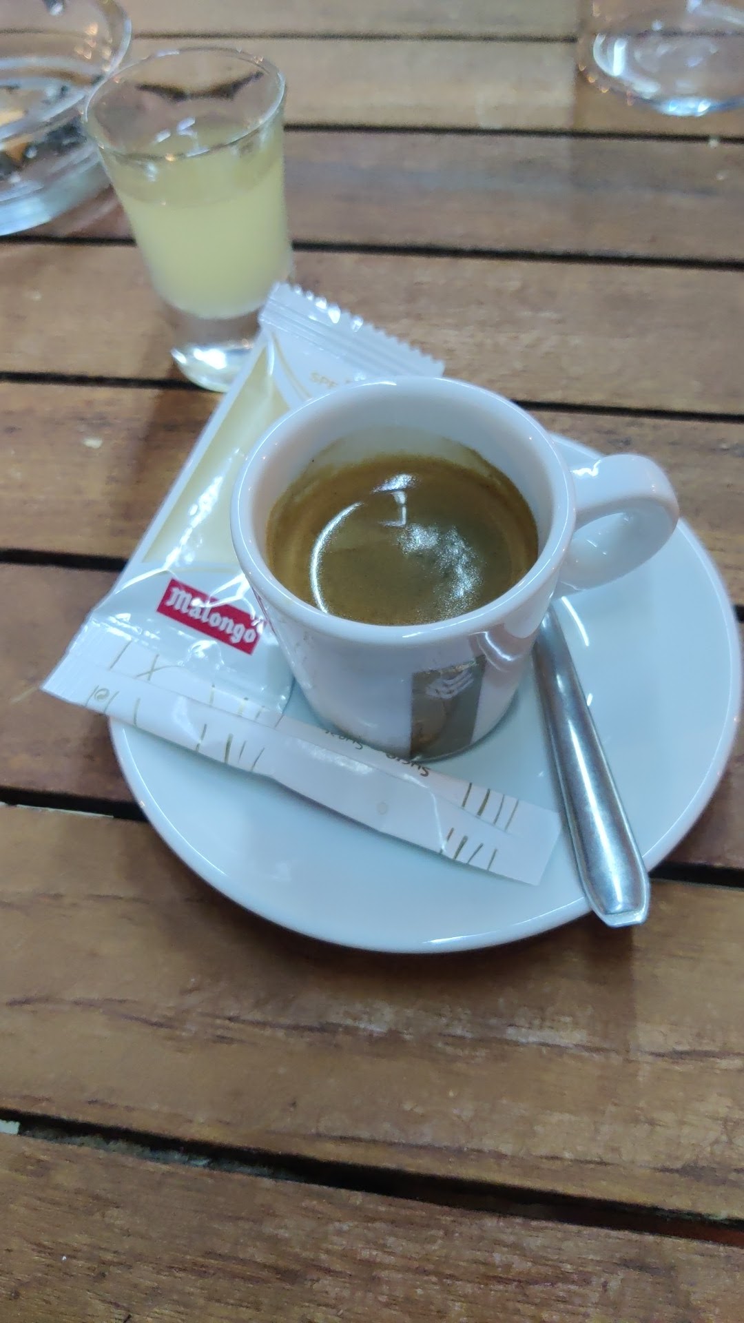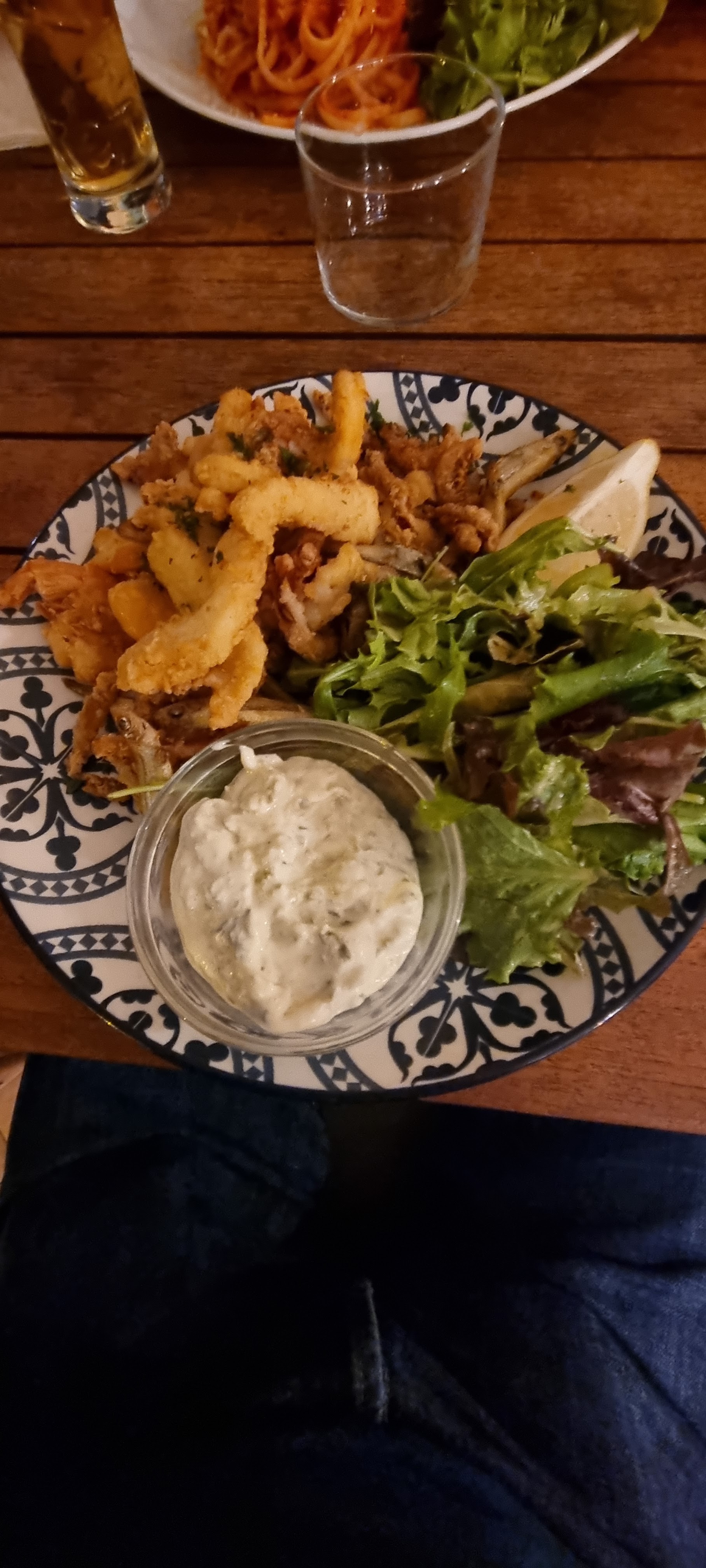 C'est dommage qu'on m'ait servi de la nourriture italienne. Je suis italien et c'était bien en dessous des normes italiennes. J'ai eu un fritto misto (un mélange de fruits de mer frits). Sec comme l'enfer, et avait l'air d'être frit une deuxième fois après un long stockage, des crevettes trop frites et (trop) grosses frites encore avec leur coquille (ce qui serait bien si elles étaient bien plus petites). Commandé un accompagnement de salade : celui-là était caché dans le bol sous les animaux morts déshydratés et très salé : il faut manger à travers le Sahara pour avoir sa salade.