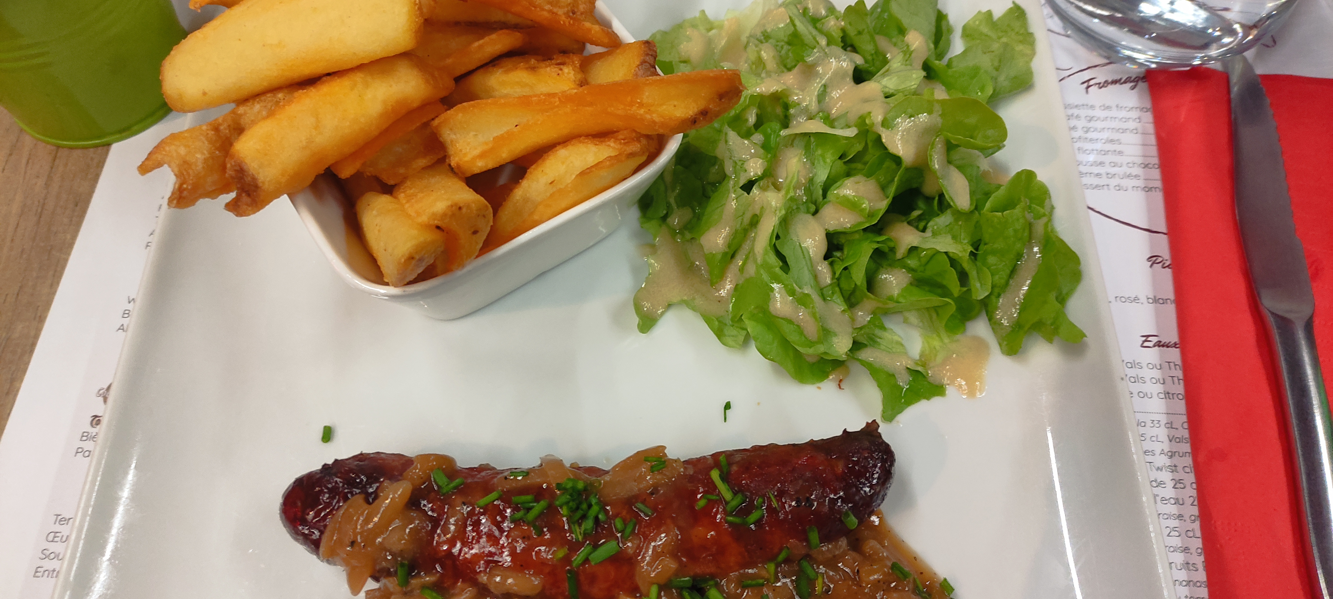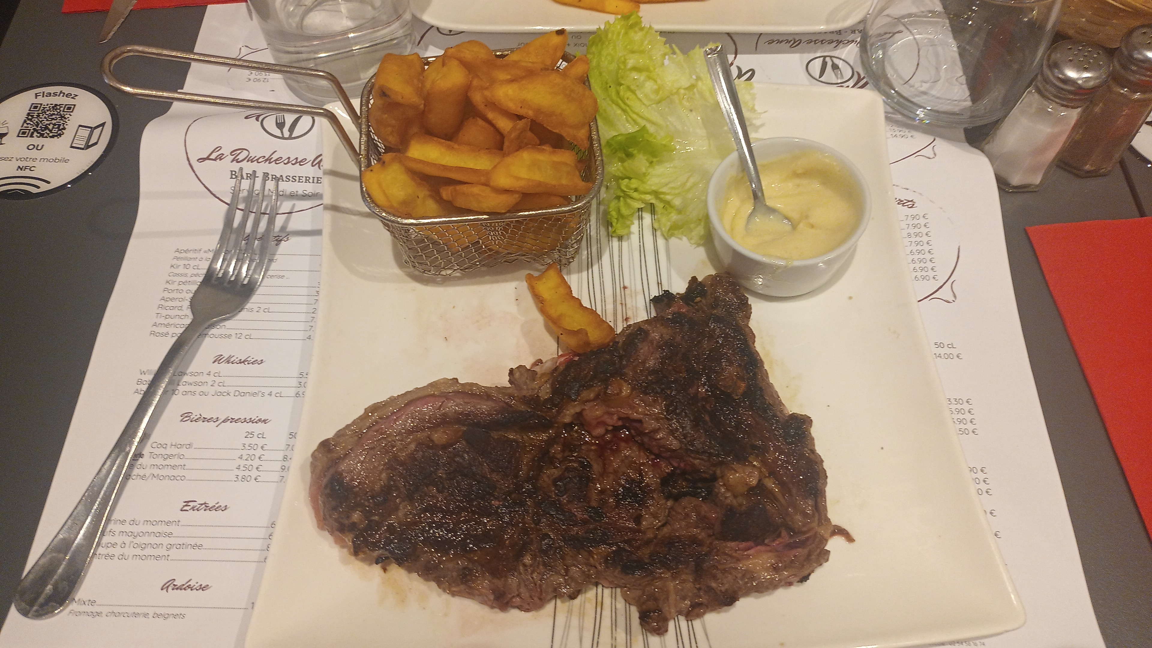 Il est bien situé à côté du château de Blois, mais avec des prix abordables. Nous avons eu un très bon dîner, une saucisse de porc et un steak de cheval, c'était plutôt bon et ils nous ont servi immédiatement sans attendre.