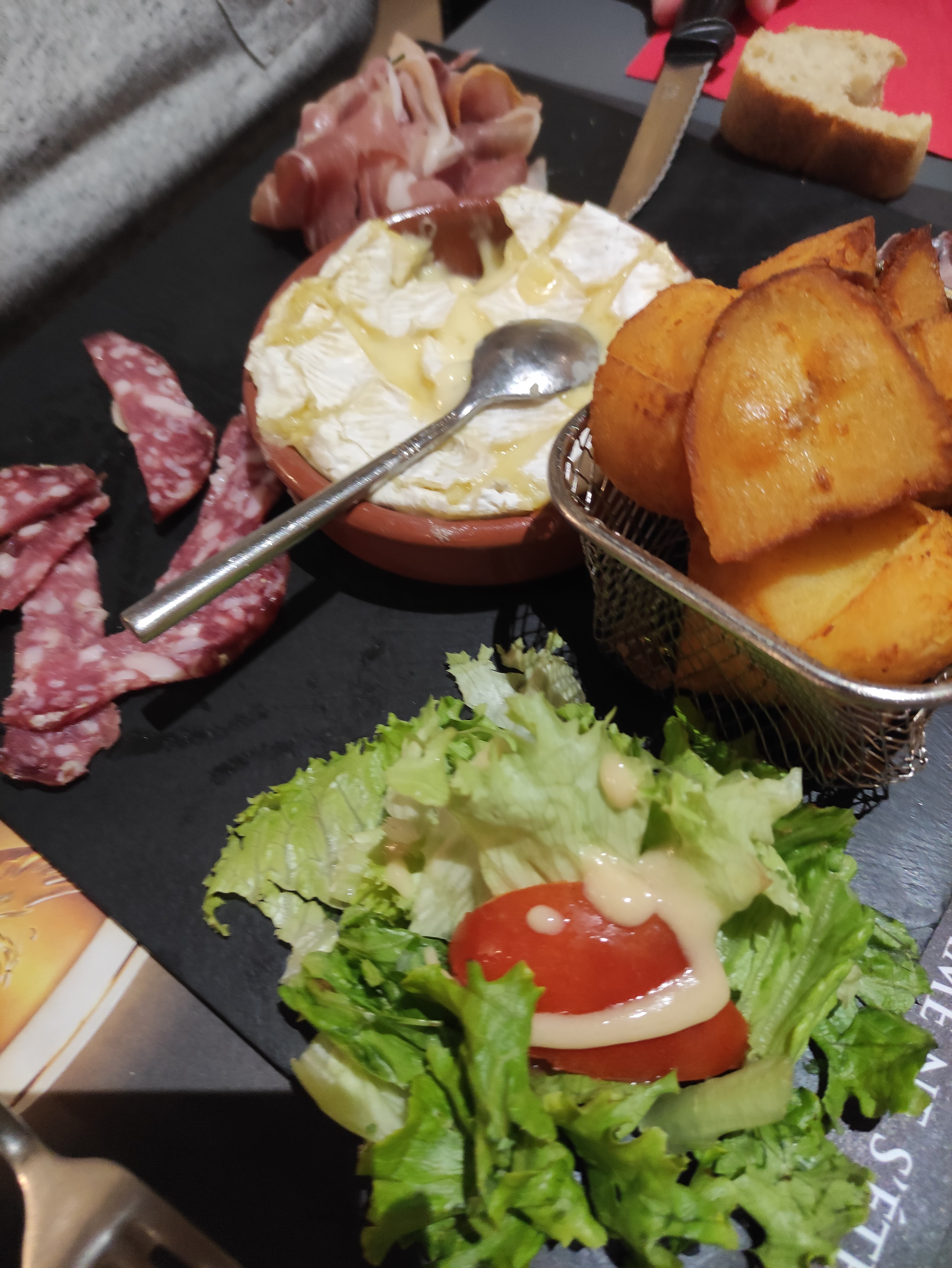 1ere fois dans ce restaurant et déçue. On nous a changé de table 10 minutes après notre arrivée (pas grave), par contre , j'ai dû redemander d'avoir un verre et des couverts , car la table était dressée pour une seule personne , et nous étions 2 ! Un coca cola apporte au lieu d'un coca zéro. On a du réclamer du sel et du pain... J'avais pris une salade camembert. On m'a apporté le fromage et de la charcuterie industrielle (sans goût), mais pas de salade. Je demande donc de la salade . On me dit ah ba oui je peux vous en apporter si vous voulez ! 17,90€ pour ça , je trouve ça très cher. Pour payer , il faut essayer de passer entre les gens assis au bar et ceux à table , c'est le bazar et pas agréable.Désolée mais je ne reviendrais pas