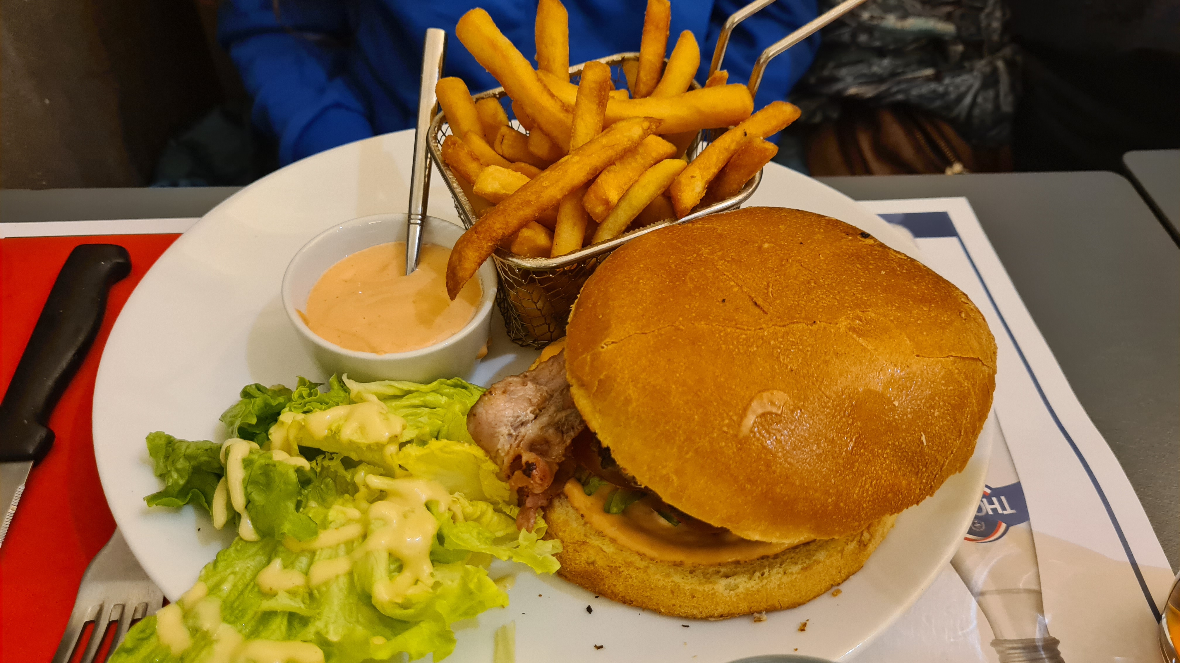 Personnellement, j'ai opté pour le « choix du boucher ». Demandé du moyen mais au final c'était plutôt du côté bien fait. Le personnel était très sympathique et rapide. Cependant, il nous a fallu beaucoup de temps avant de recevoir notre nourriture ou nos boissons. De nombreux bus nous dépassaient et la circulation était très bruyante.