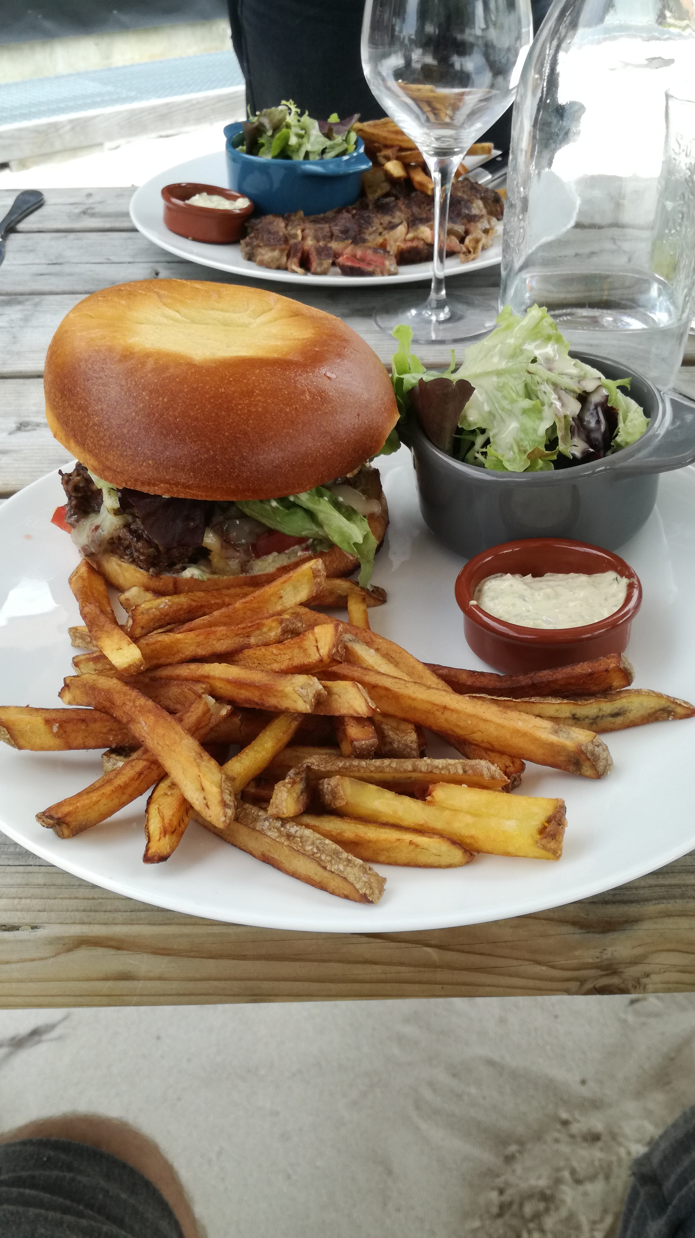 Concept très sympa : service soi même, chacun débarrasse sa table. Hyper convivial, pied dans le sable au soleil, personnel super cool. L’ambiance est très à la cool et on adore ce concept, ça change des resto traditionnels et c’est validé pour moi. Niveau nourriture on a pris une entrecôte et un burger, rien à redire c’est top.